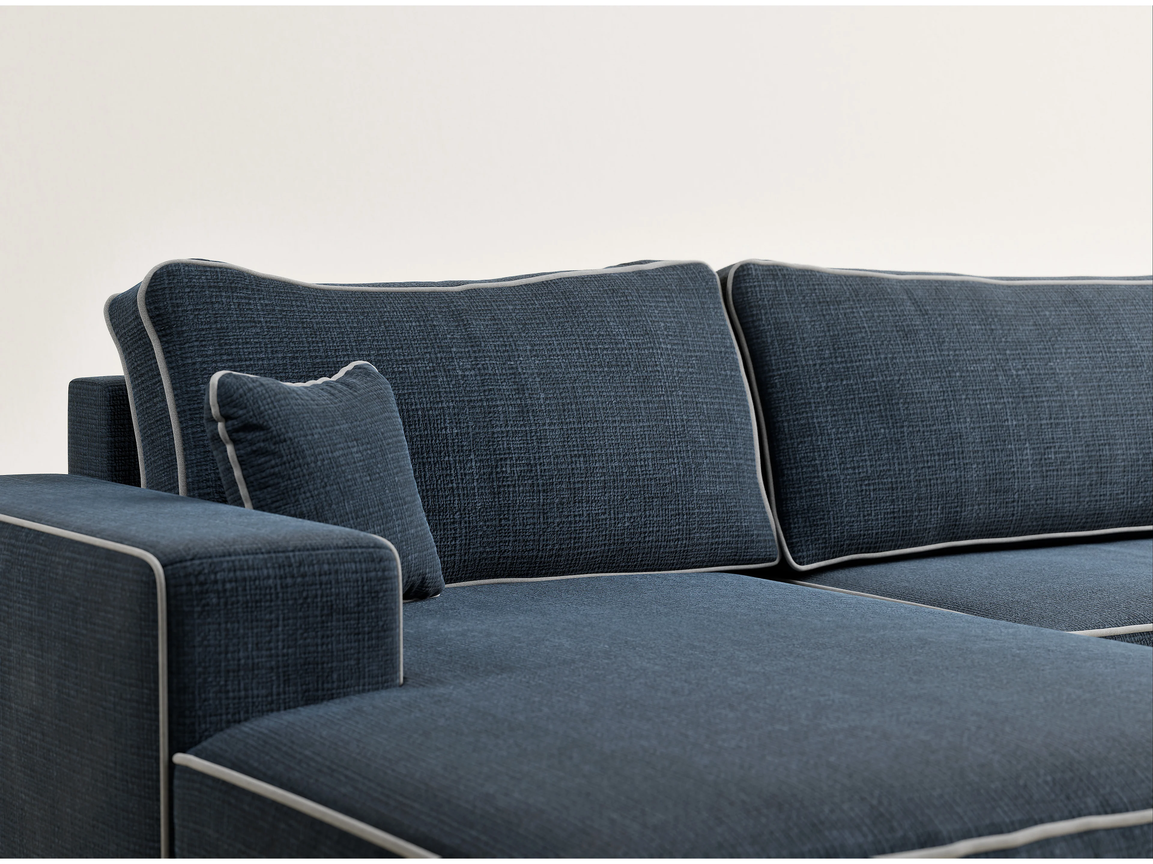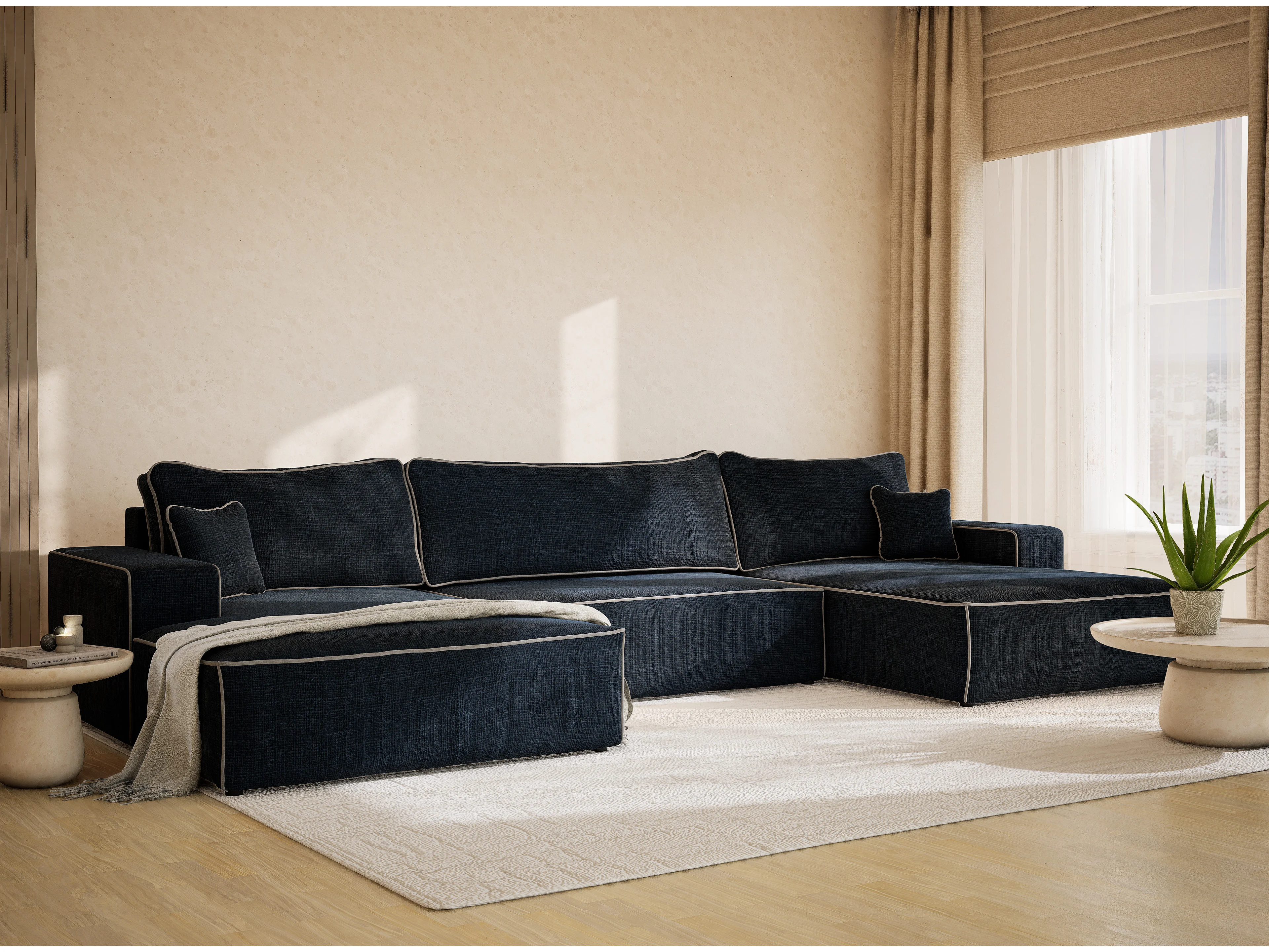 Canapé d'angle panoramique convertible en tissu chenille bleu foncé-gris DESEO