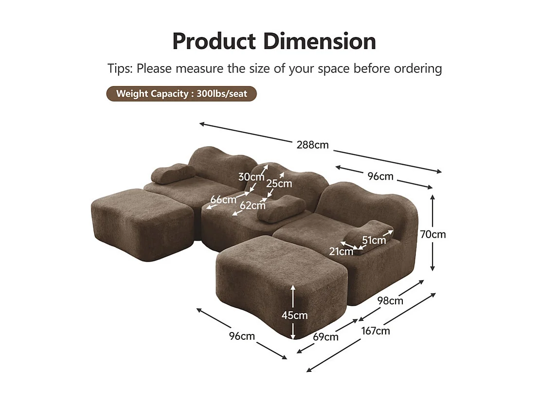 Canapé d'angle panoramique en velours, avec 2 pouf et coussin d'accoudoir, 288x167x70cm, Marron