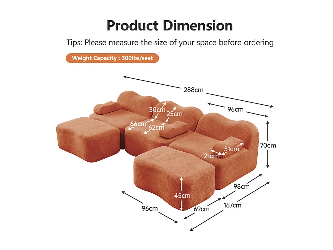 Canapé d'angle panoramique en velours, avec 2 pouf et coussin d'accoudoir, 288x167x70cm, Orange