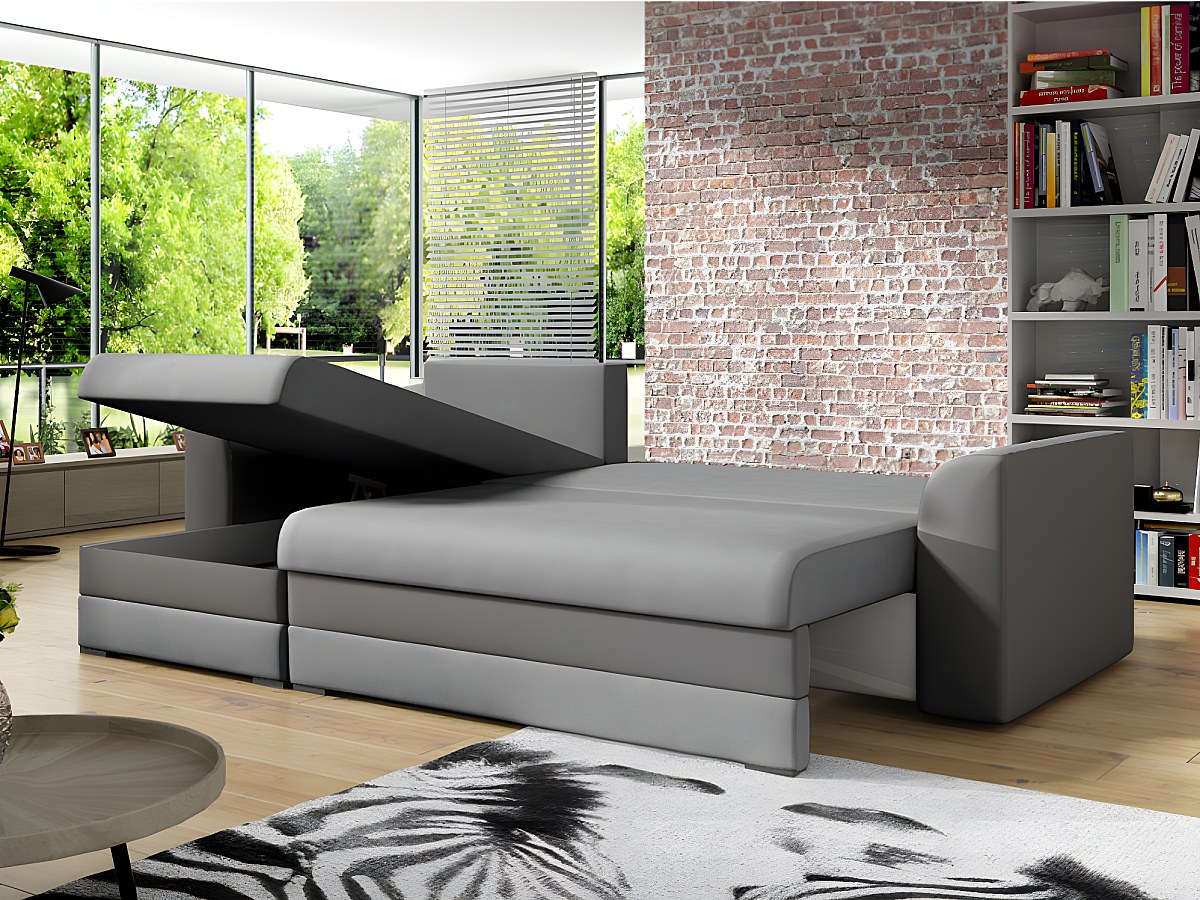 Canapé d'angle réversible et convertible GIANY en tissu et simili- Gris clair avec bandes anthracites