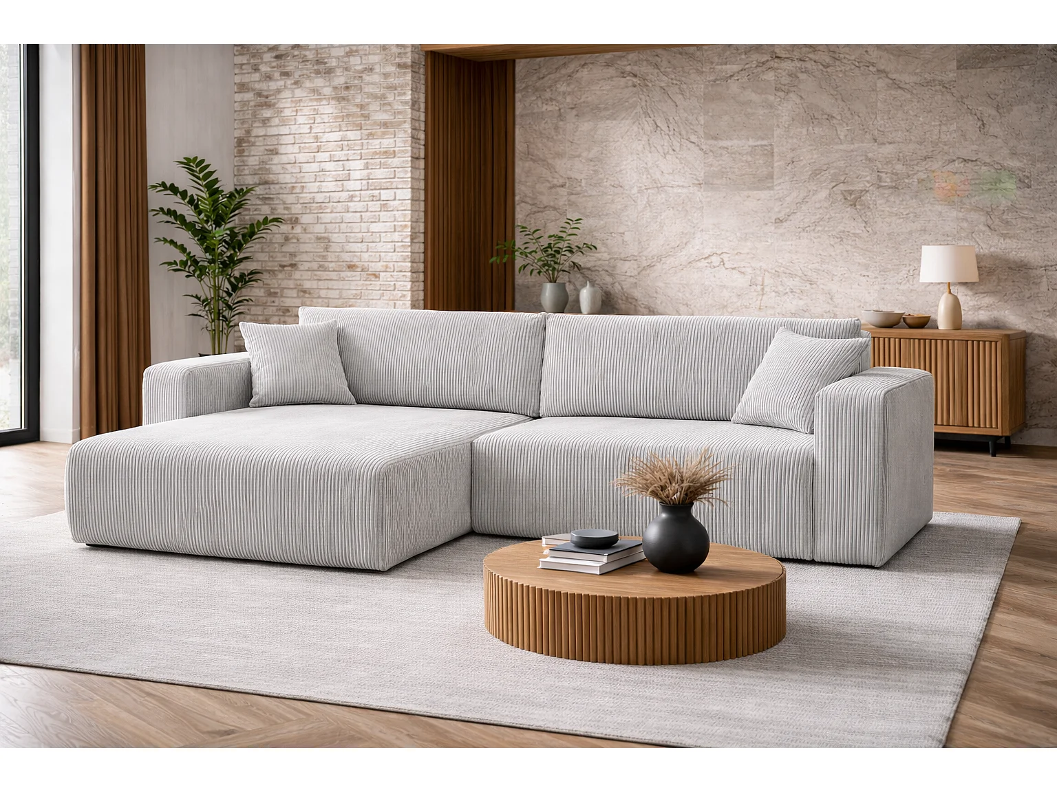 Canapé d’angle réversible FLORA L convertible – Velours côtelé gris clair, fonction couchage, grand coffre de rangement, angle universel gauche/droite