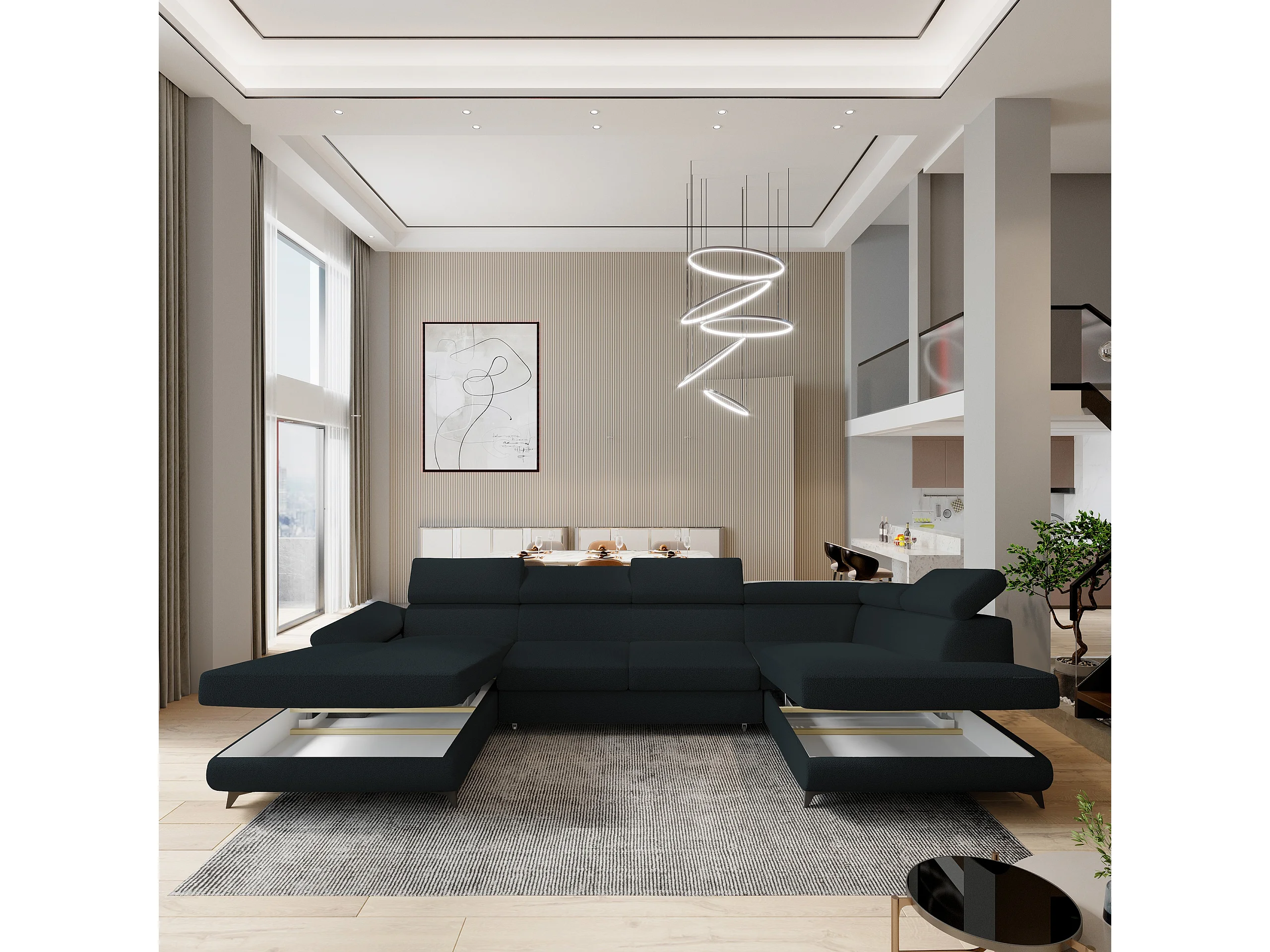 Canapé D'angle Rubano Noir En Bouclé Avec Fonction De Couchage