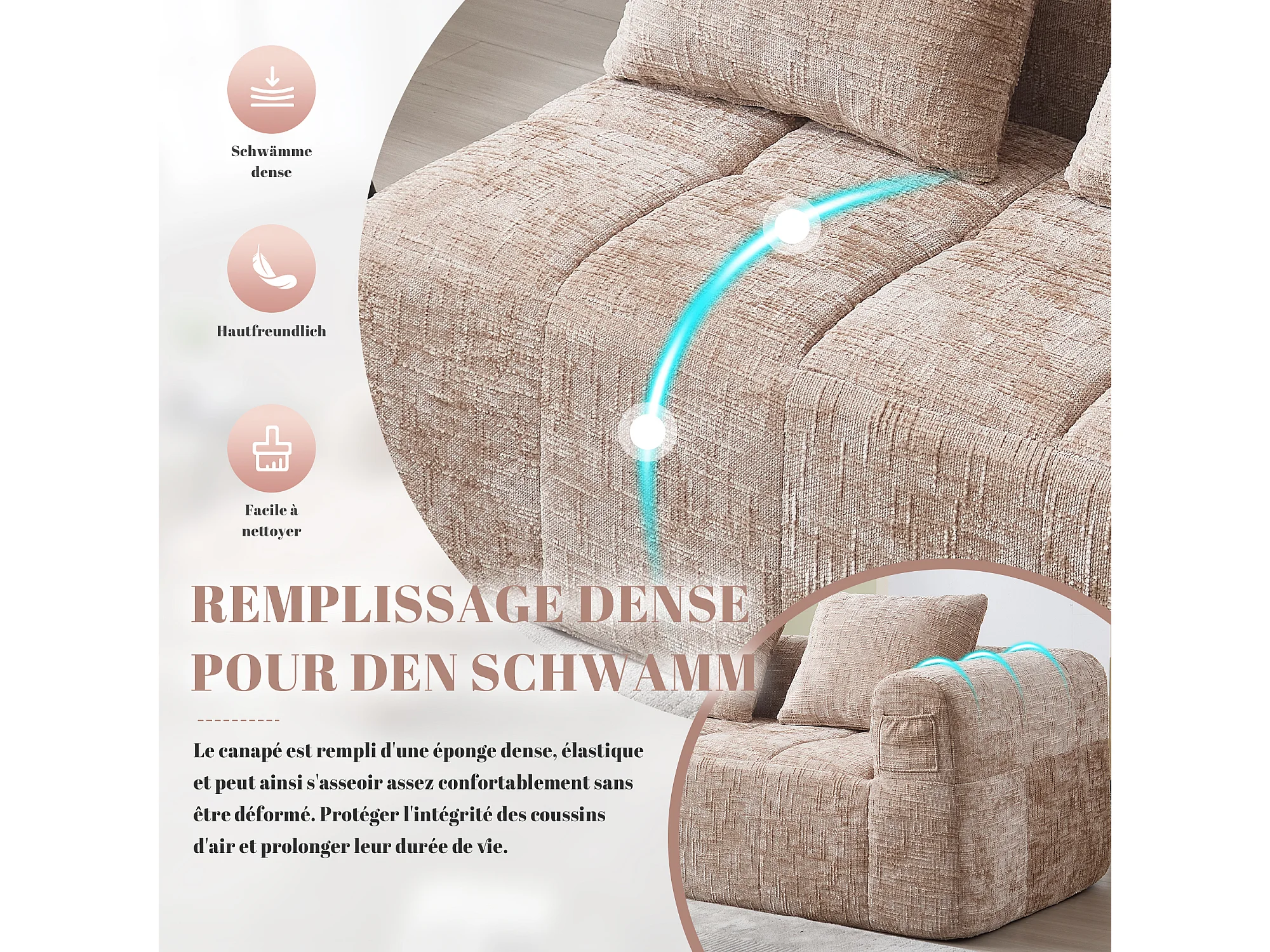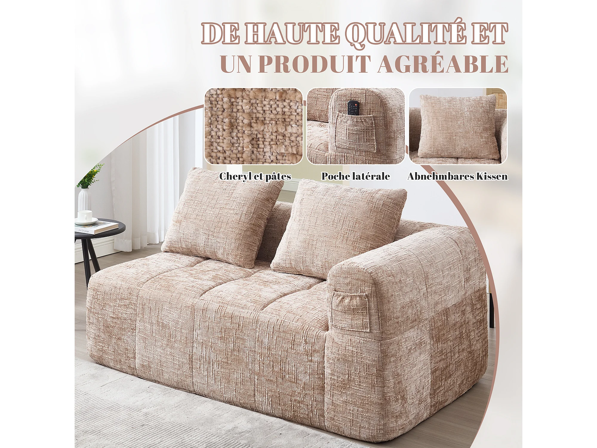 Canapé d'angle 2 places en chenille - module d'angle - avec poche de rangement latérale - Taupe - Parfait pour Salon et Studio
