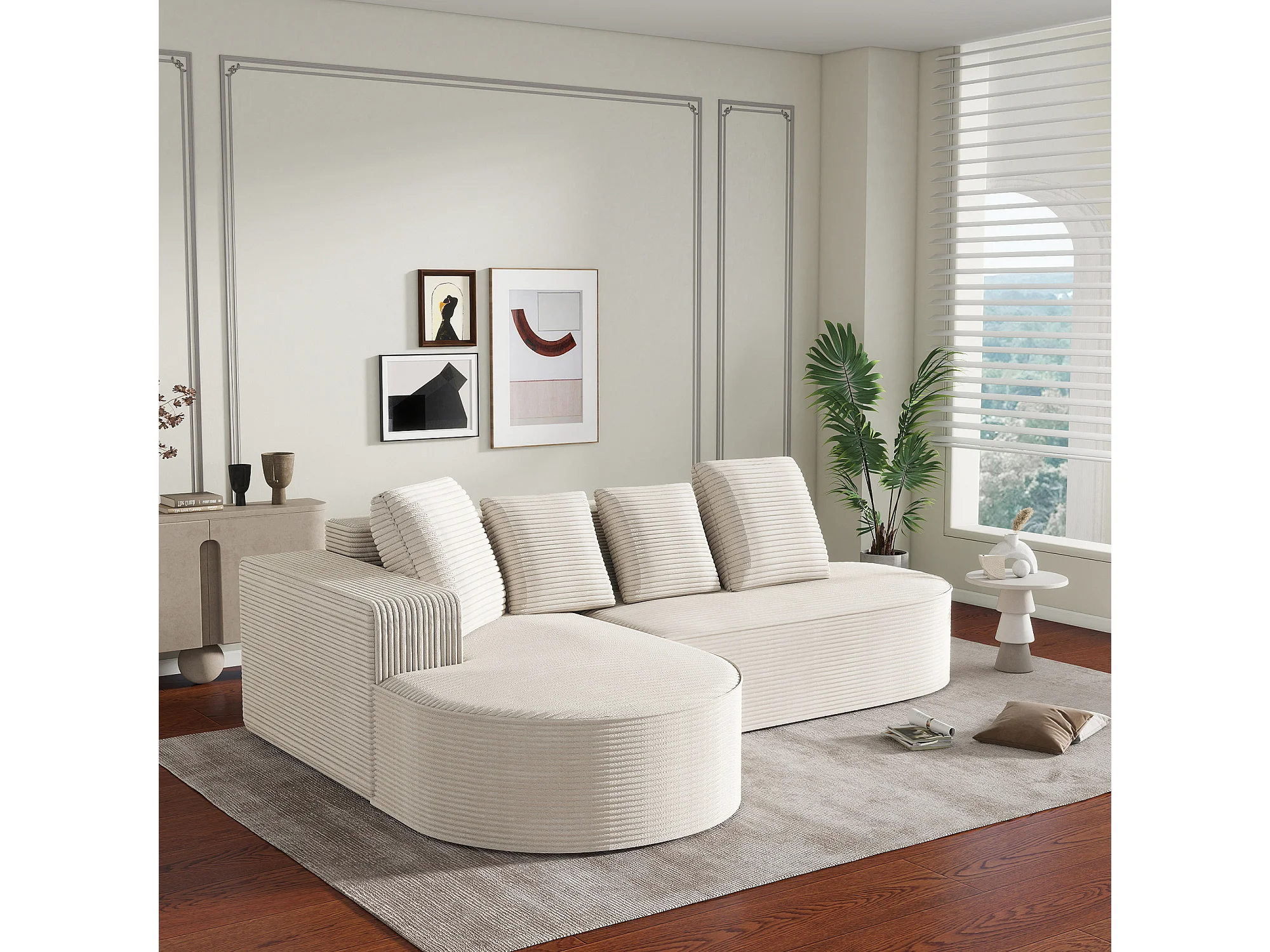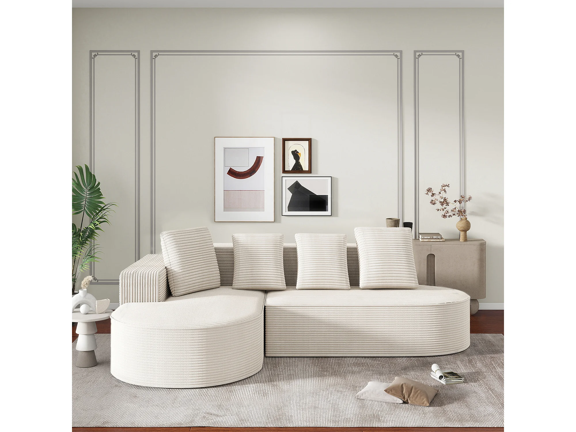 canapé d'angle 3 places avec 4 coussins- Méridiennes en L - Velours côtelé blanc - Sans montage