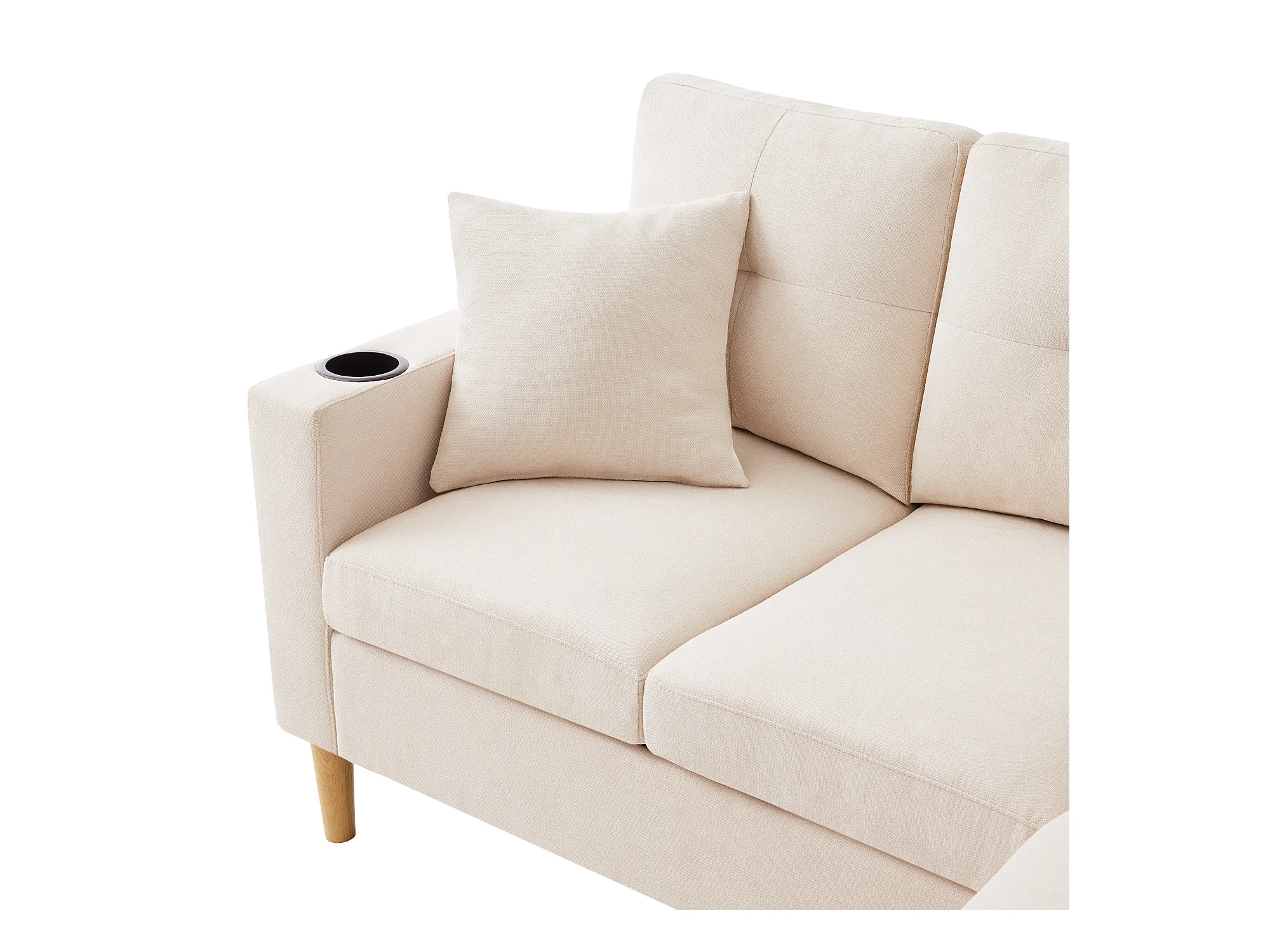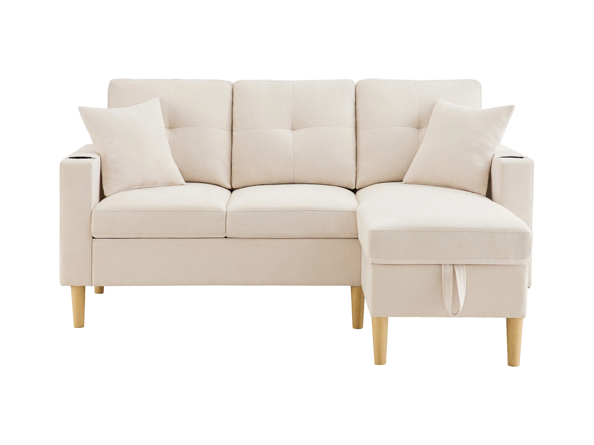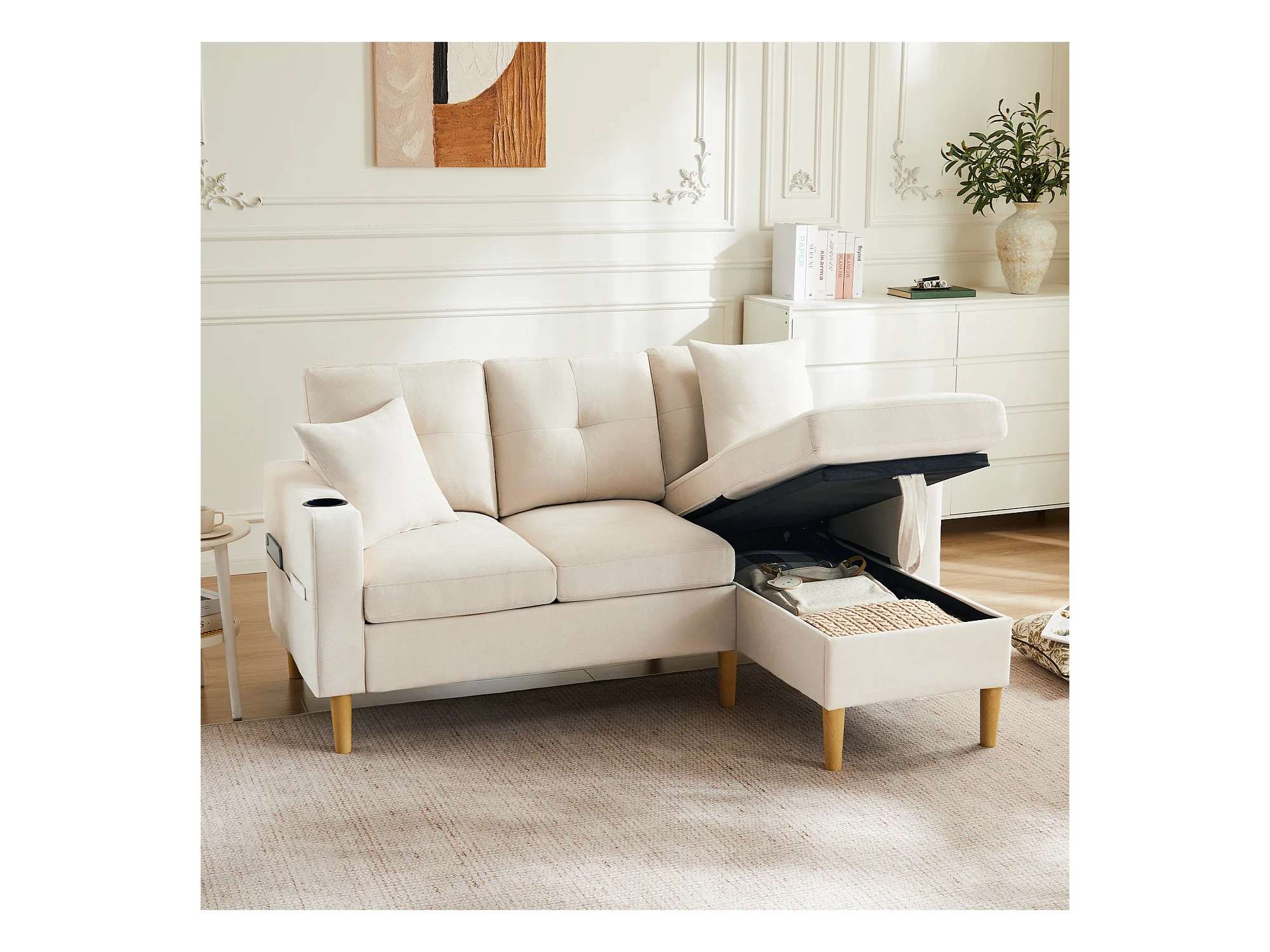 Canapé d'angle 3 places avec coffre de rangement, coussins et porte-gobelets - coton et lin beige