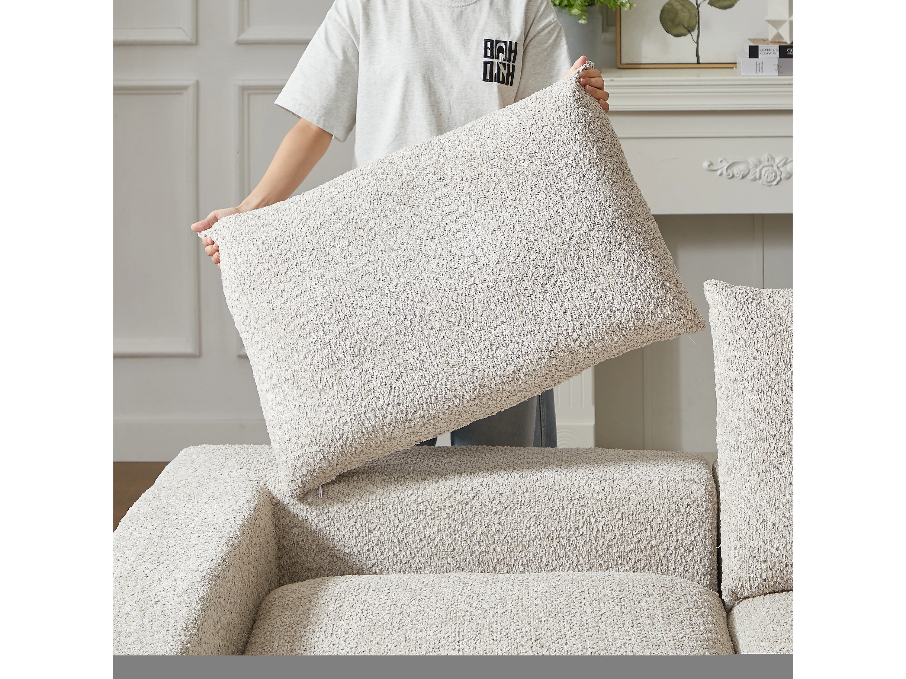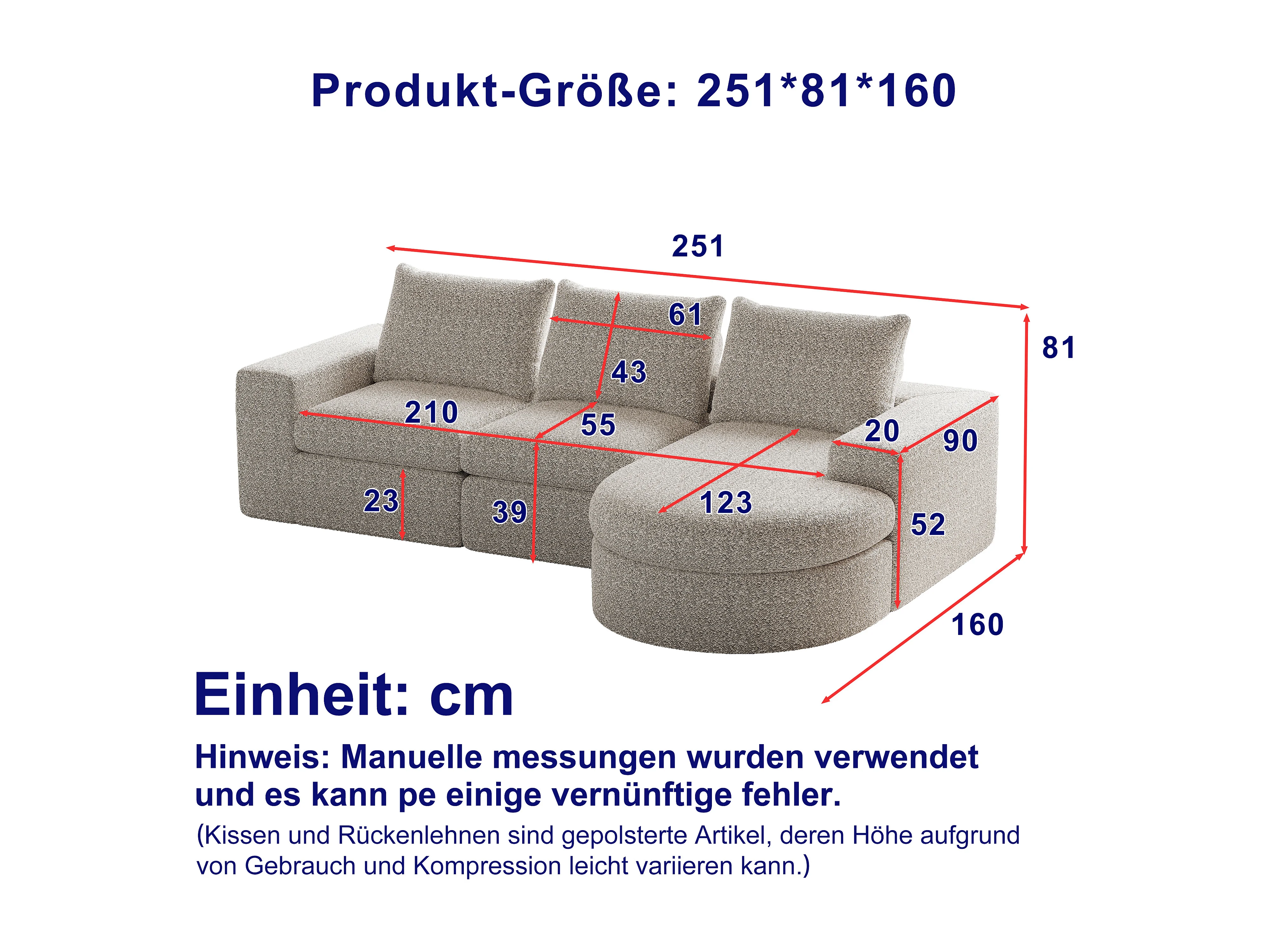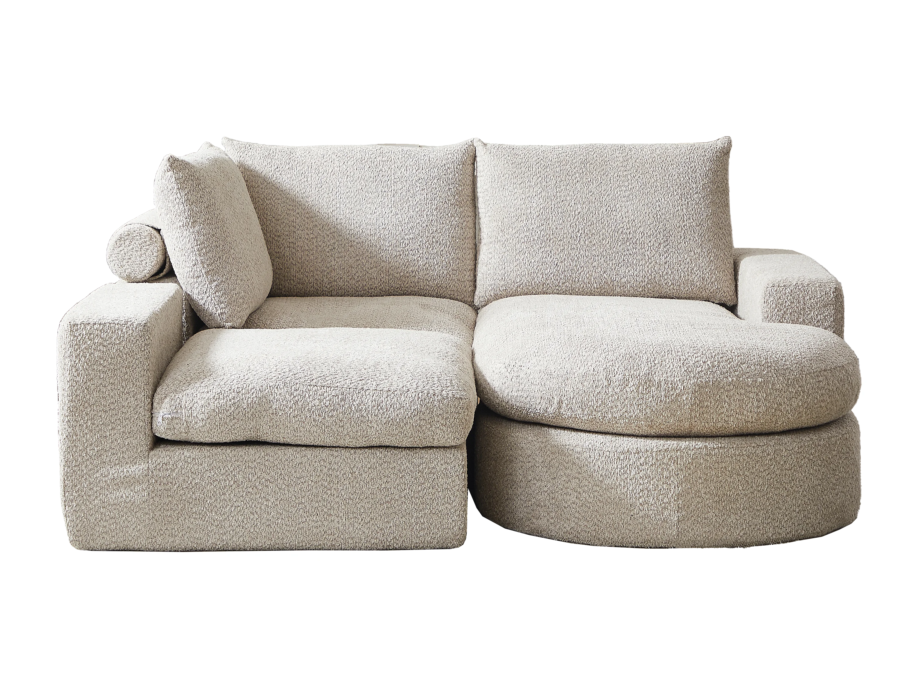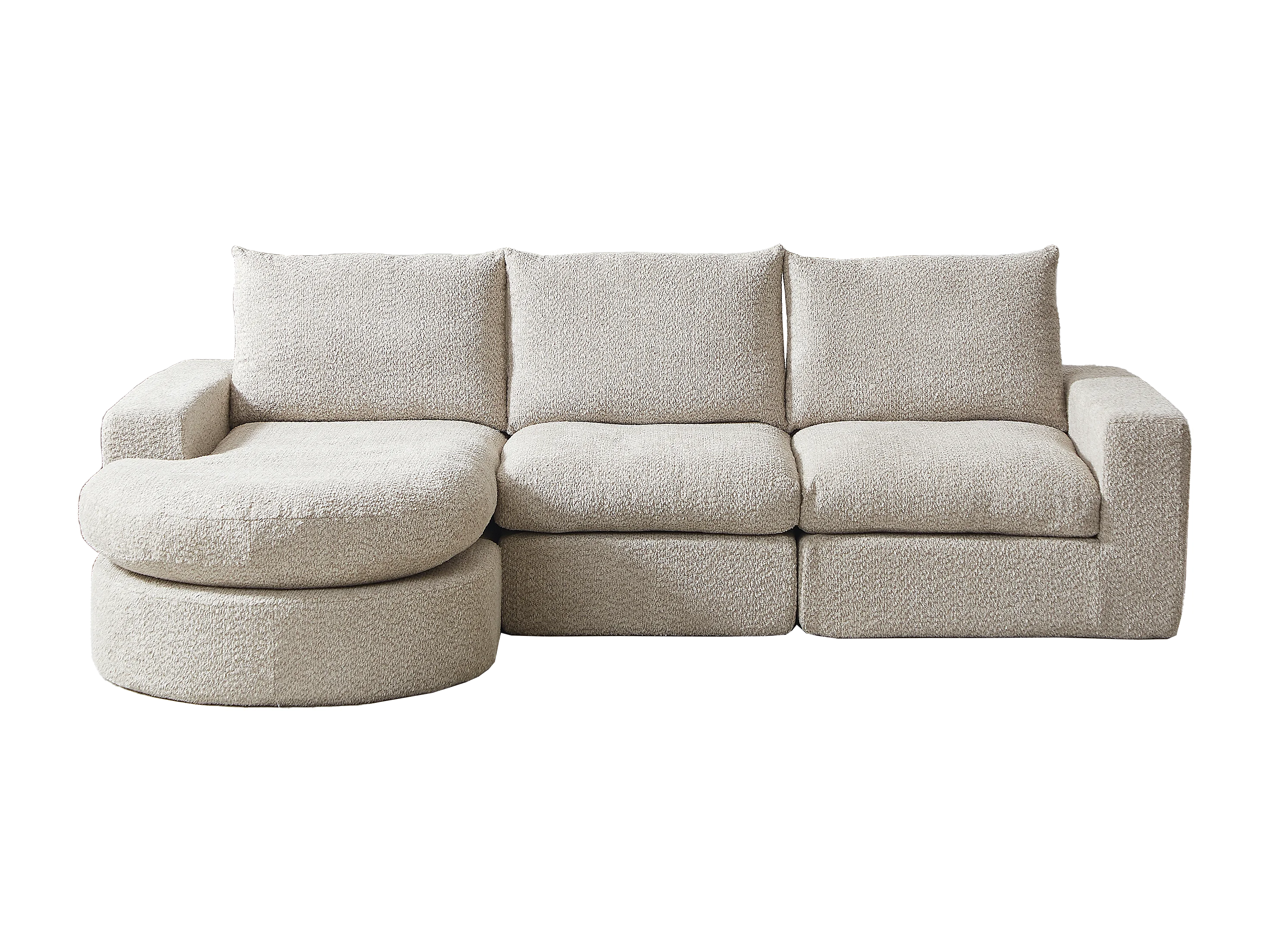 Canapé d'angle 3 places avec méridienne et 3 coussins - Tissu chenille beige