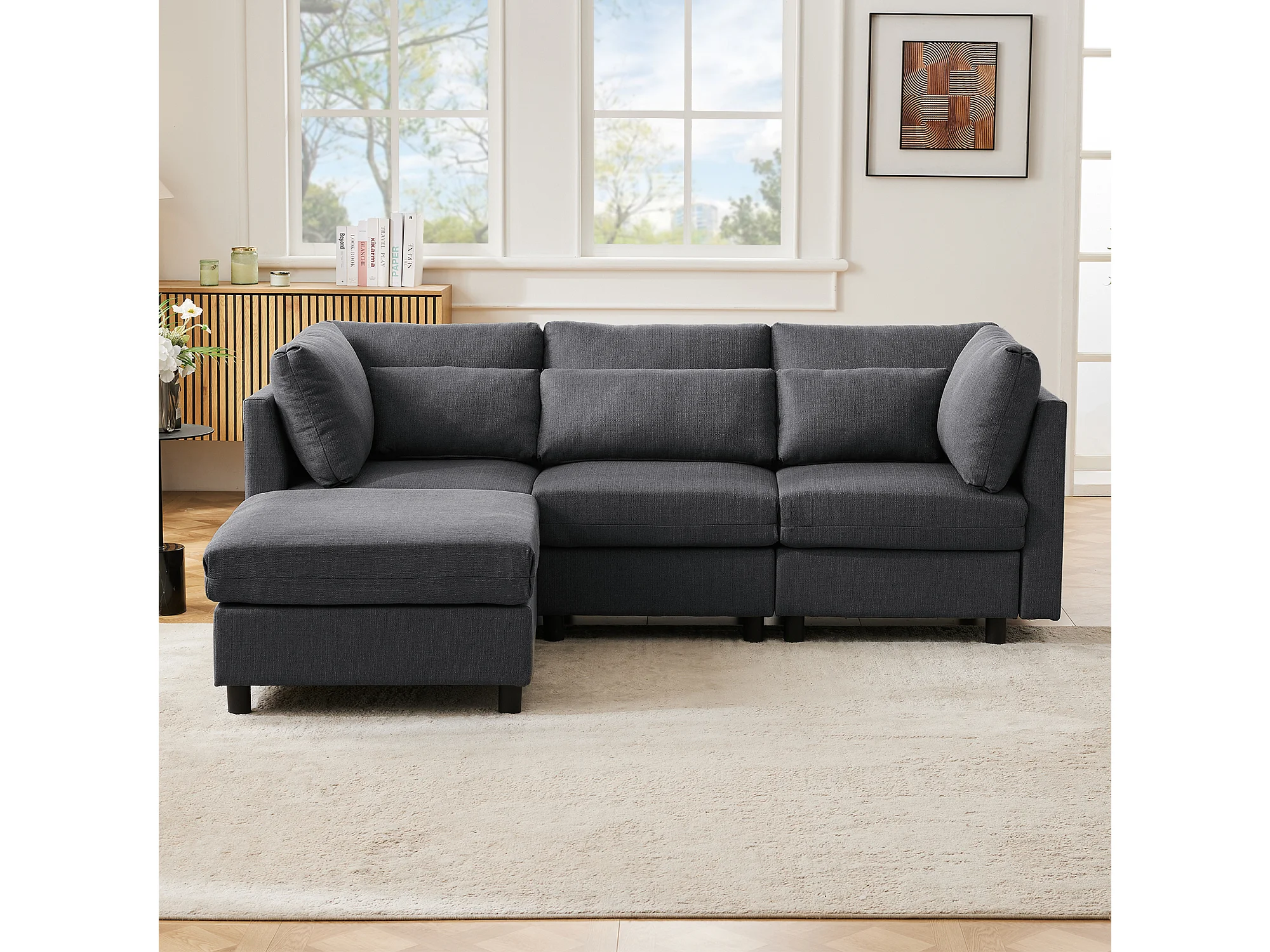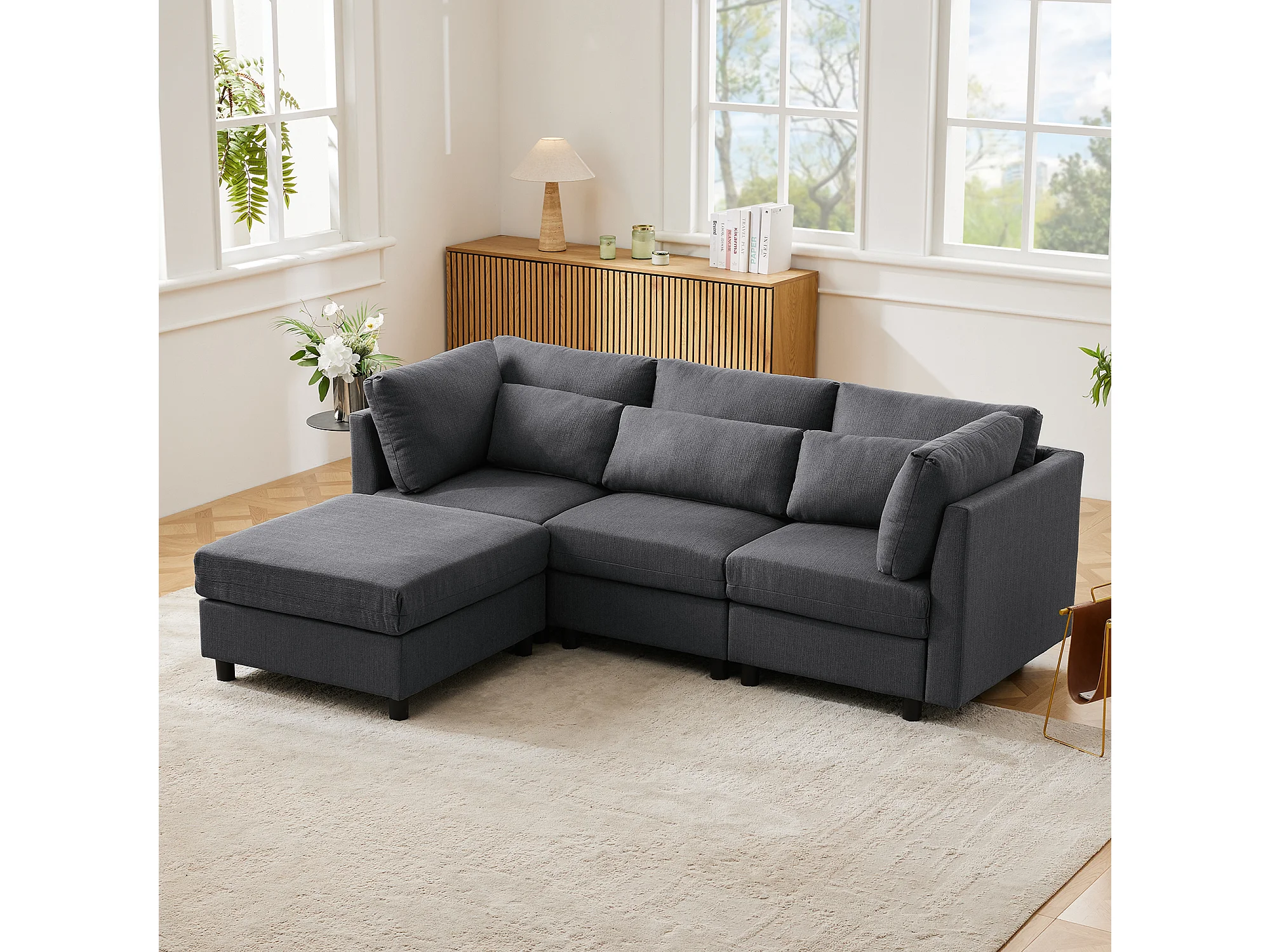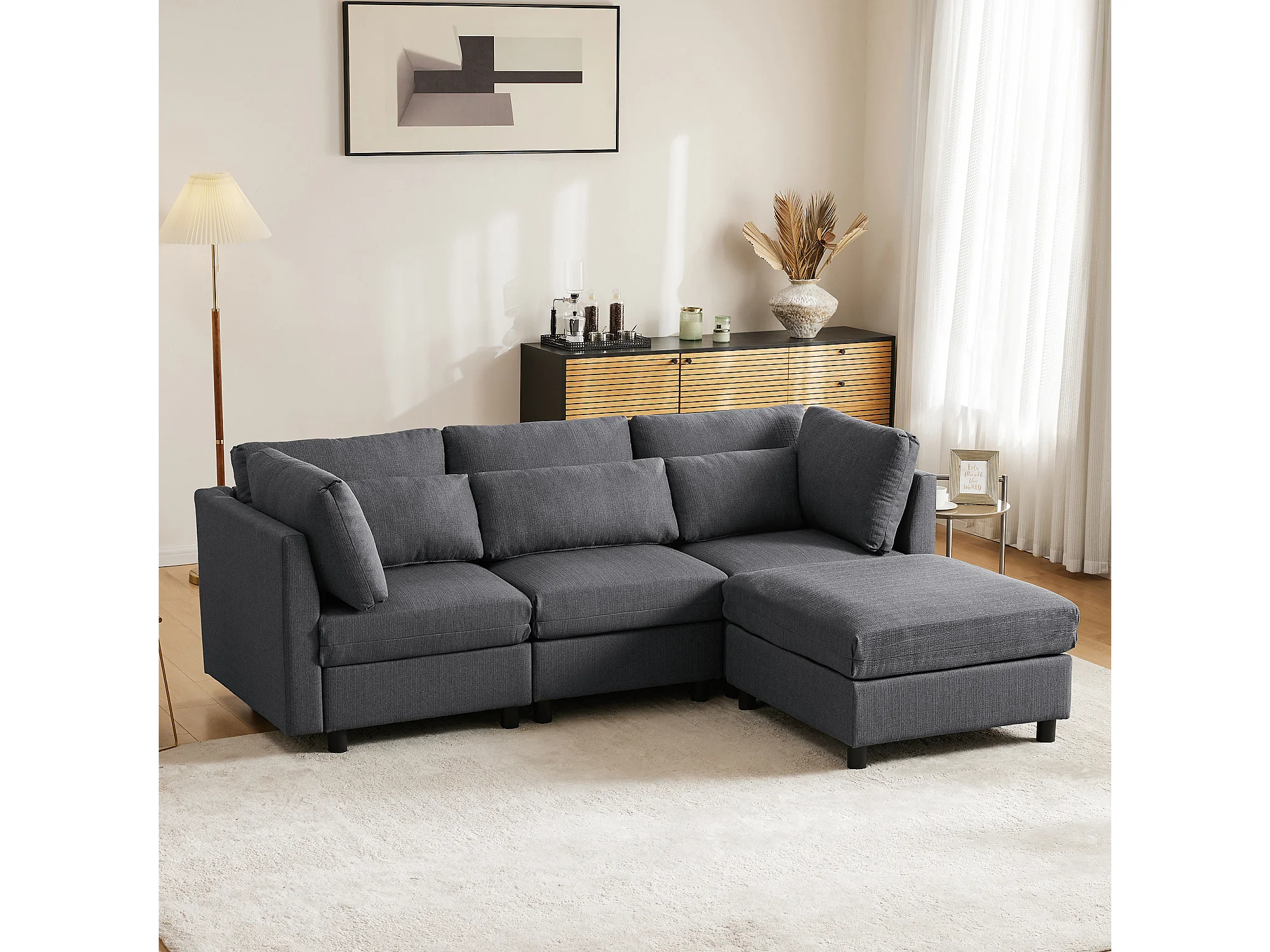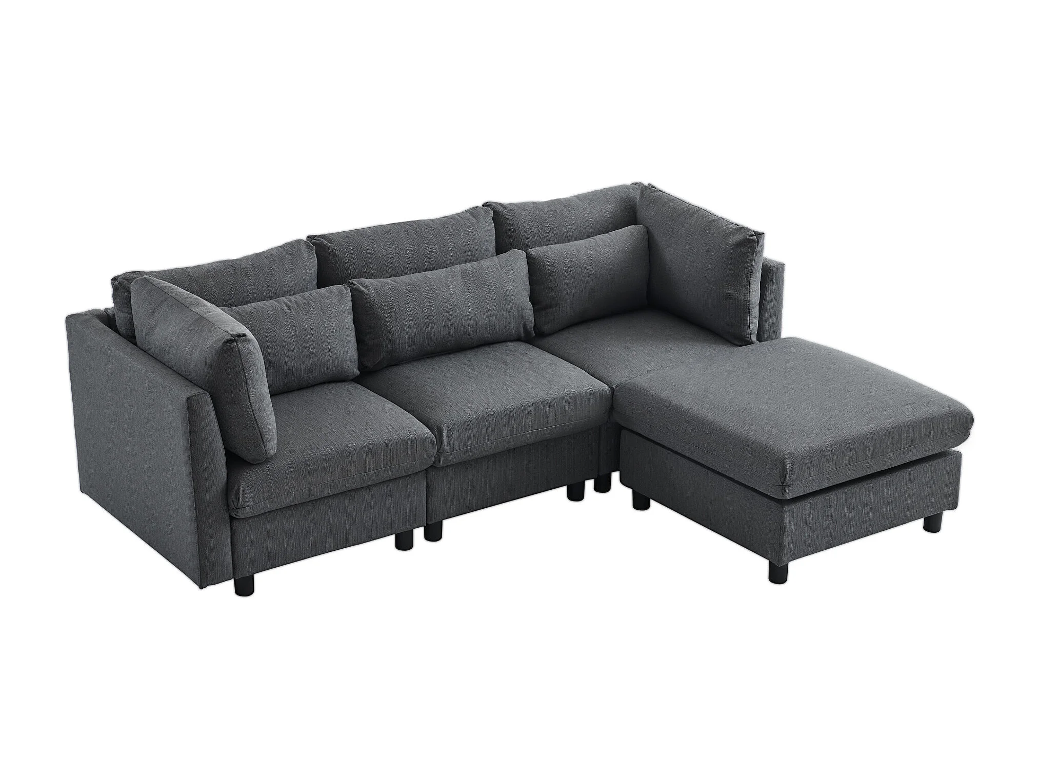 Canapé d'angle 220x83x81 cm avec pouf 74x74x45 cm, dossier haut, coussins inclus, lin gris