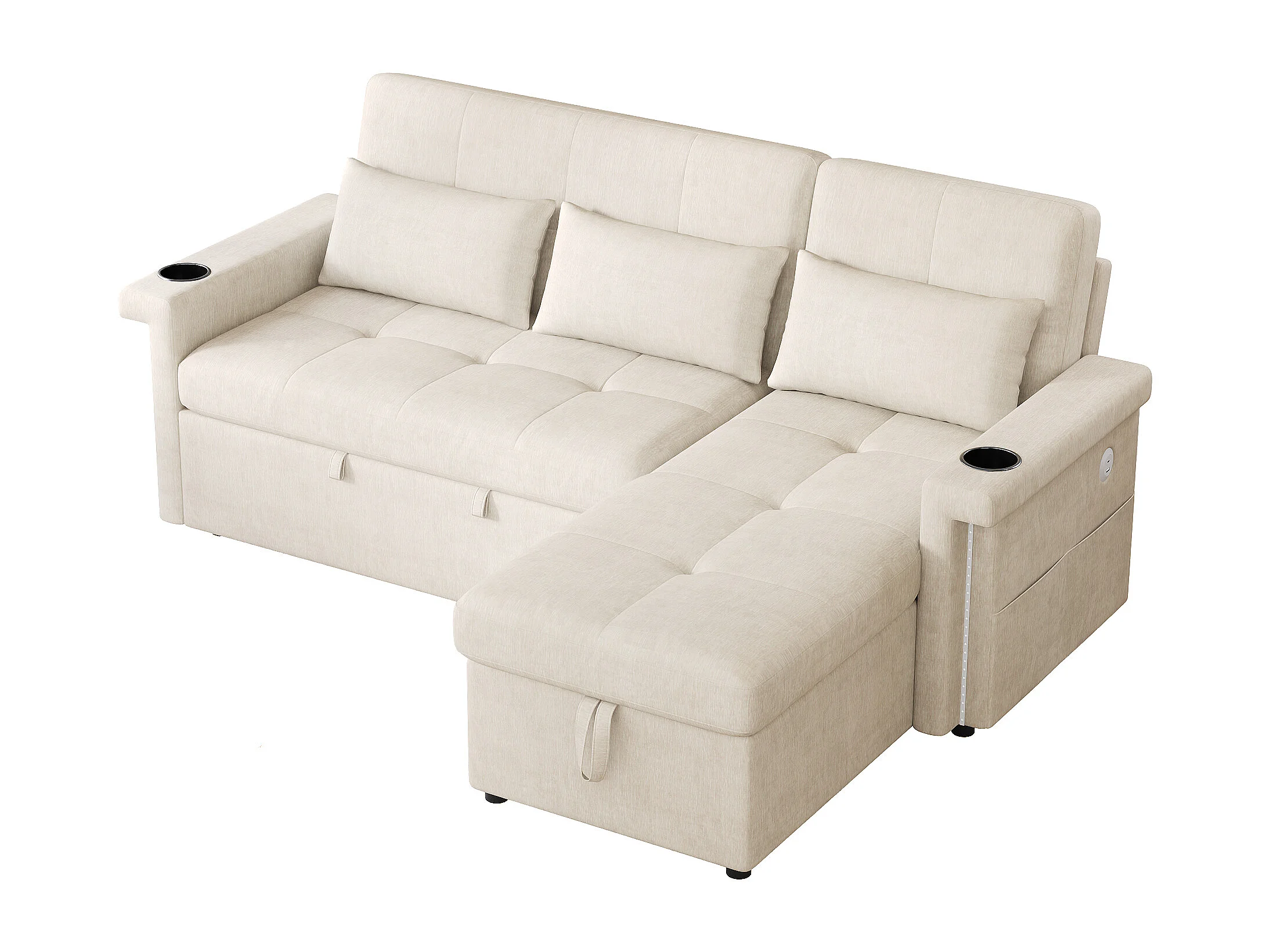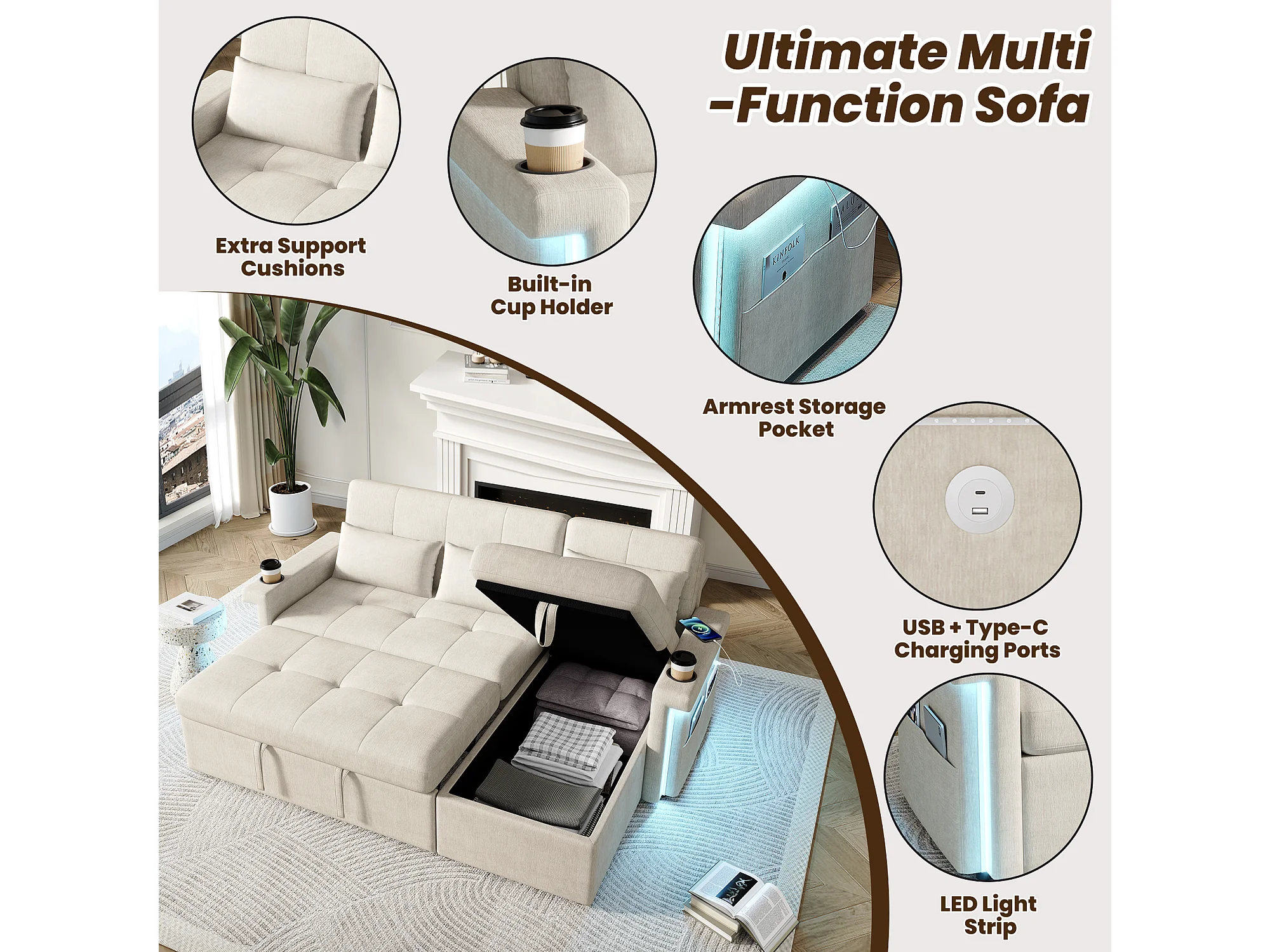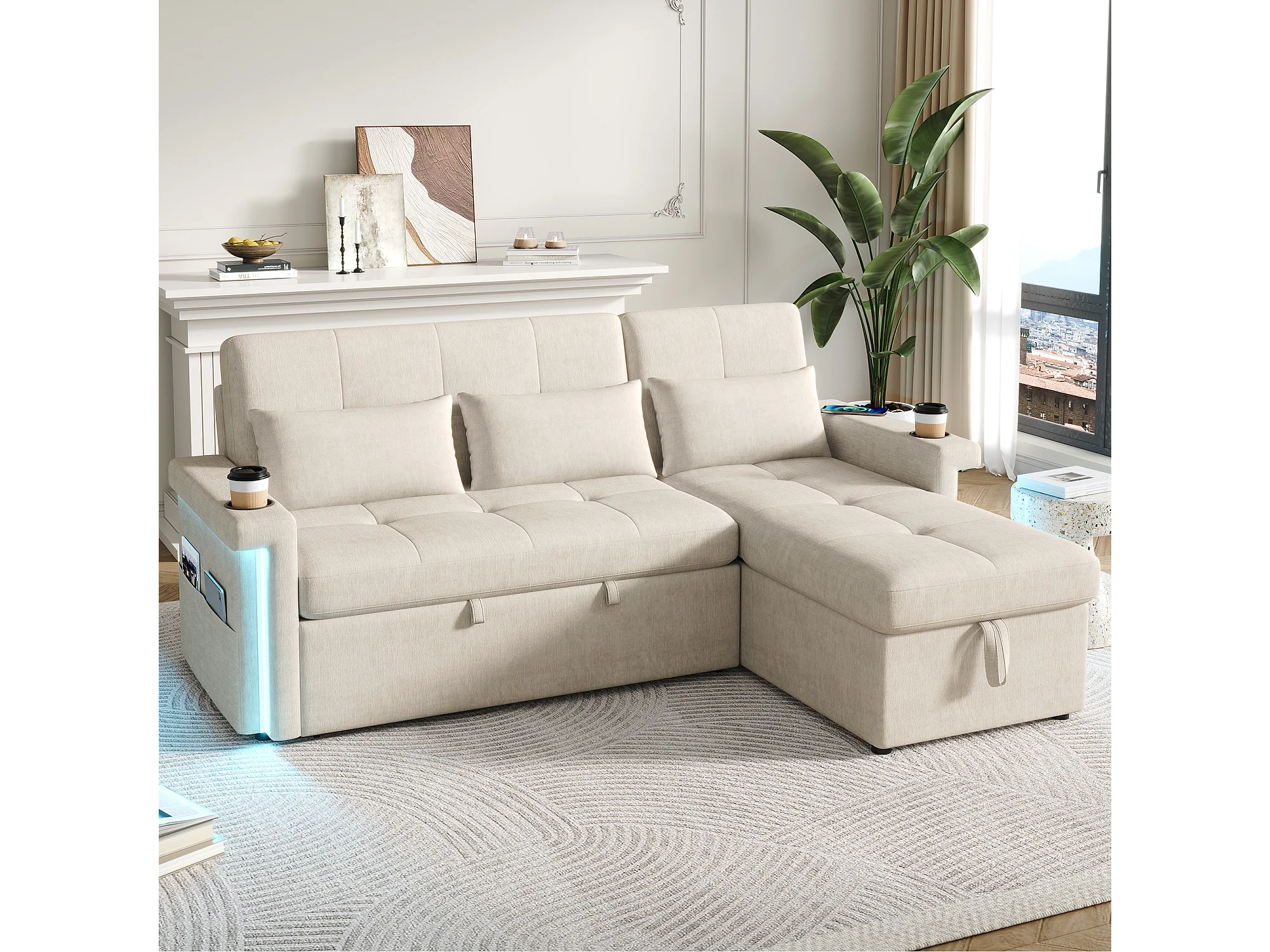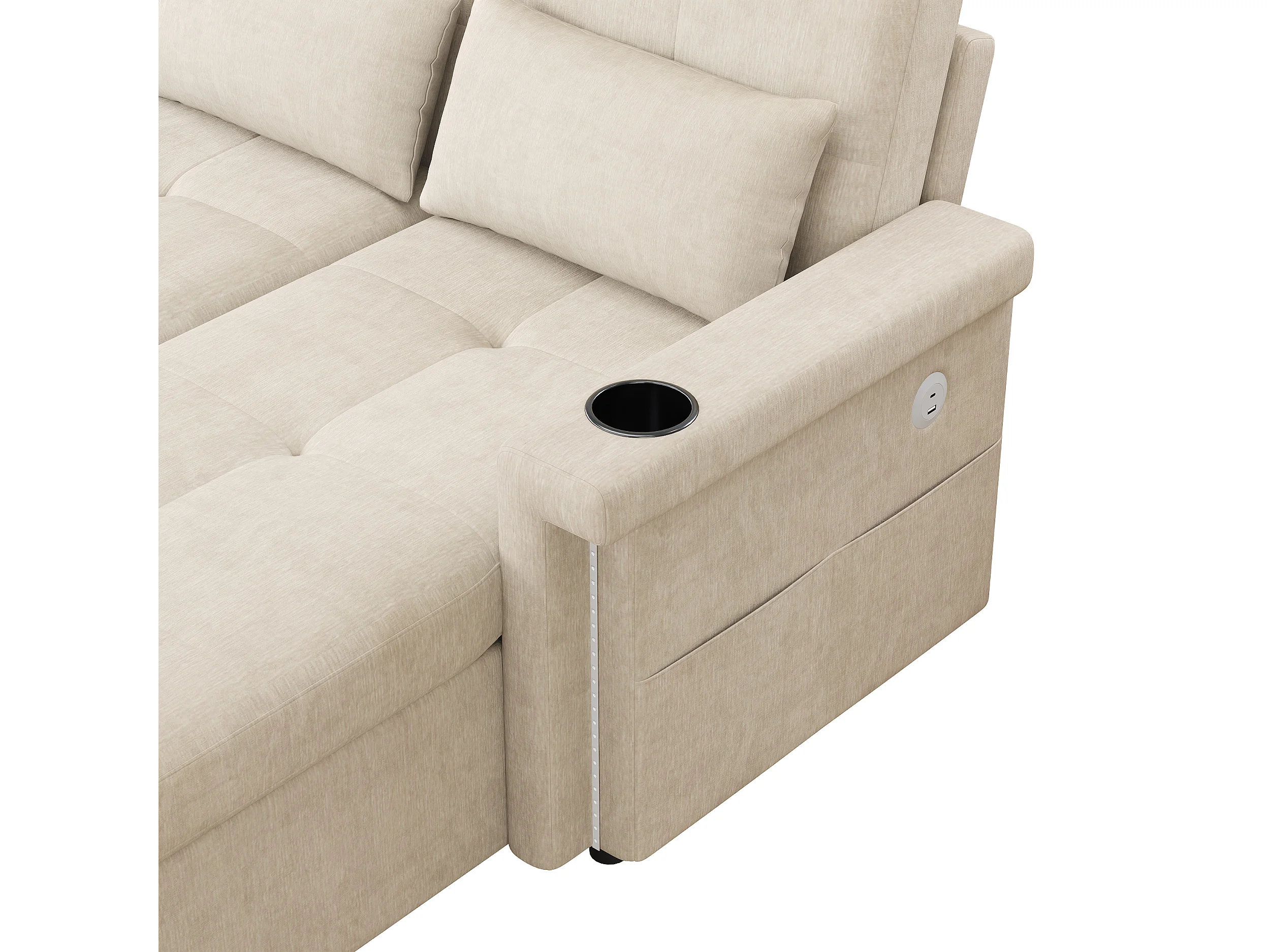Canapé d'angle 3 places - convertible en lit - avec éclairage LED + USB - dossier réglable avec coussins - Chenil - beige