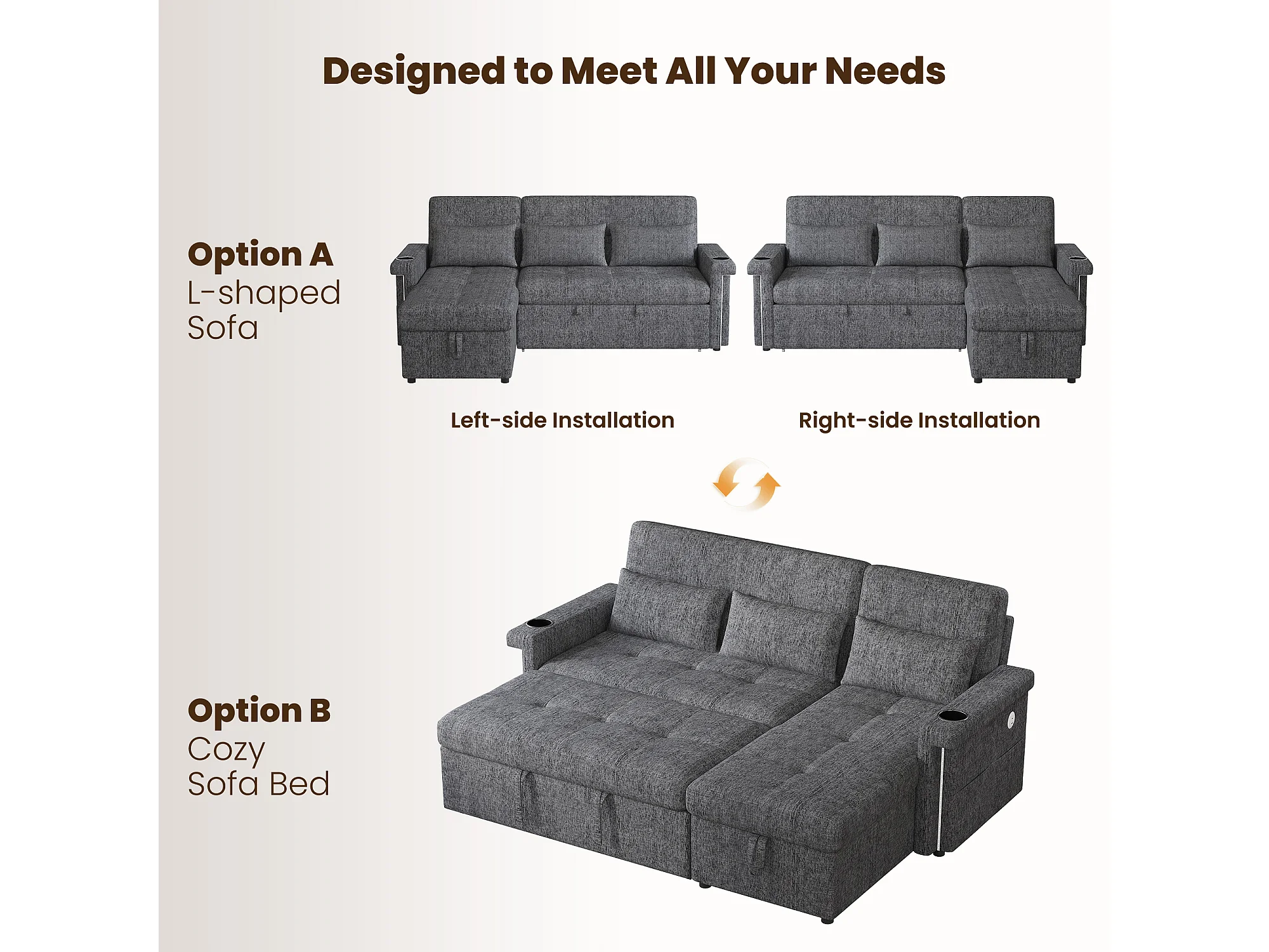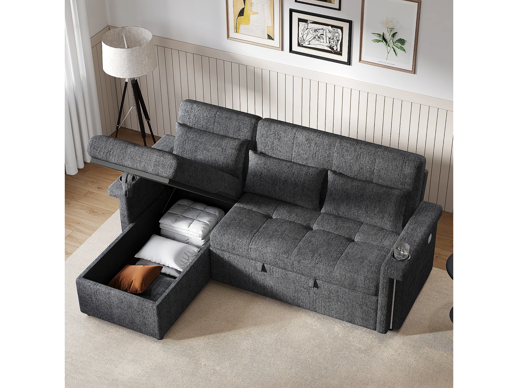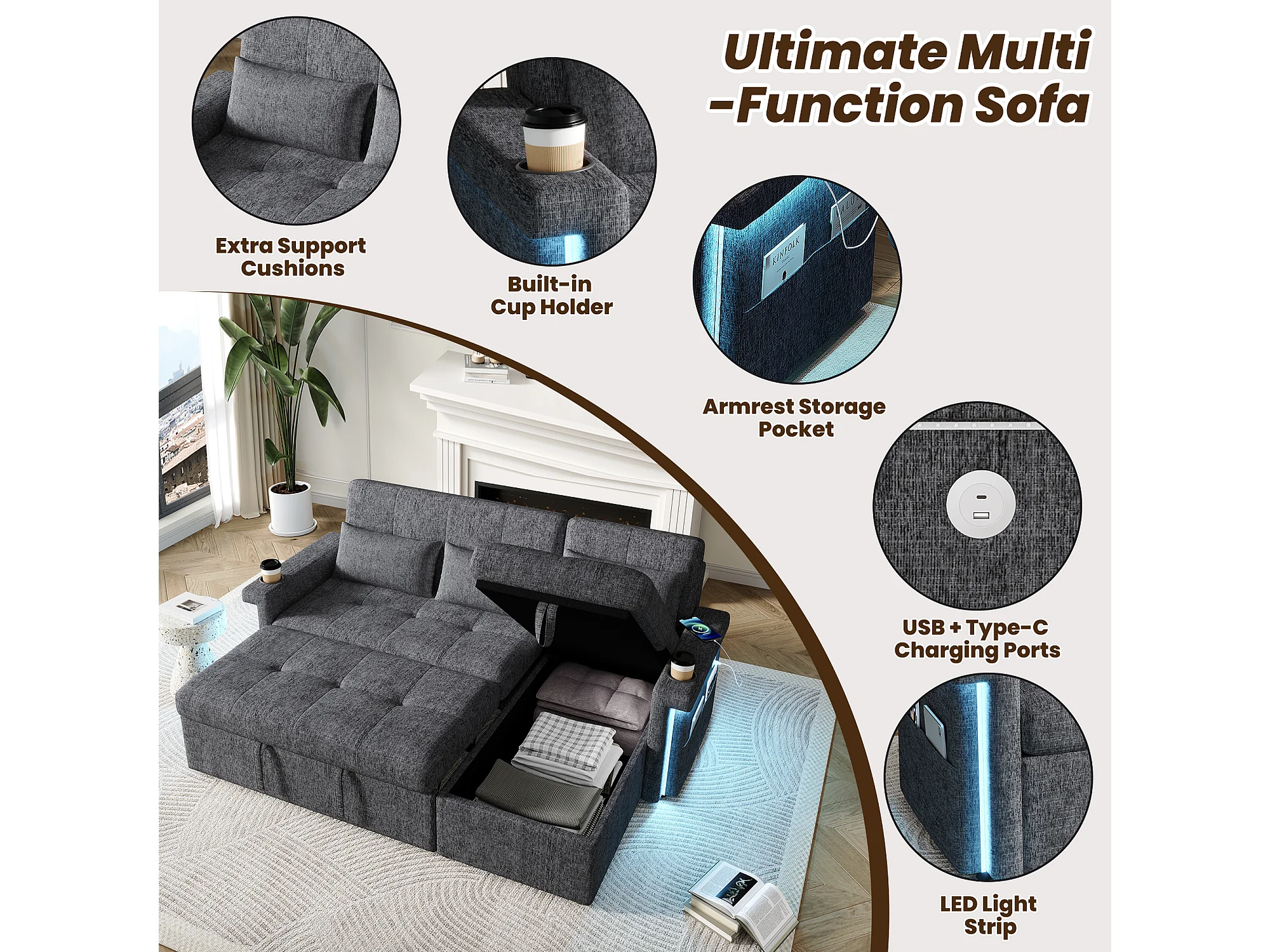 Canapé d'angle 3 places - convertible en lit - avec éclairage LED + USB - dossier réglable avec coussins - Chenil - gris