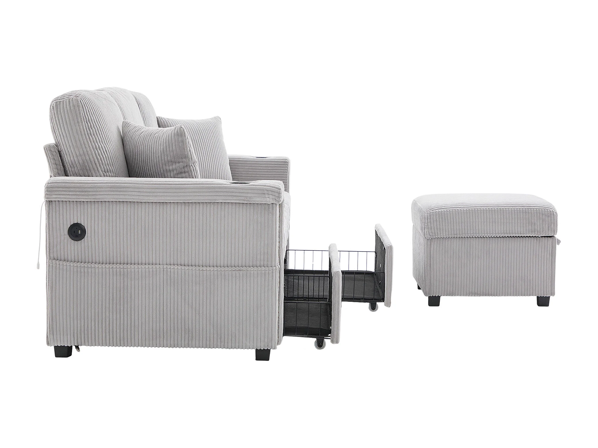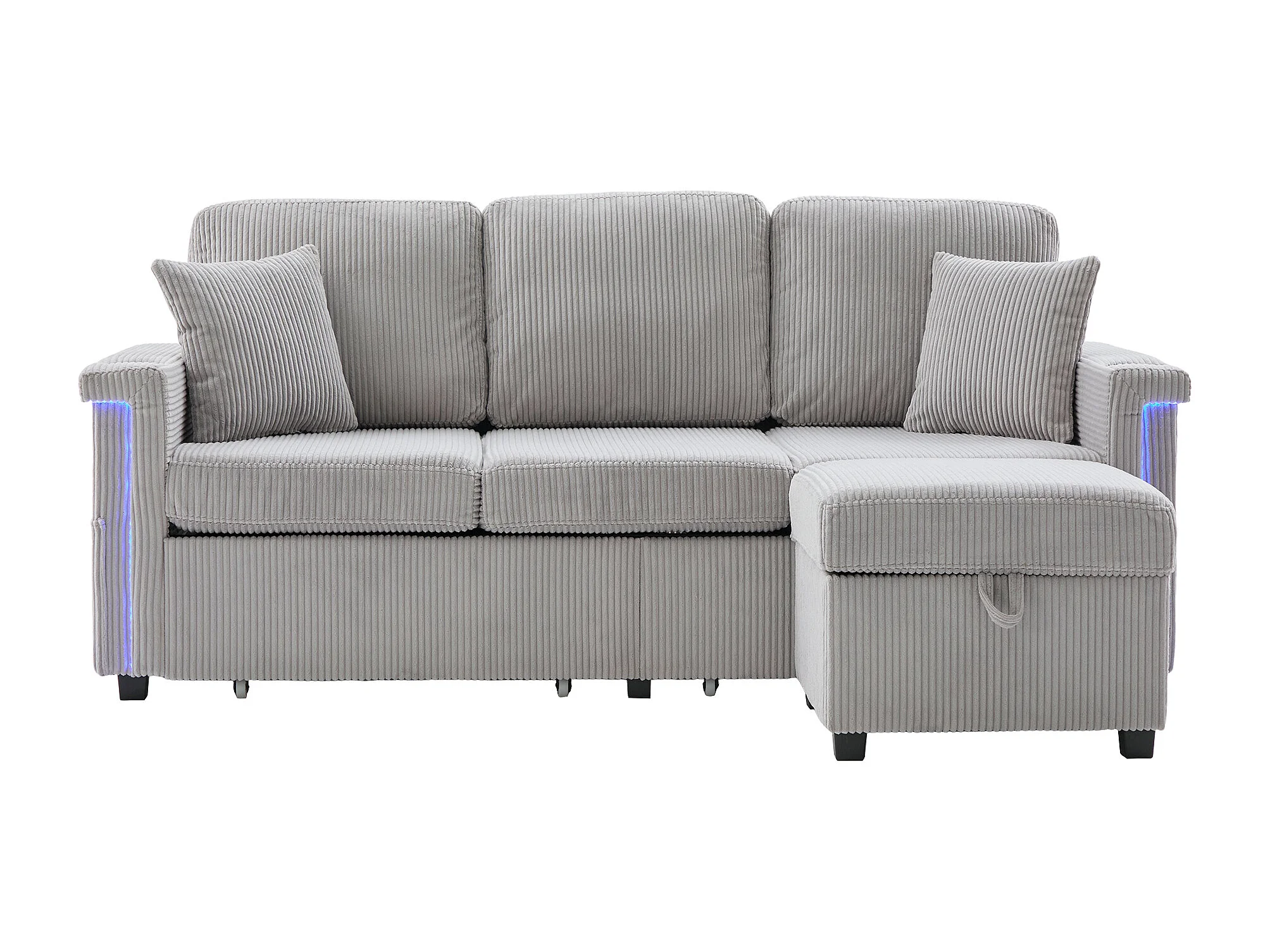 Canapé d'angle 3 places en velours côtelé gris clair - Avec LED, ports USB/Type-C et 2 tiroirs