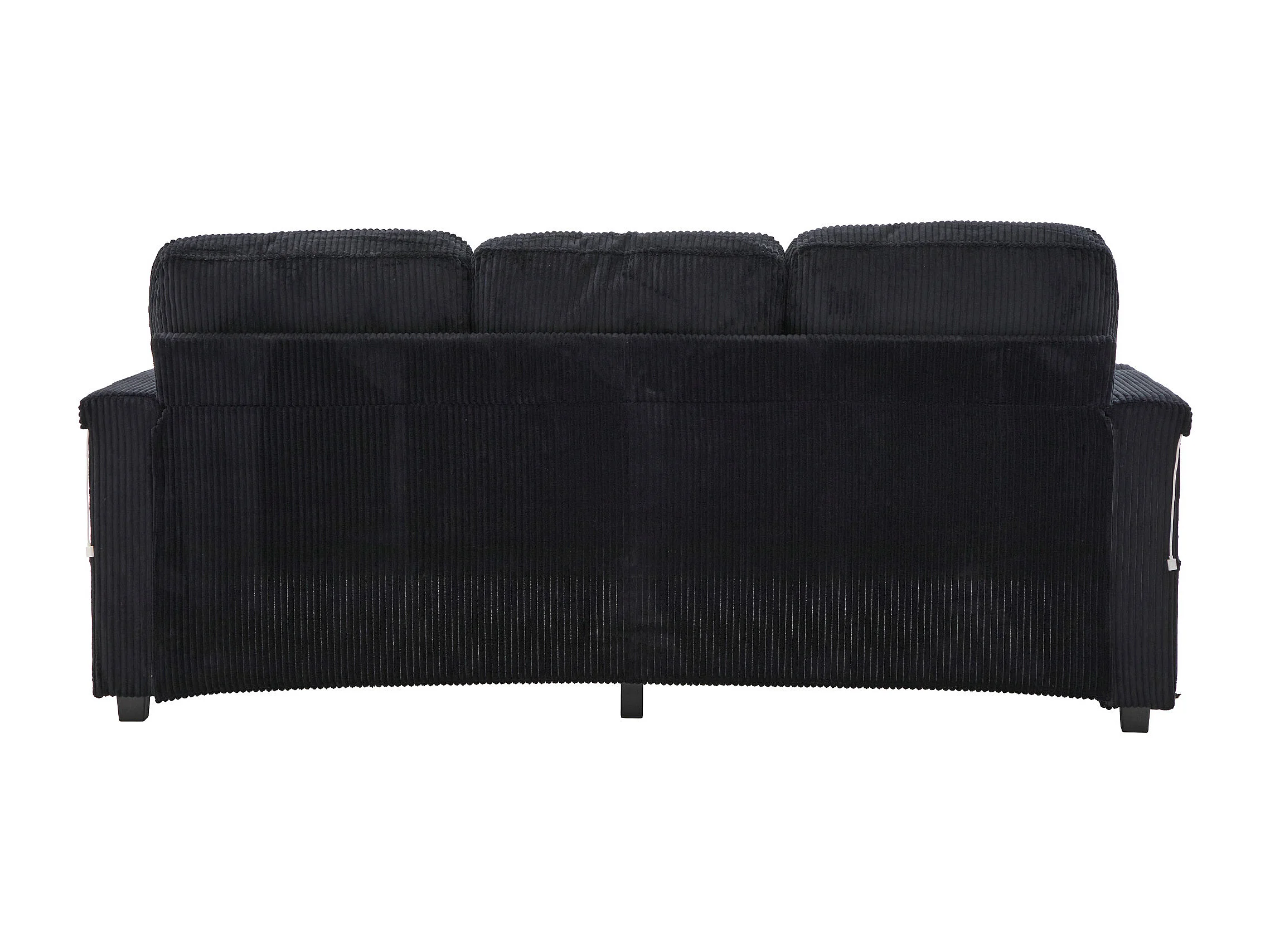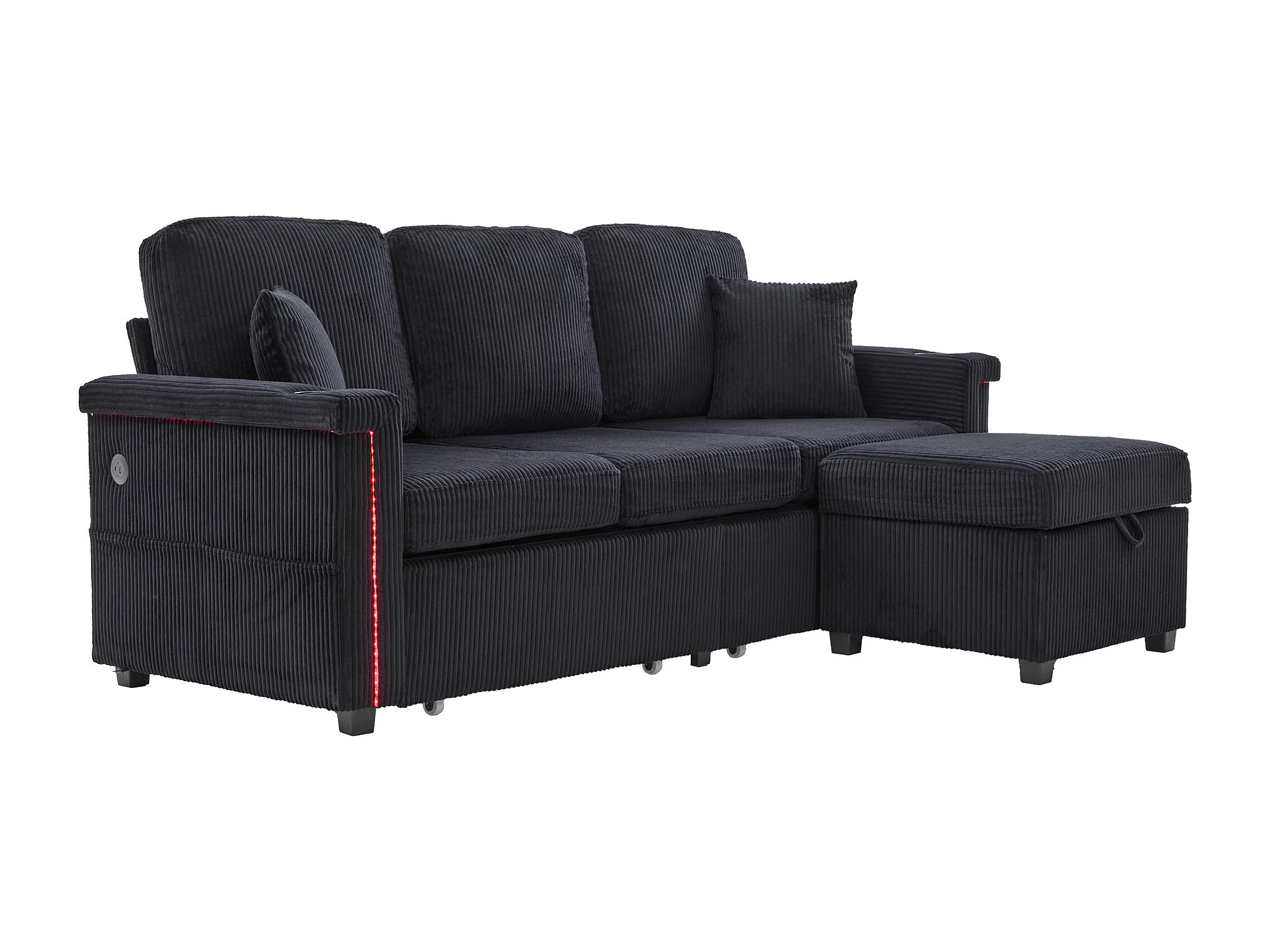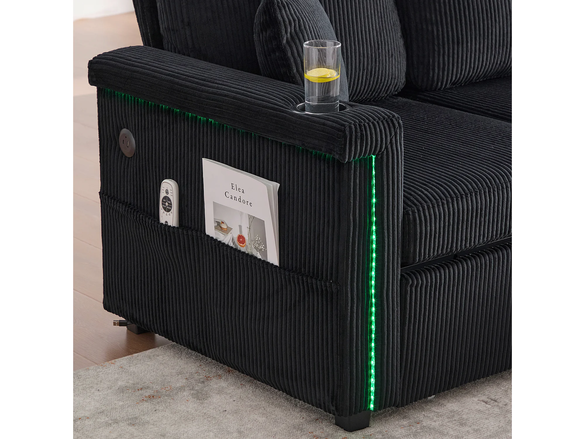 Canapé d'angle 3 places en velours côtelé noir - Avec LED, ports USB/Type-C et 2 tiroirs
