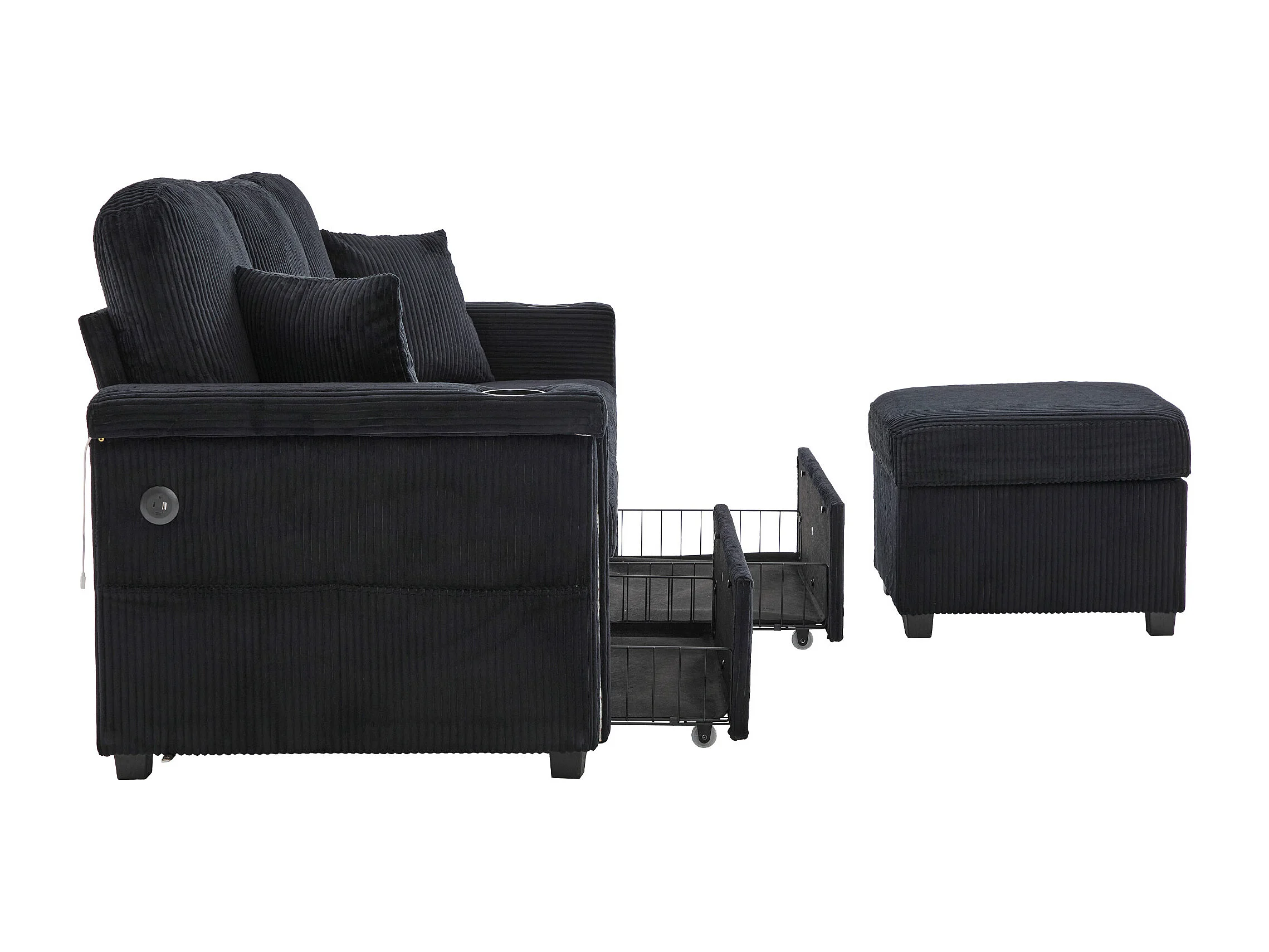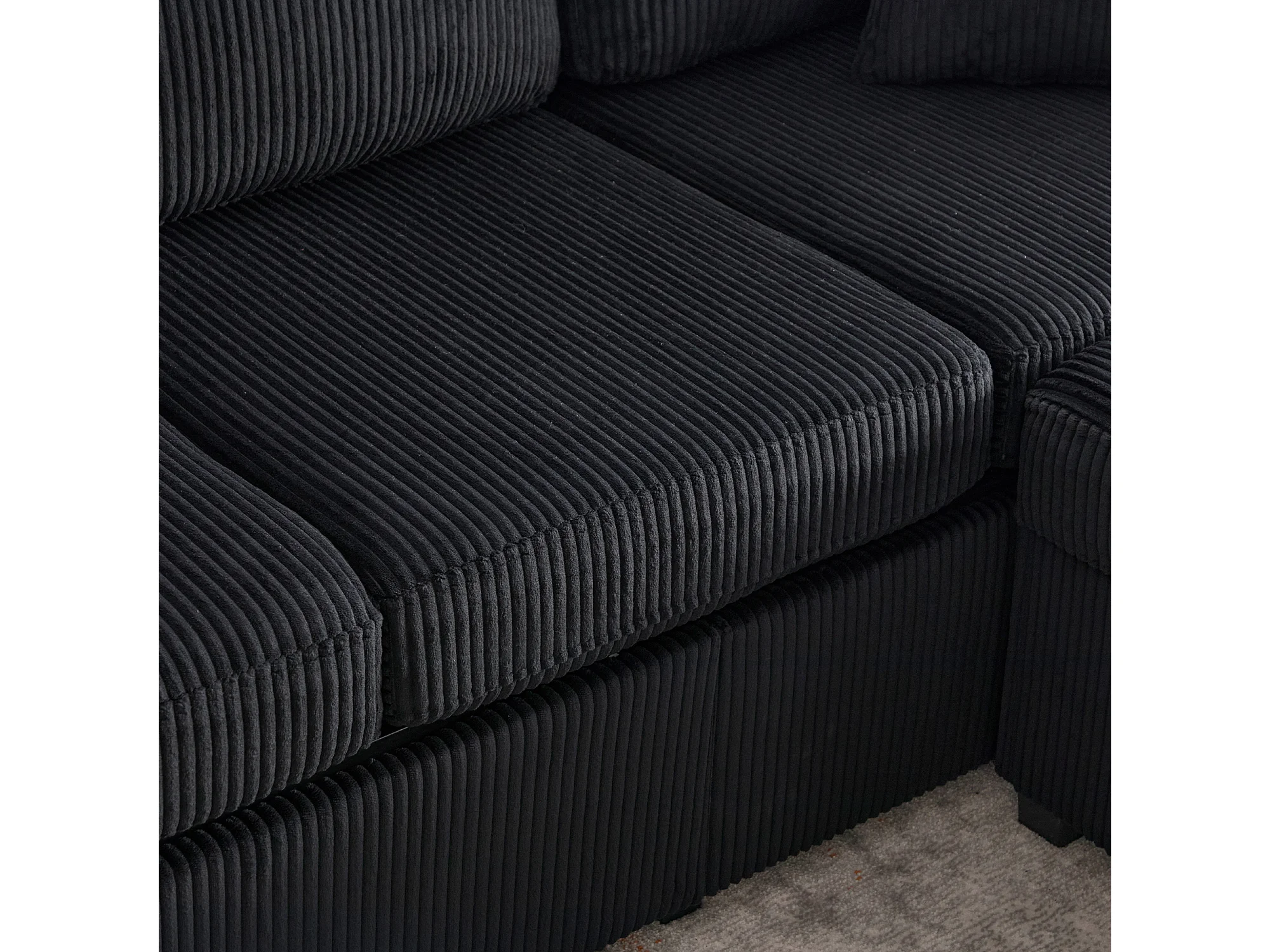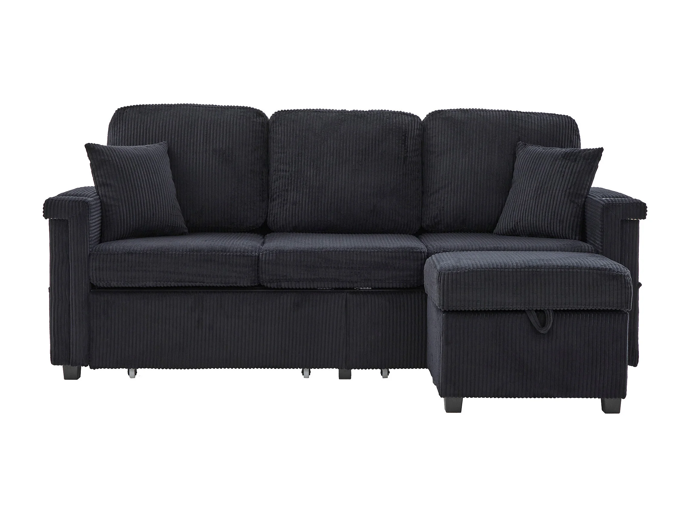 Canapé d'angle 3 places en velours côtelé noir - Avec LED, ports USB/Type-C et 2 tiroirs