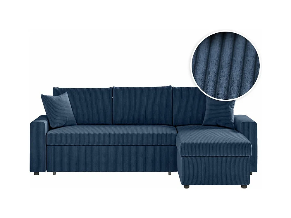 Canapé d'angle 3 places Maria réversible, convertible avec coffre en velours côtelé - Bleu foncé - L227 x P146 x H81cm - Loungitude