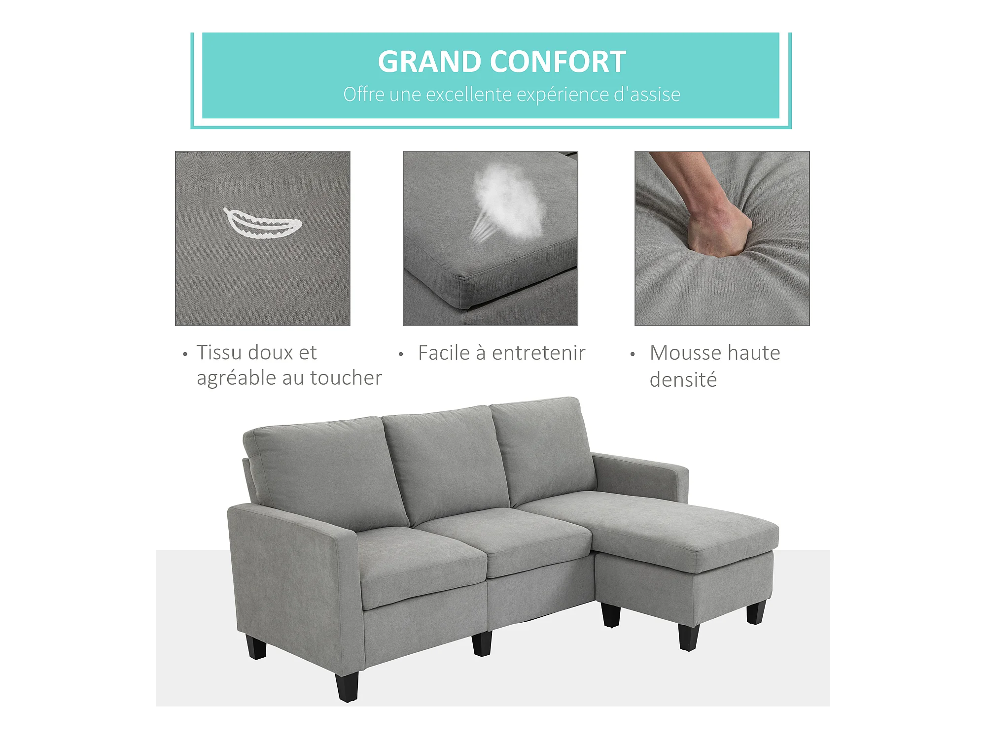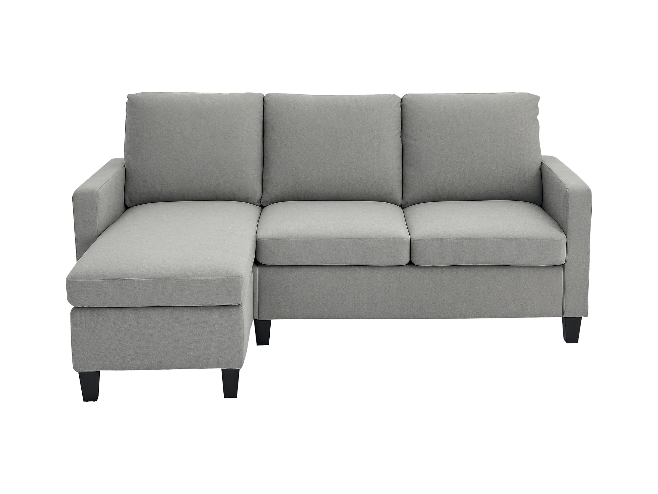 Canapé d'angle 3 places méridienne réversible garnissage mousse haute densité 28D tissu polyester gris clair