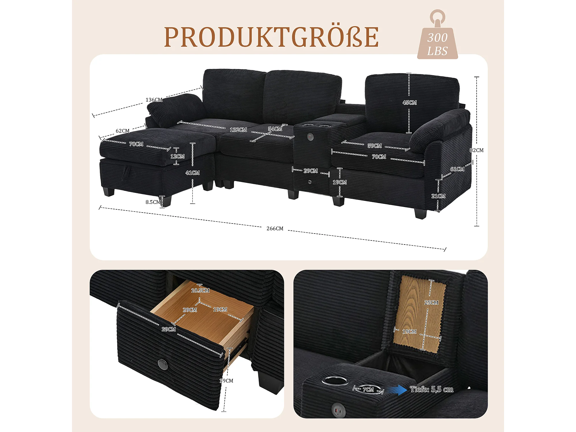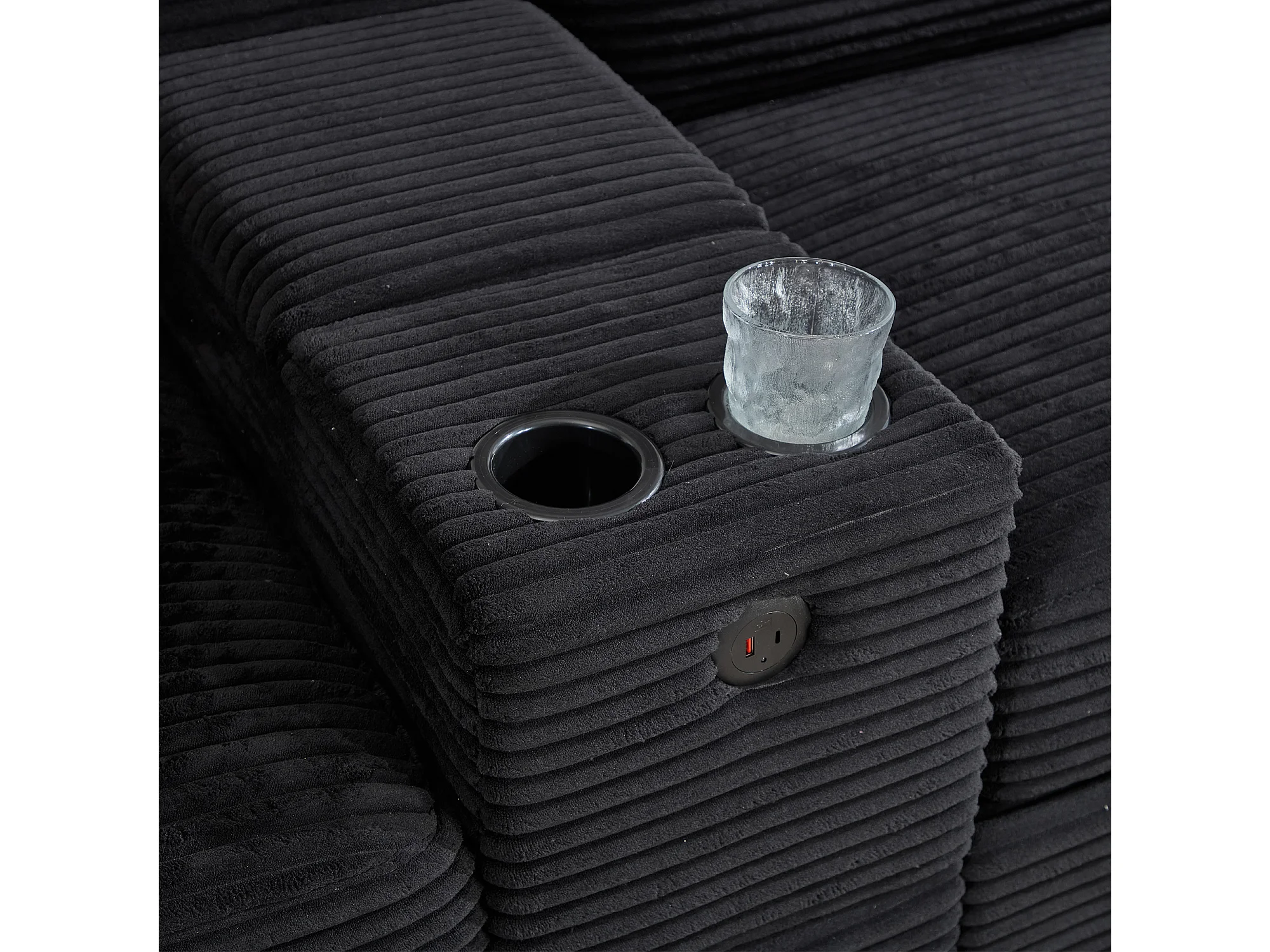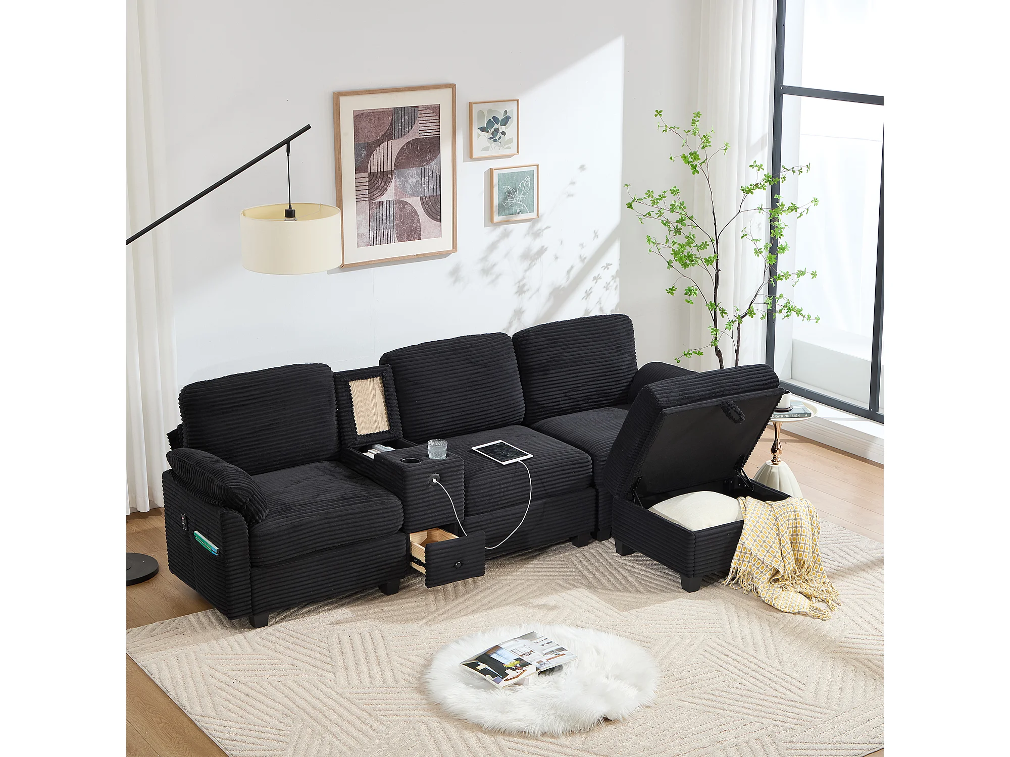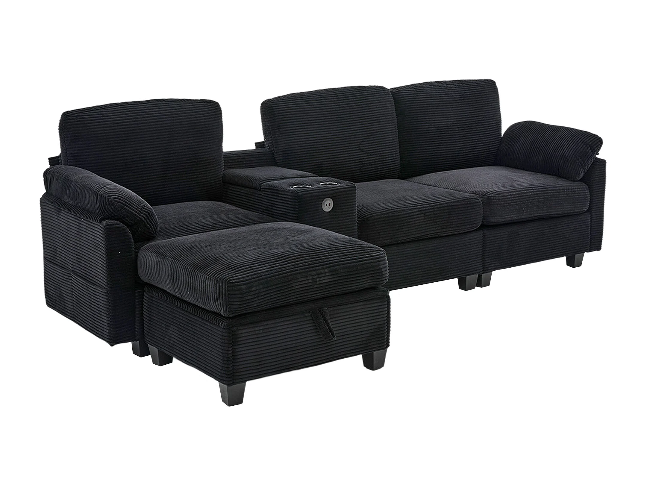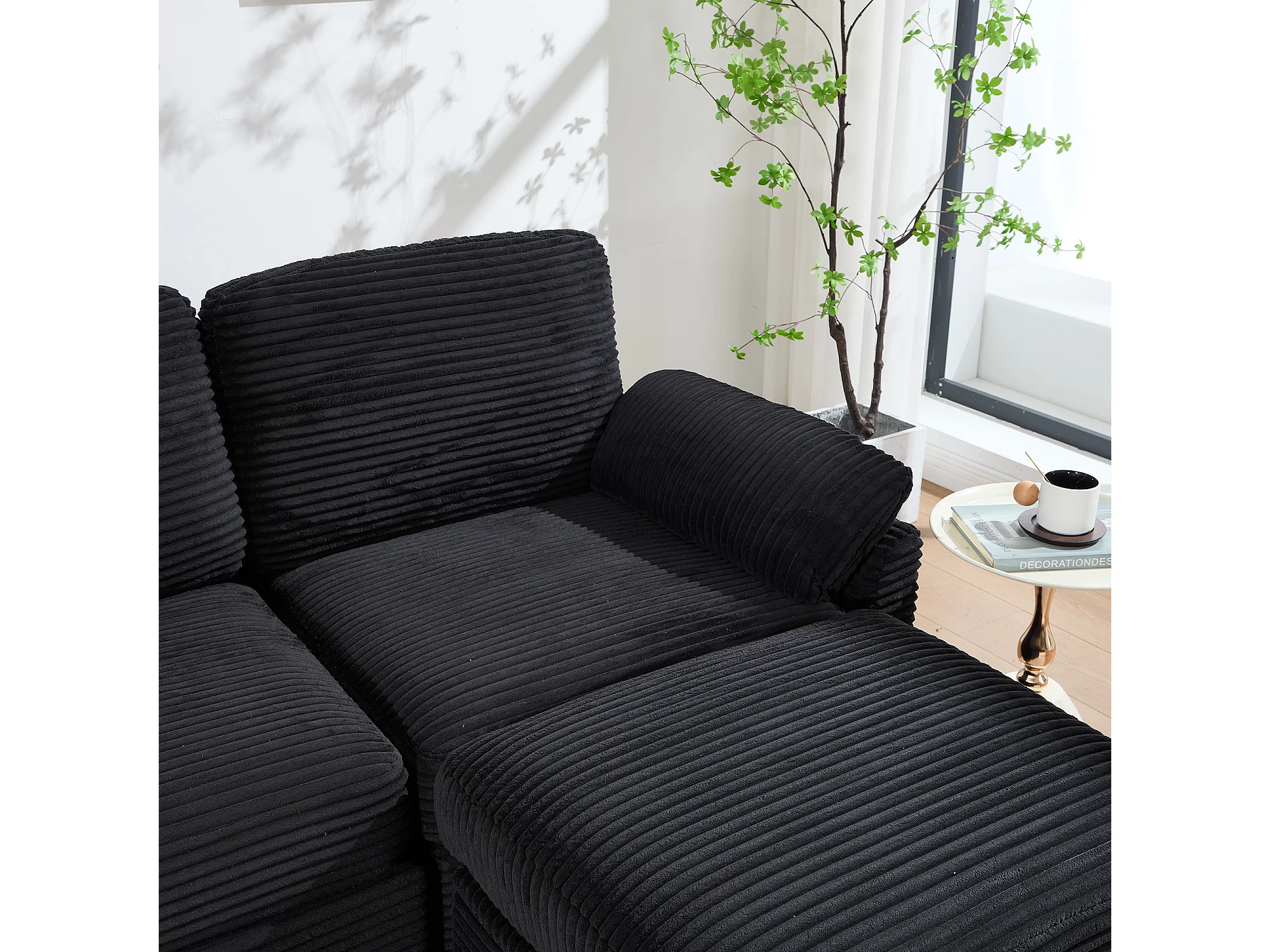 Canapé 266x136x82cm contemporain multifonction, structure robuste velours côtelé pour salon noir