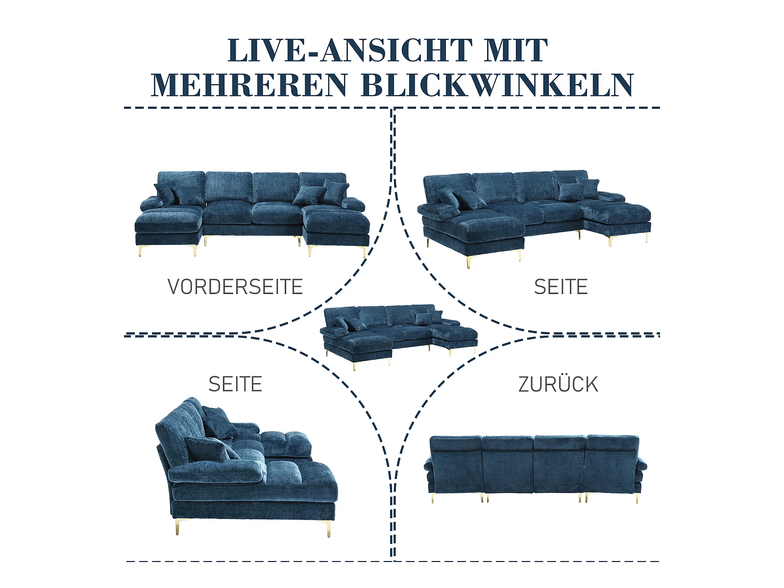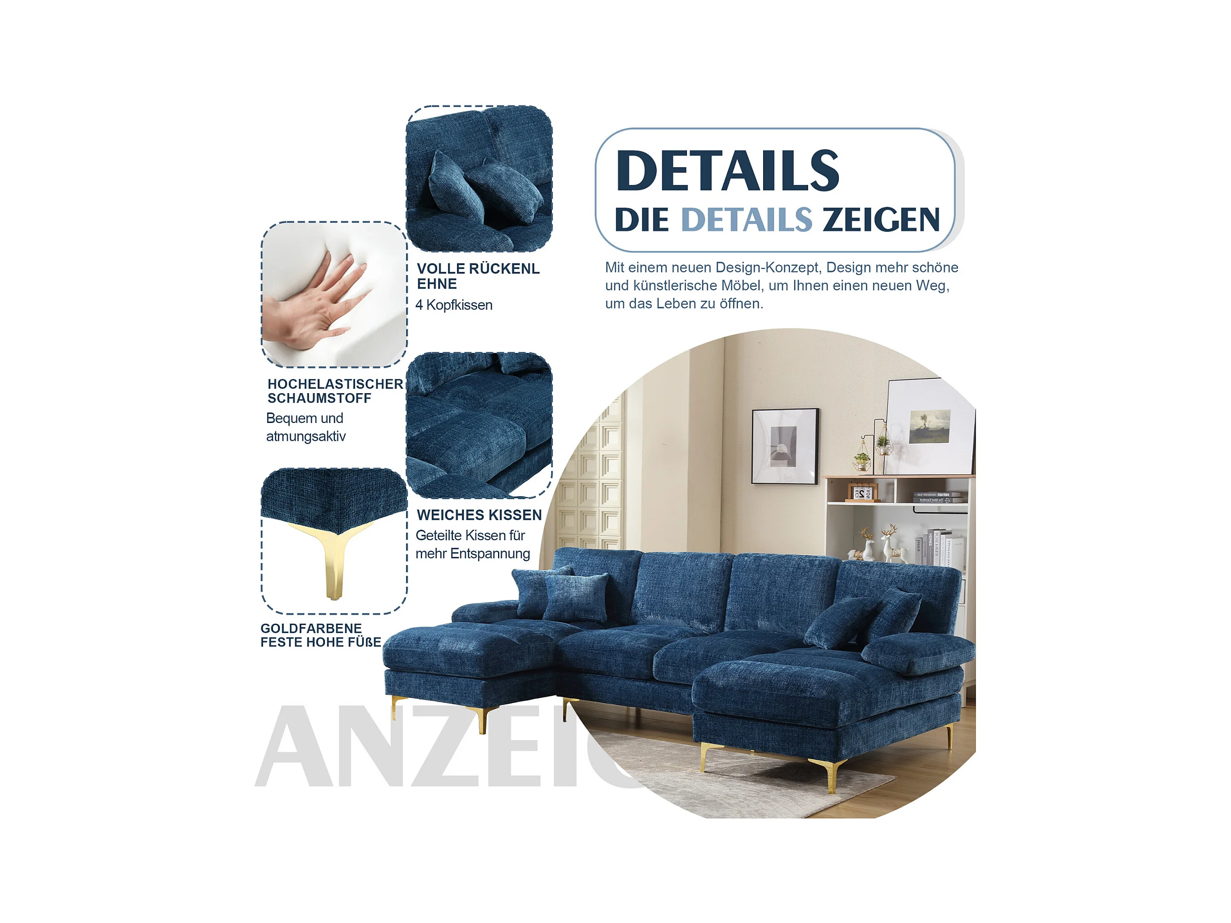 Canapé d'angle 4 places, 272x136x88cm,Grand canapé en forme de U, moderne, en tissu chenille, bleu