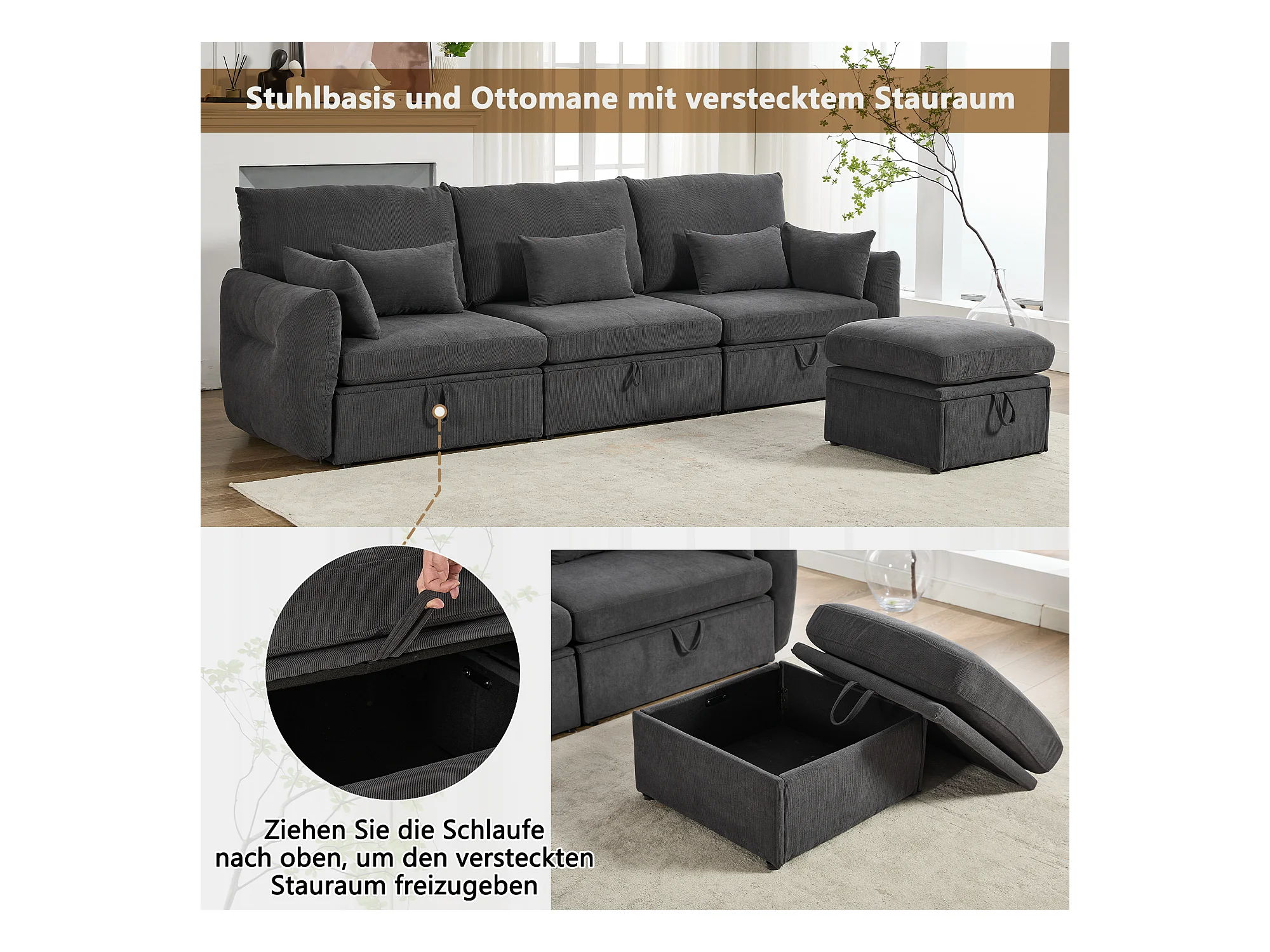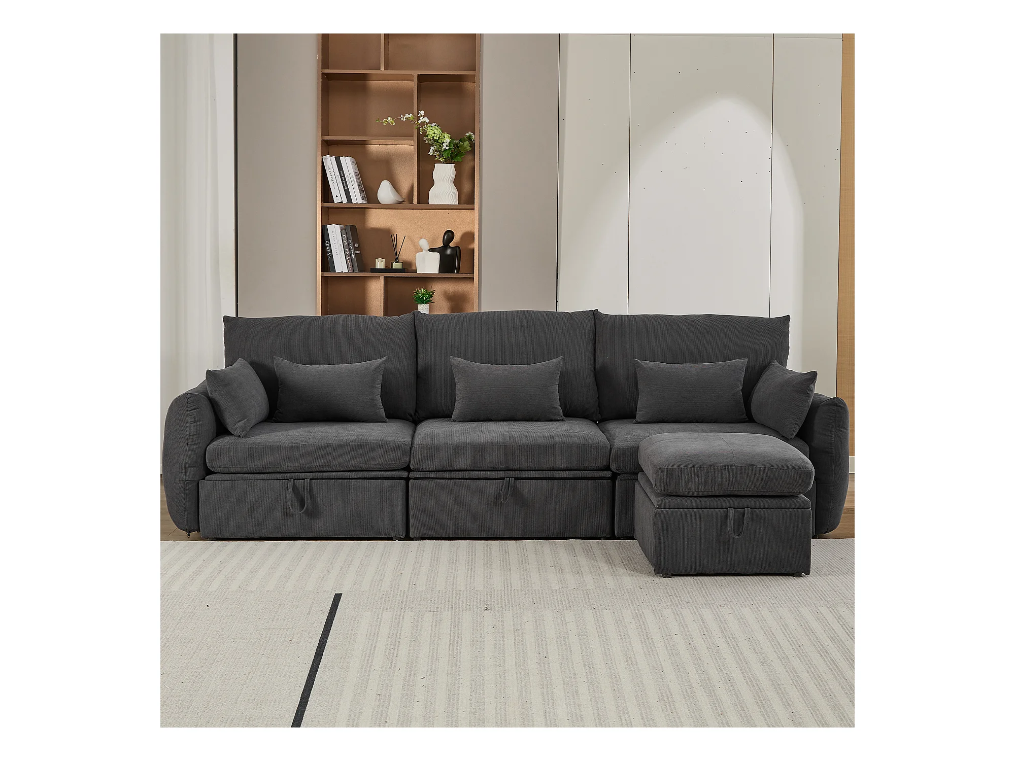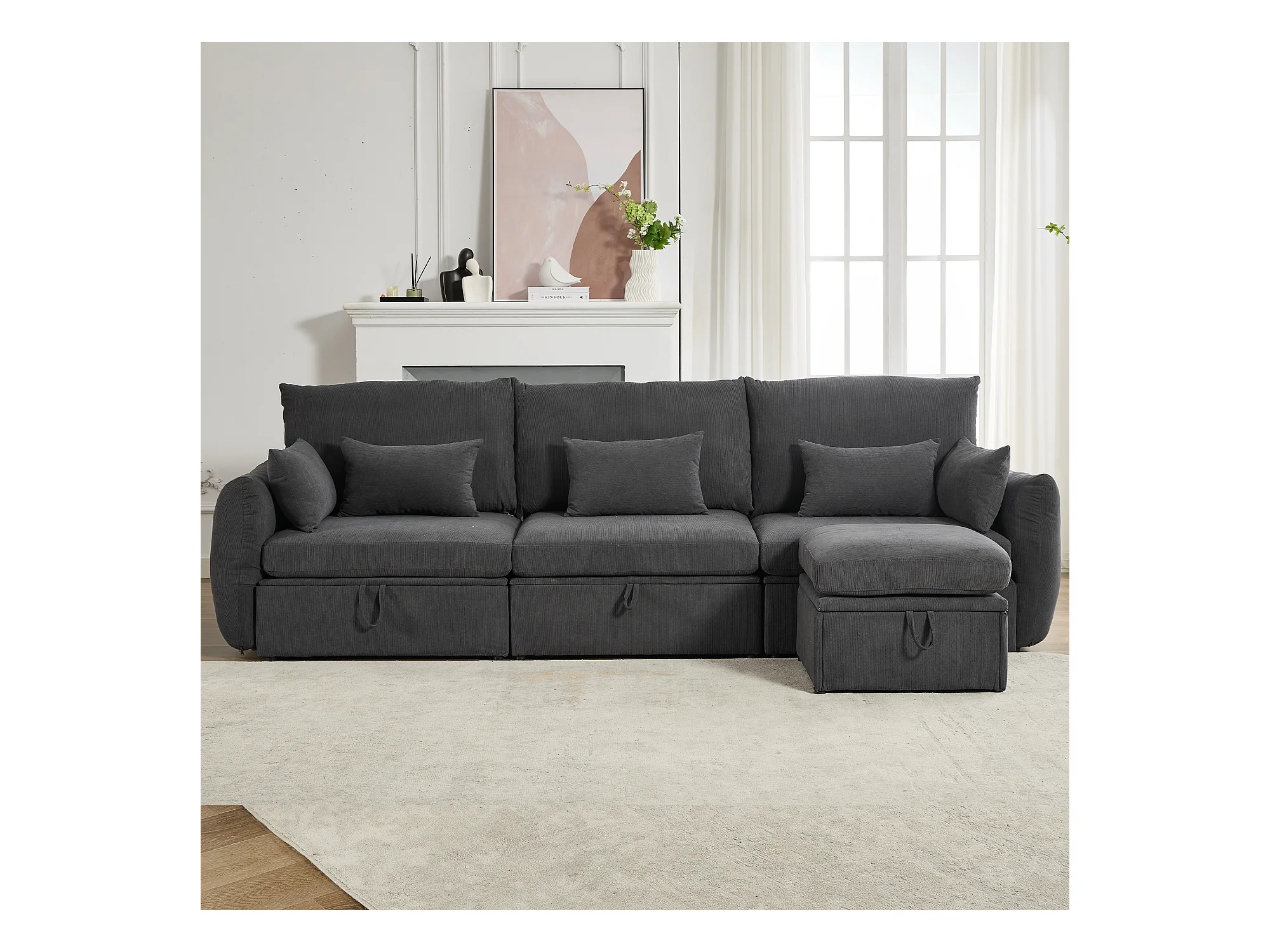 Canapé d'angle 4 places - 300 x 90 x 96 cm - Repose-pieds et espace de rangement - Velours - Gris