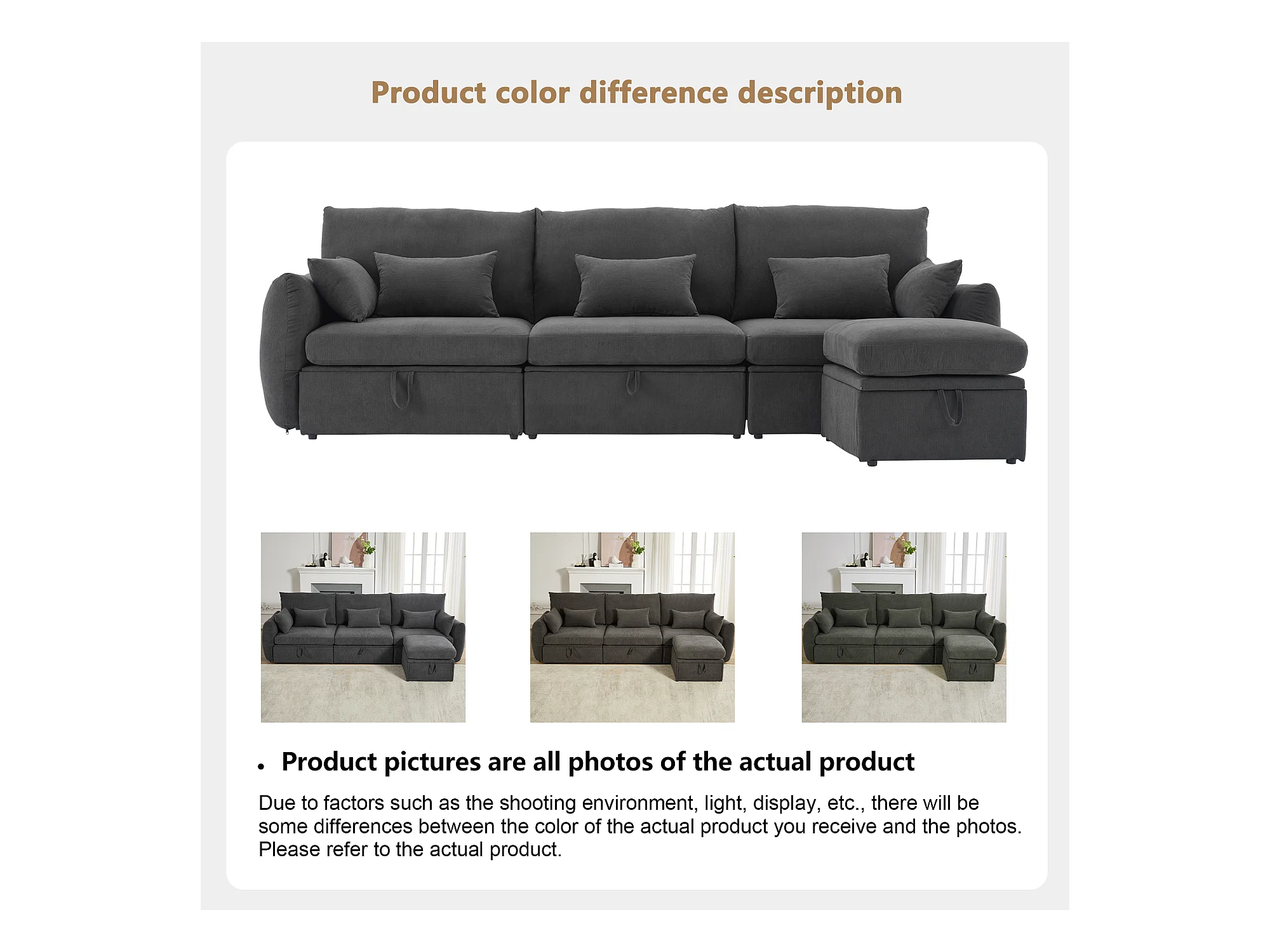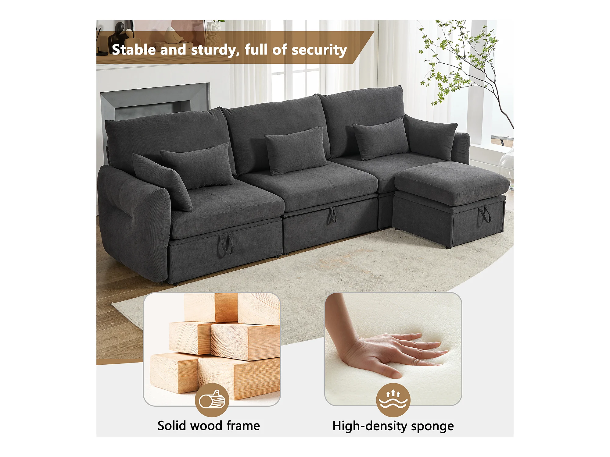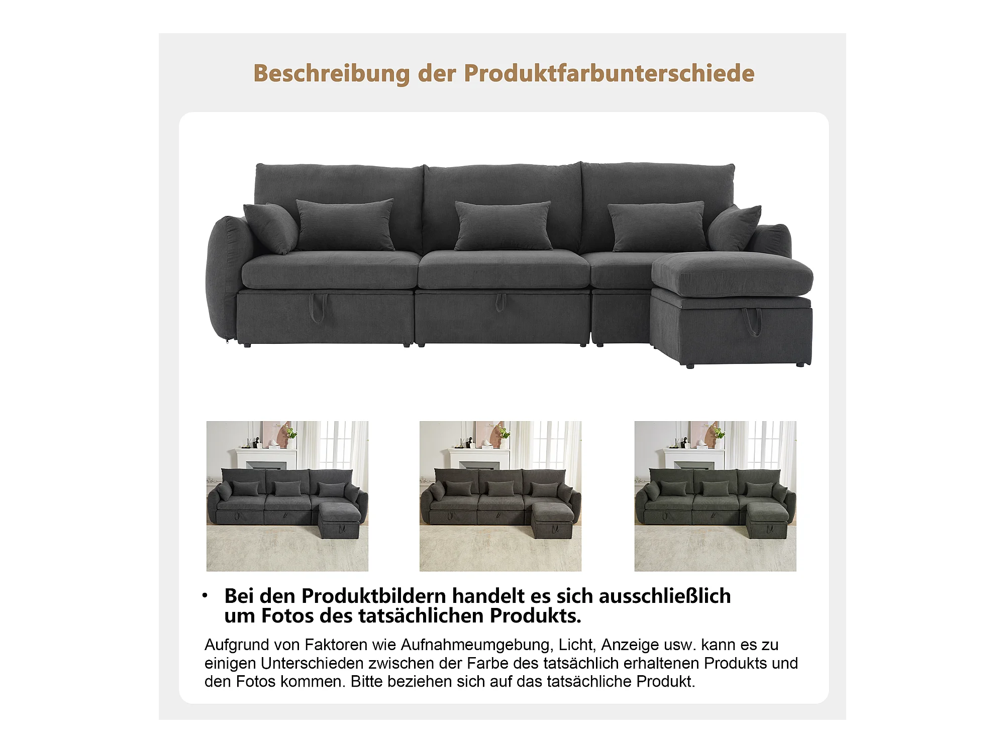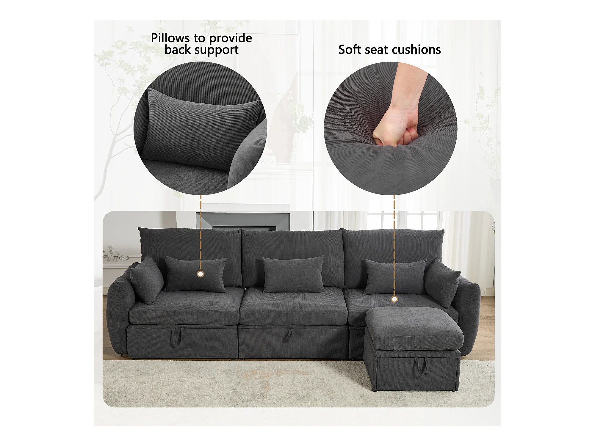 Canapé d'angle 4 places - 300 x 90 x 96 cm - Repose-pieds et espace de rangement - Velours - Gris
