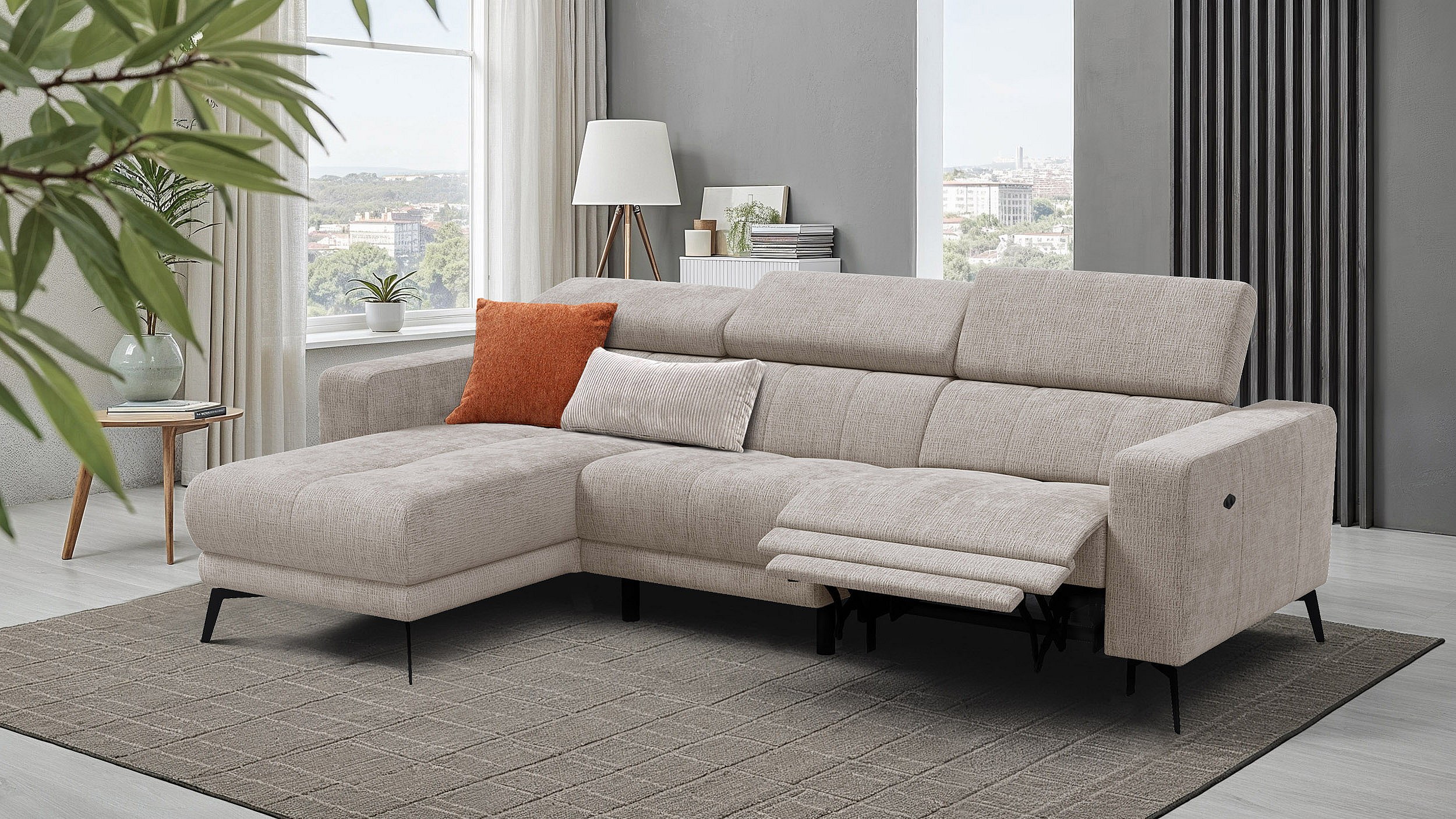 Canapé d'angle 4 places MORELLO avec 1 x Relax Zero Gravity, tissu beige