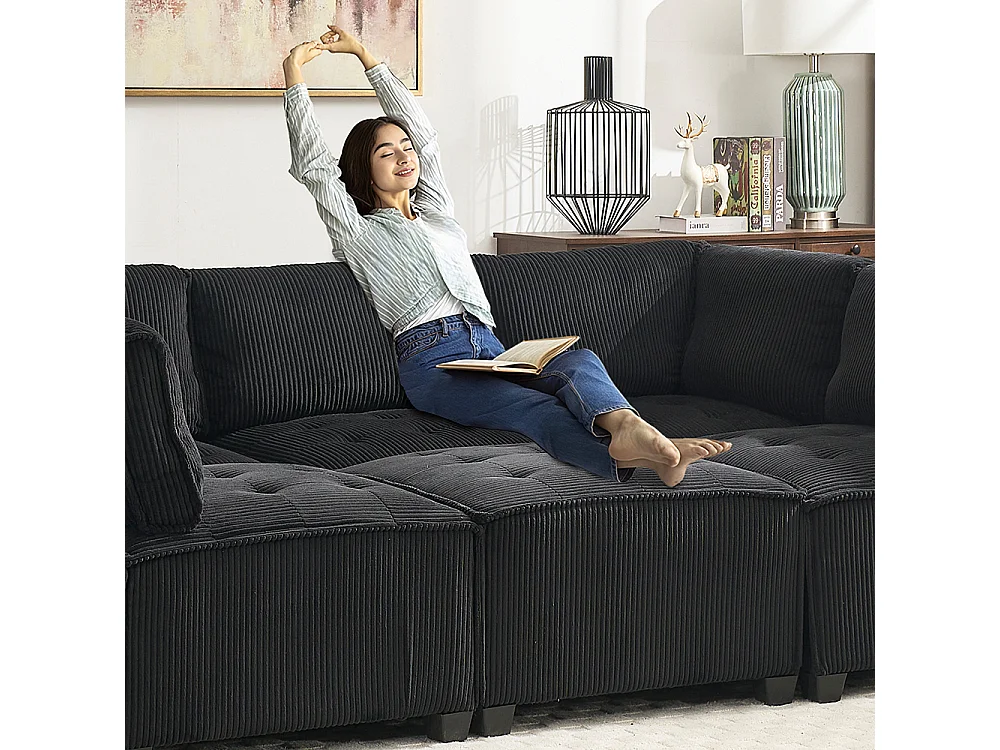 Canapé d'angle 6 places en velours côtelé ergonomique avec poches de rangement modulable en U/L ou lit structure bois métal montage facile noir