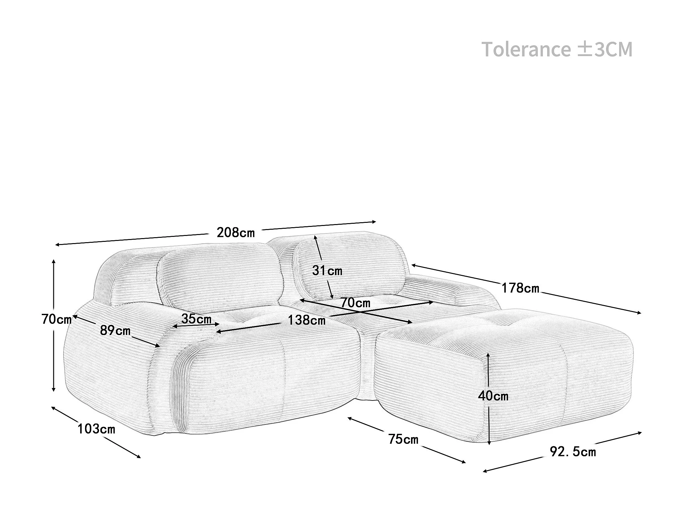 Canapé d’angle 82'' modulable en velours côtelé sans montage Noir - Style et confort sans effort