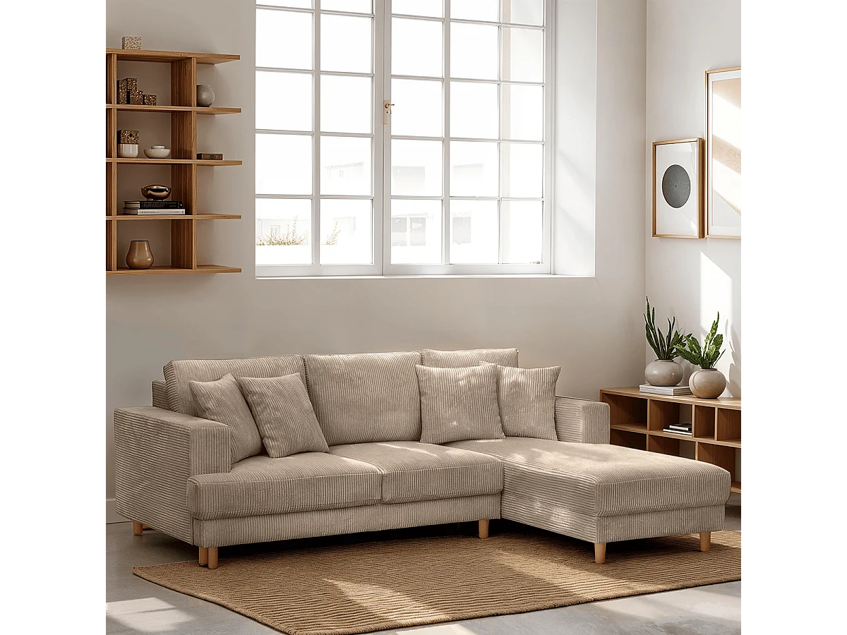 Canapé d'angle à droite convertible 4 places en velours côtelé taupe - Marceau