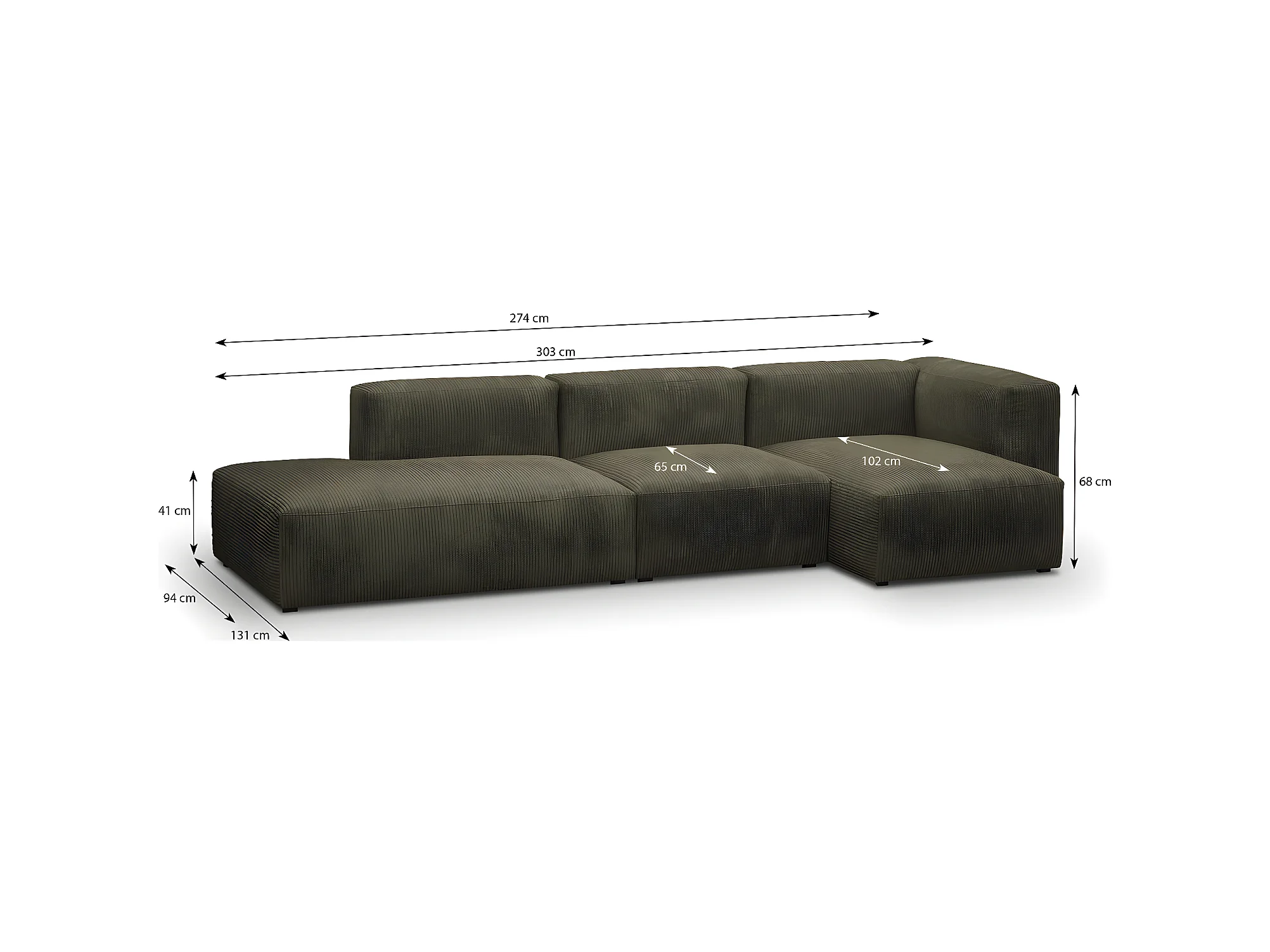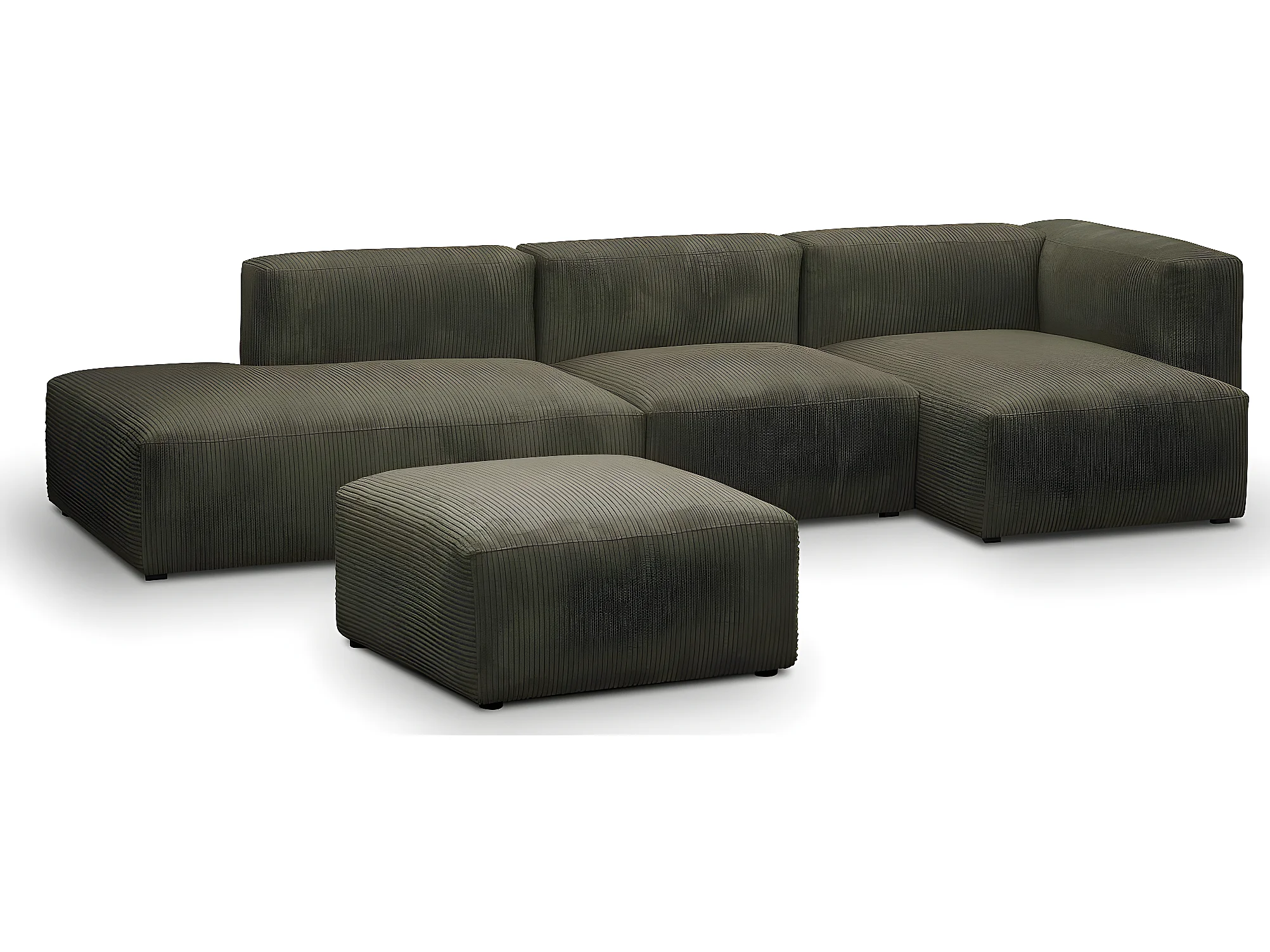 Canapé d'angle à droite modulable avec méridienne 5 places en velours côtelé vert kaki + pouf - Modulo