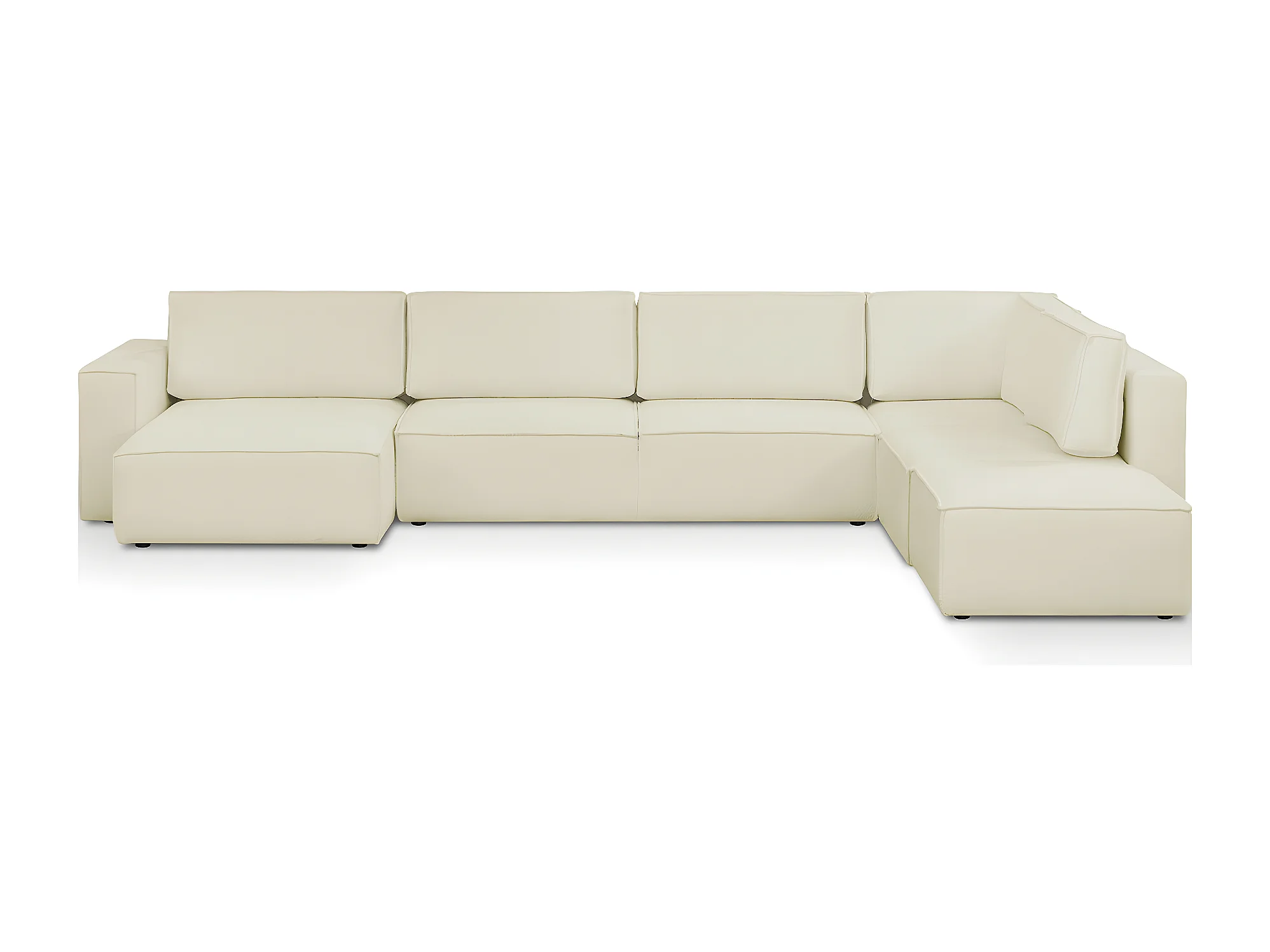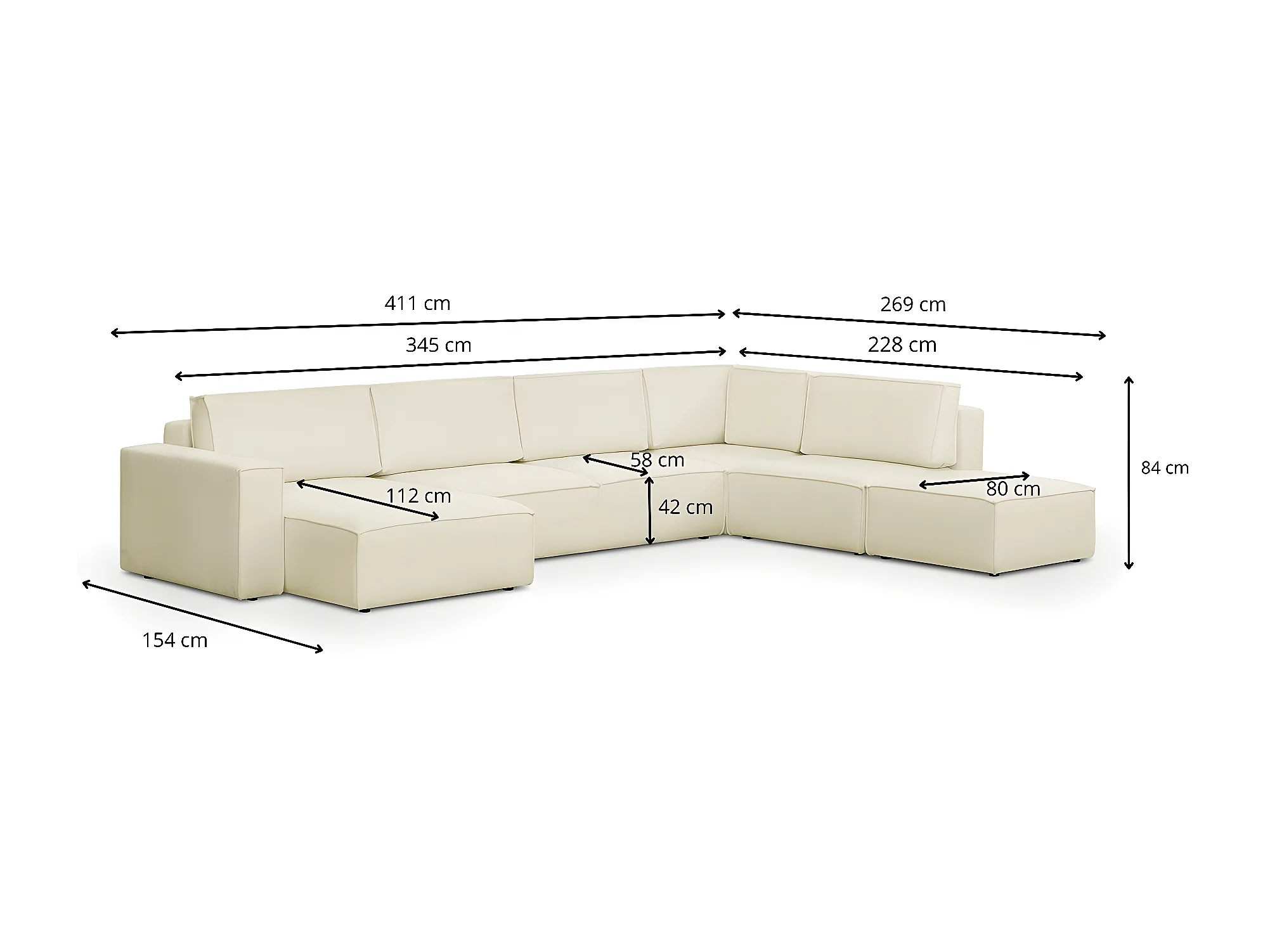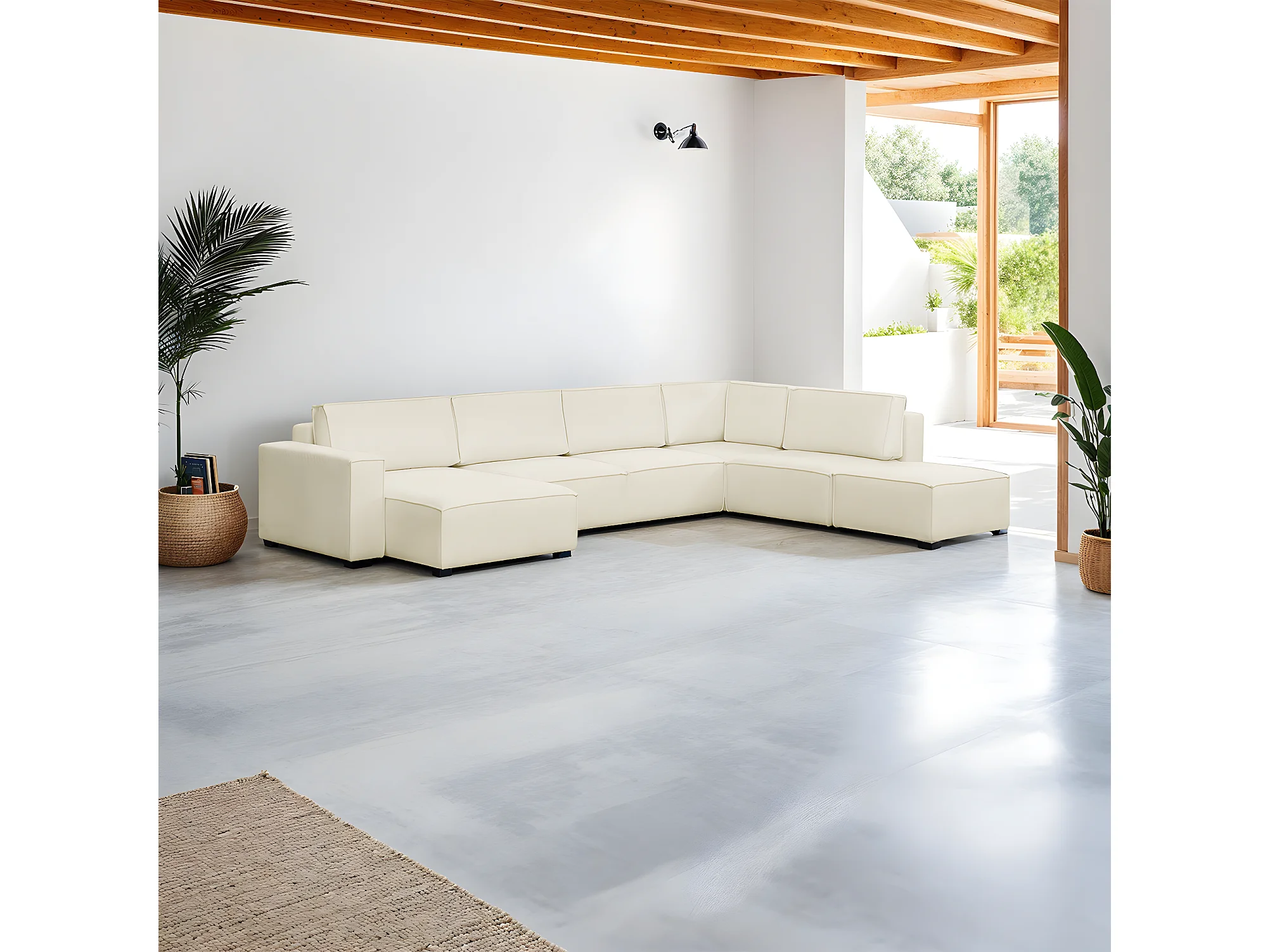 Canapé d'angle à droite panoramique convertible modulable 8 places avec pouf en tissu bouclé écru - Harper Mod