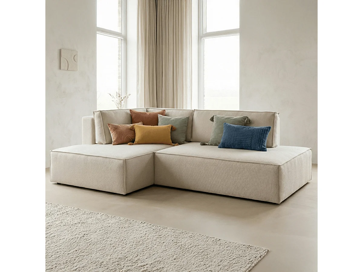 Canapé d'angle à gauche convertible 3 places avec coffre en tissu beige - Barani