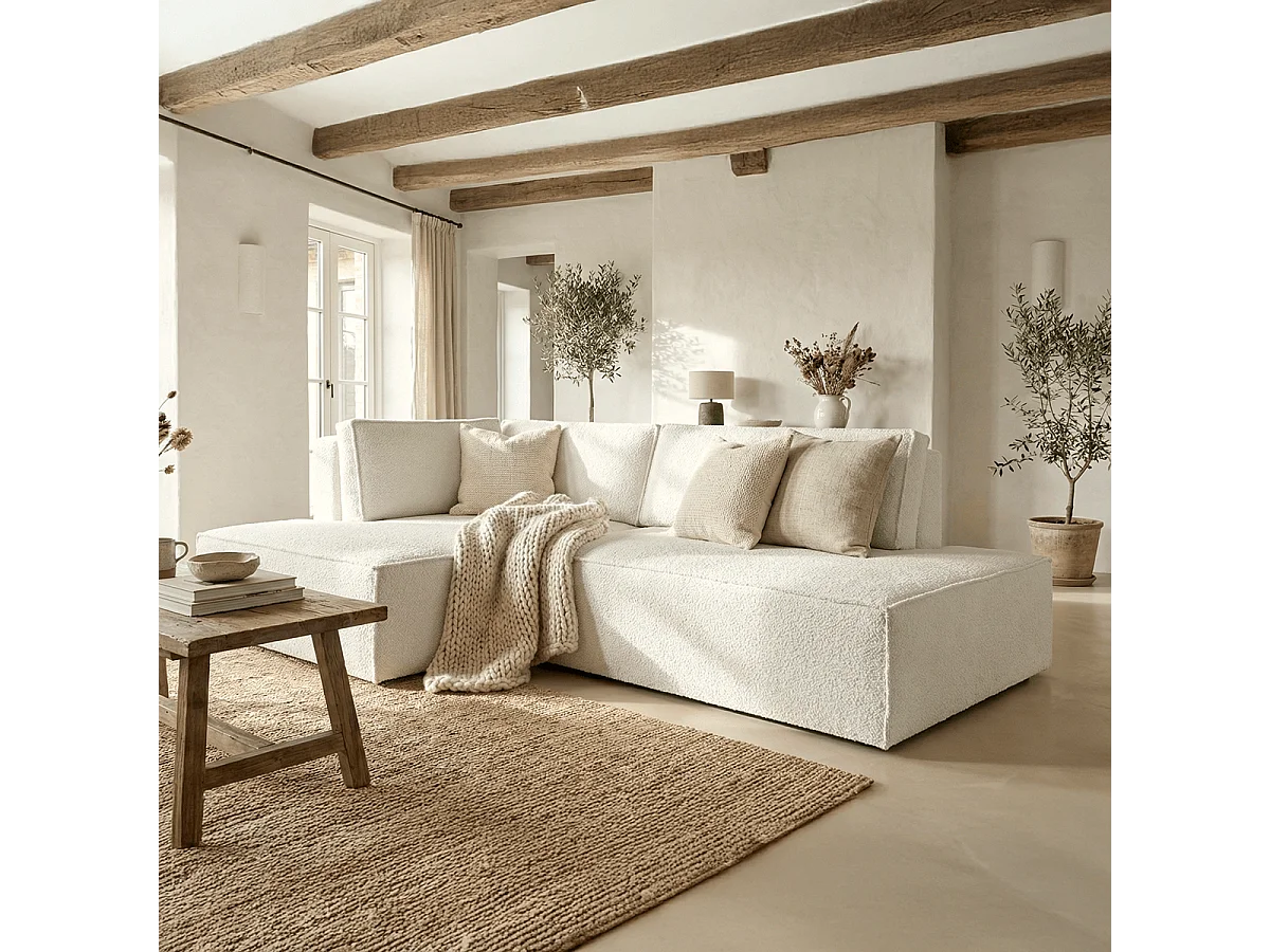 Canapé d'angle à gauche convertible 3 places avec coffre en tissu bouclé écru - Barani
