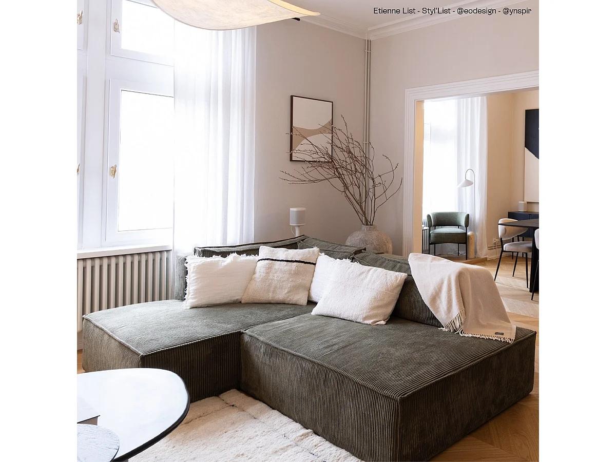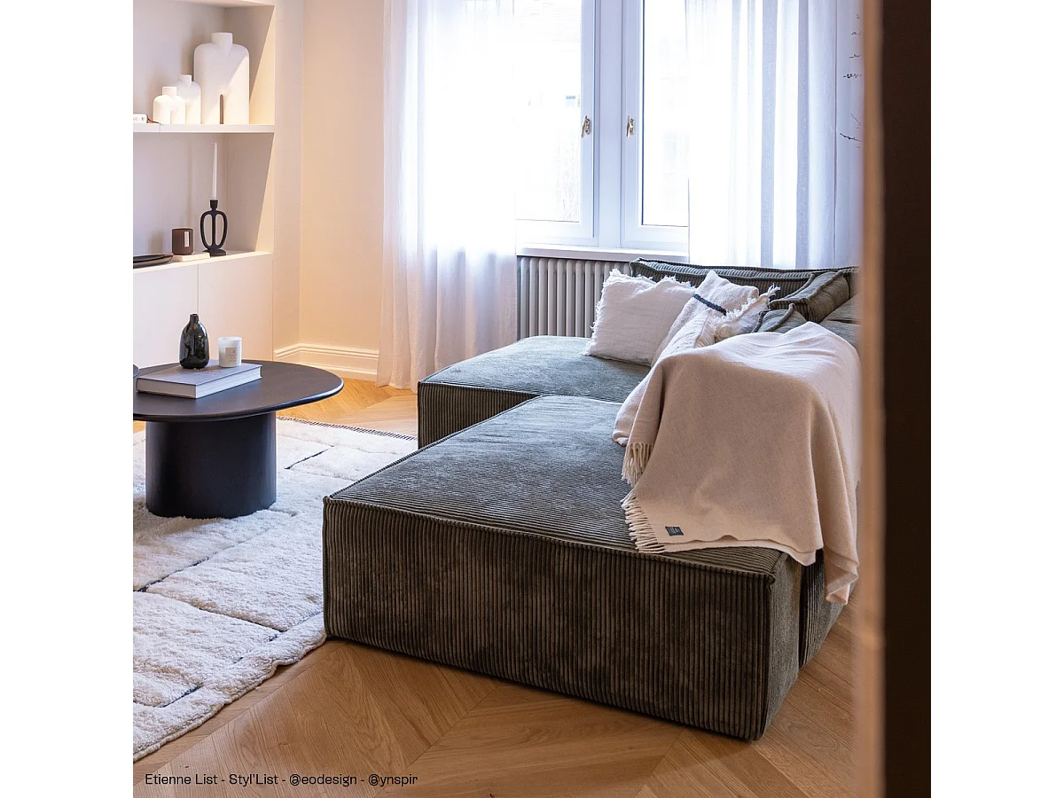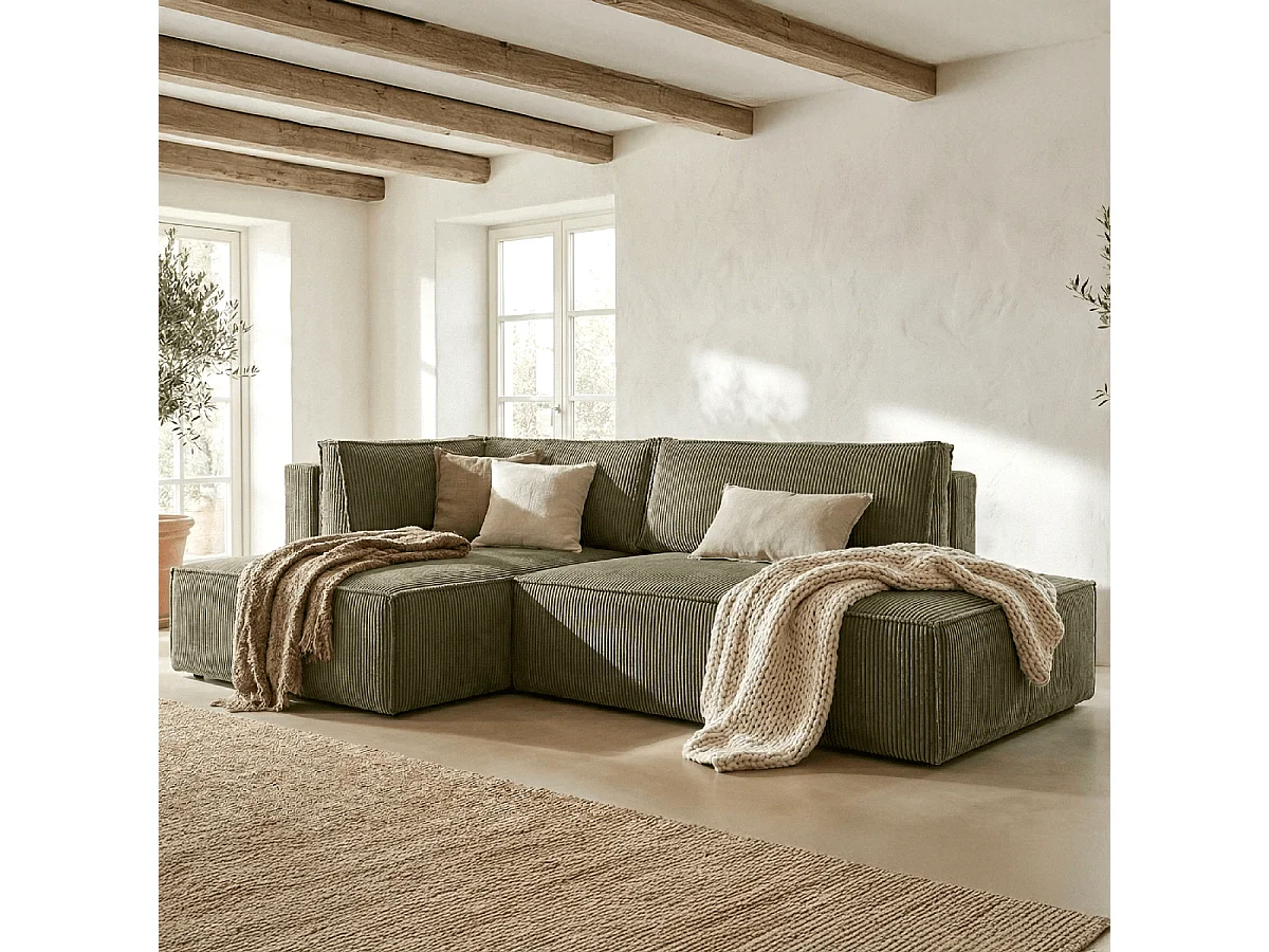 Canapé d'angle à gauche convertible 3 places avec coffre en velours côtelé vert kaki - Barani