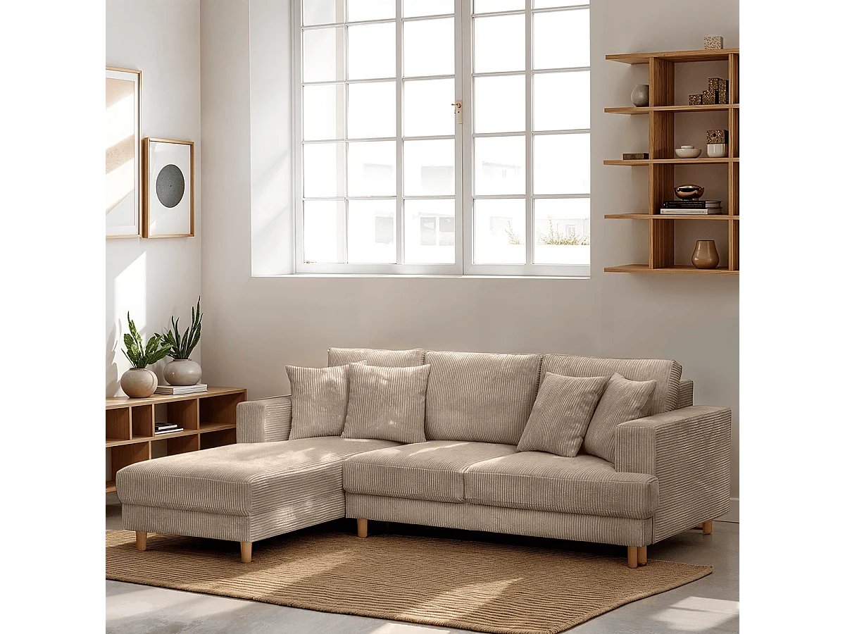 Canapé d'angle à gauche convertible 4 places en velours côtelé taupe - Marceau