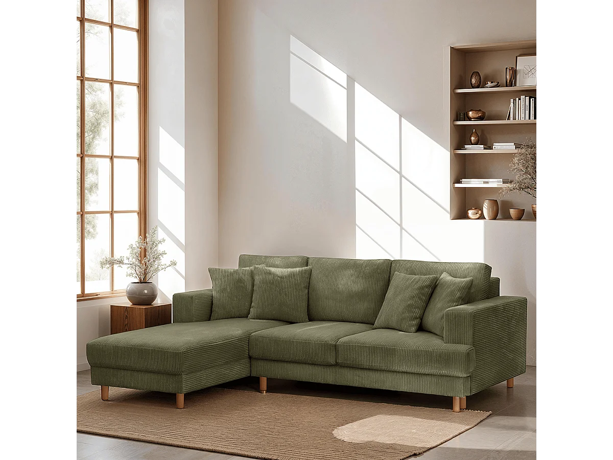 Canapé d'angle à gauche convertible 4 places en velours côtelé vert kaki - Marceau