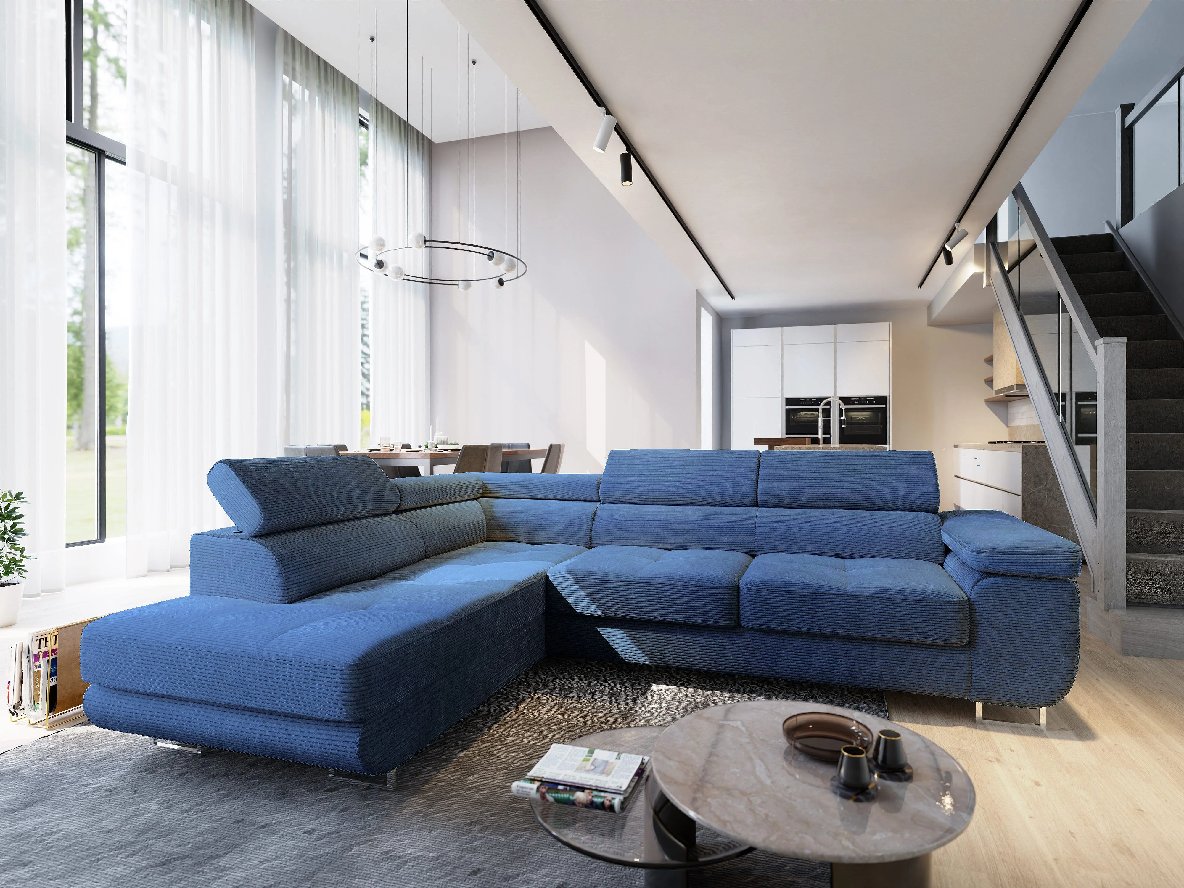 Canapé d'angle APIRO Bleu en velours côtelé avec fonction de couchage