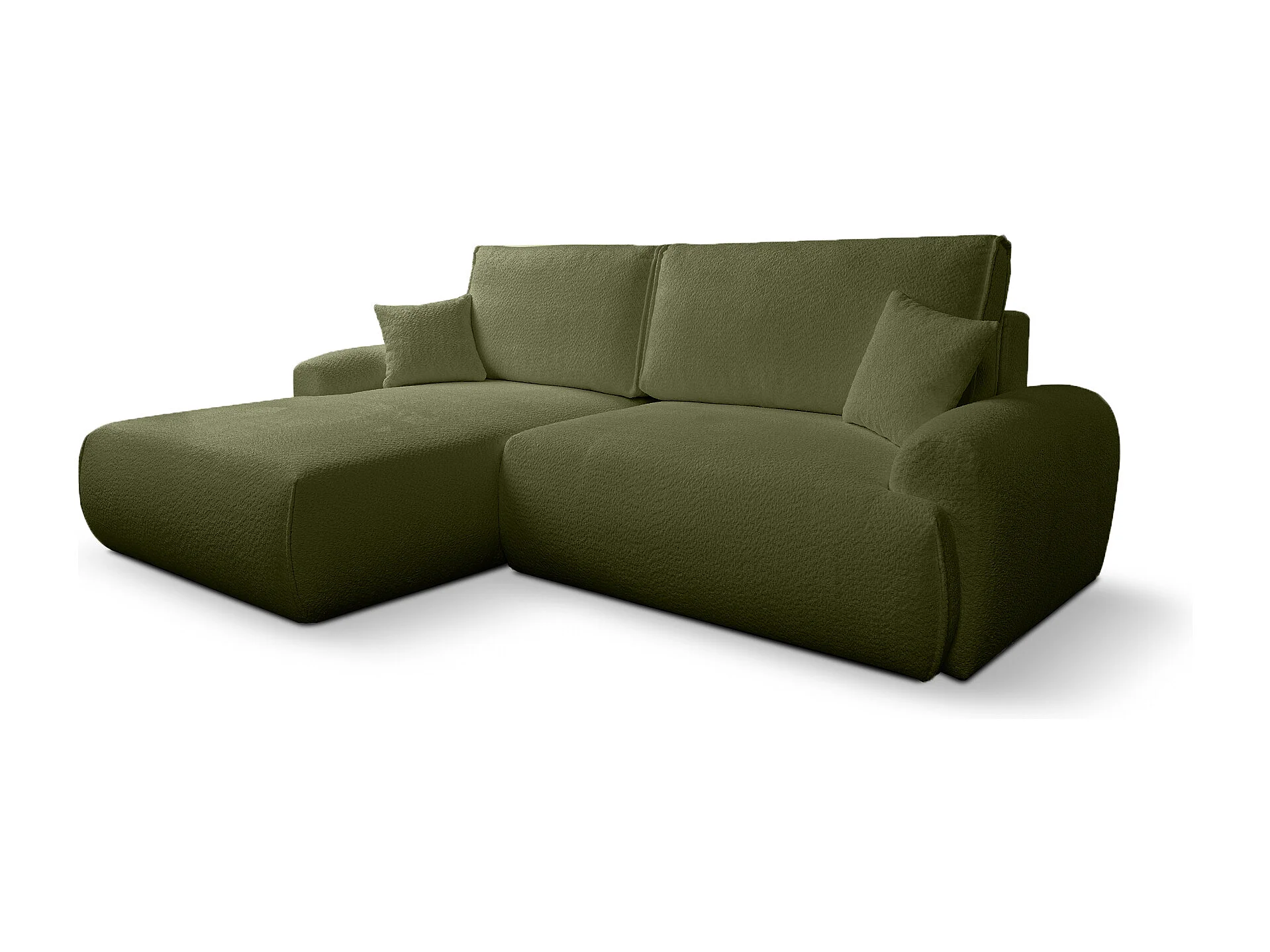 Canapé d’angle gauche Noboo avec fonction de couchage et coffre en bouclé vert foncé – direct fabricant, livraison et installation offertes !
