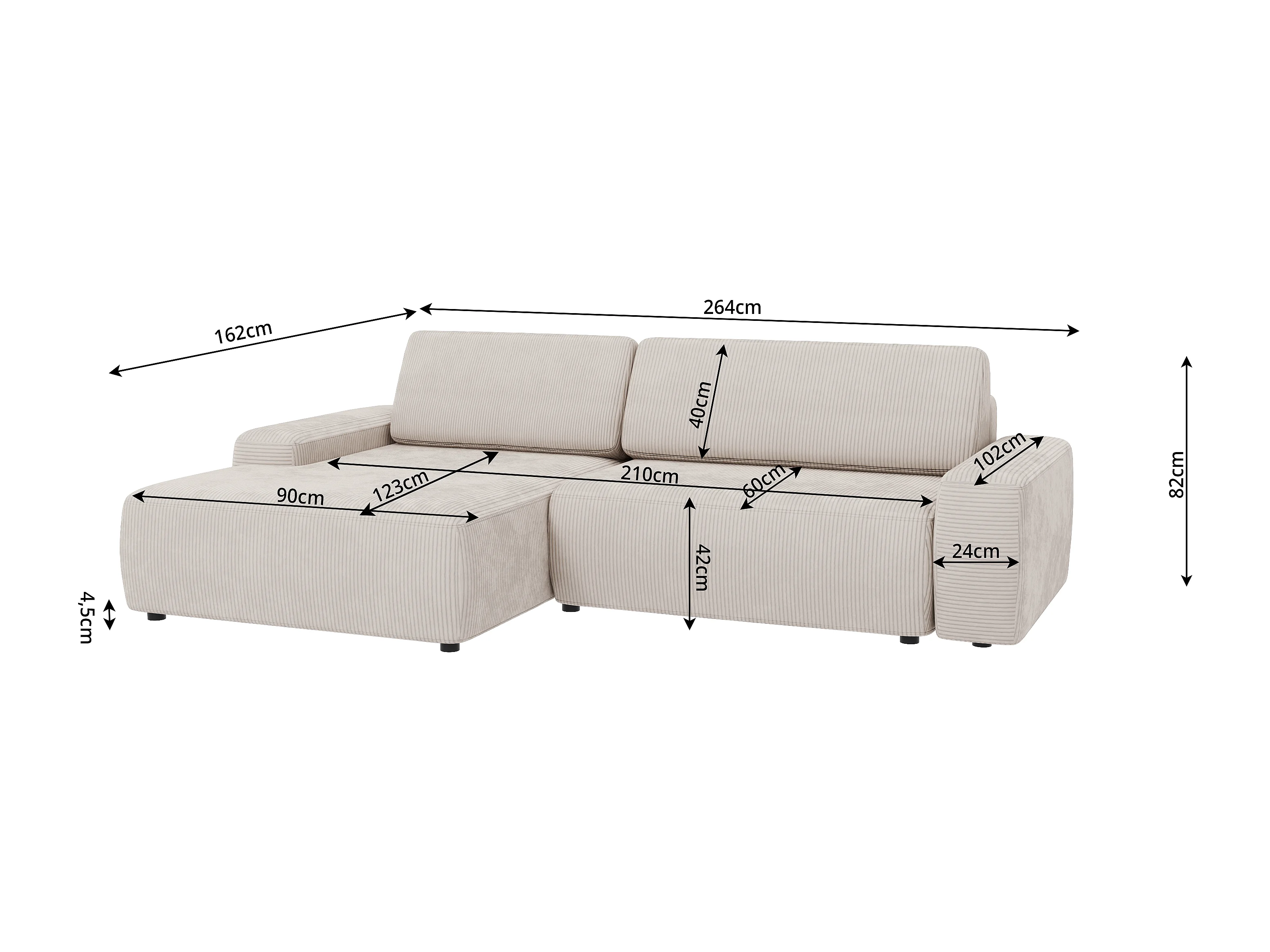 Canapé d’angle avec fonction lit et coffre de rangement en tissu côtelé beige, offrant un agréable confort d’assise EVERLY