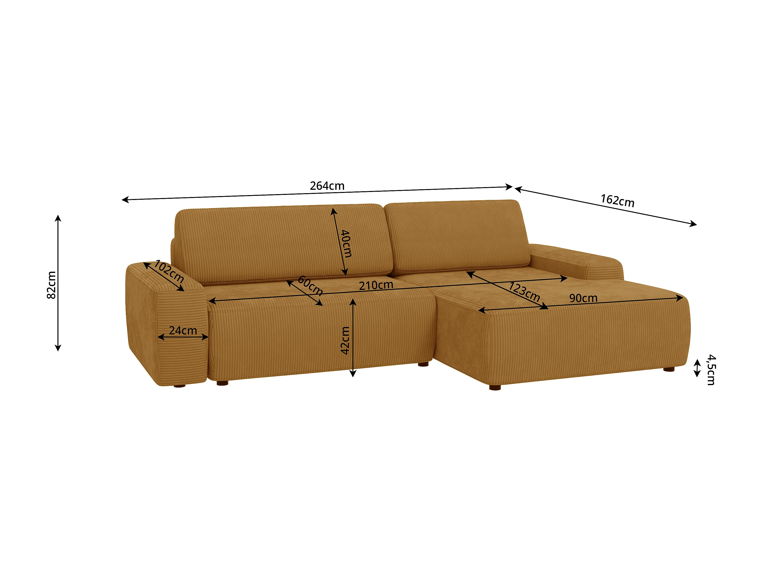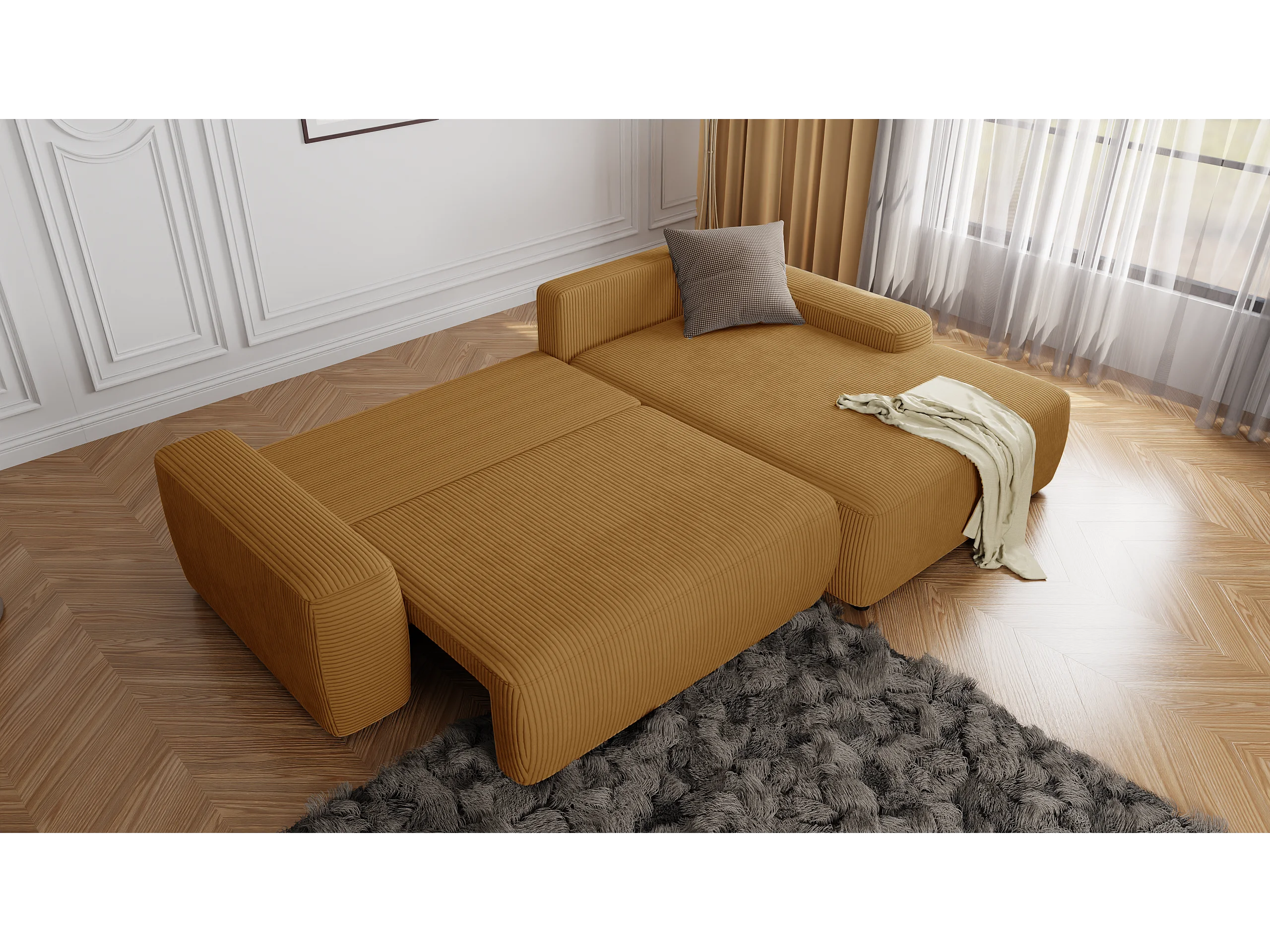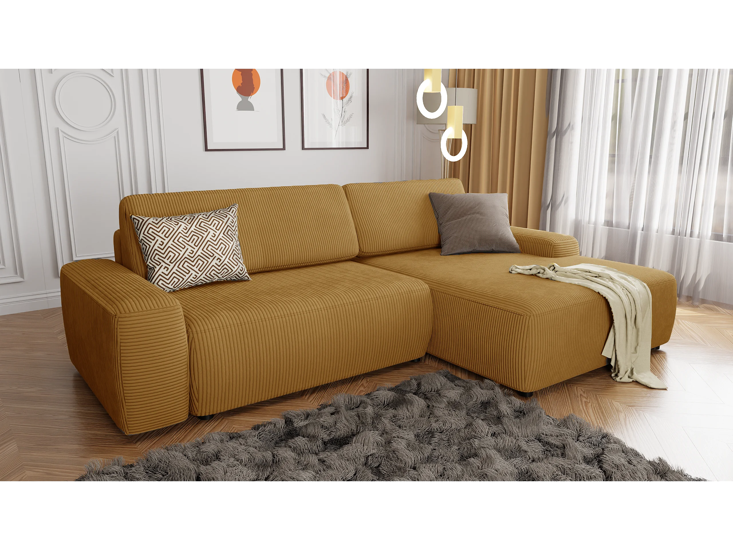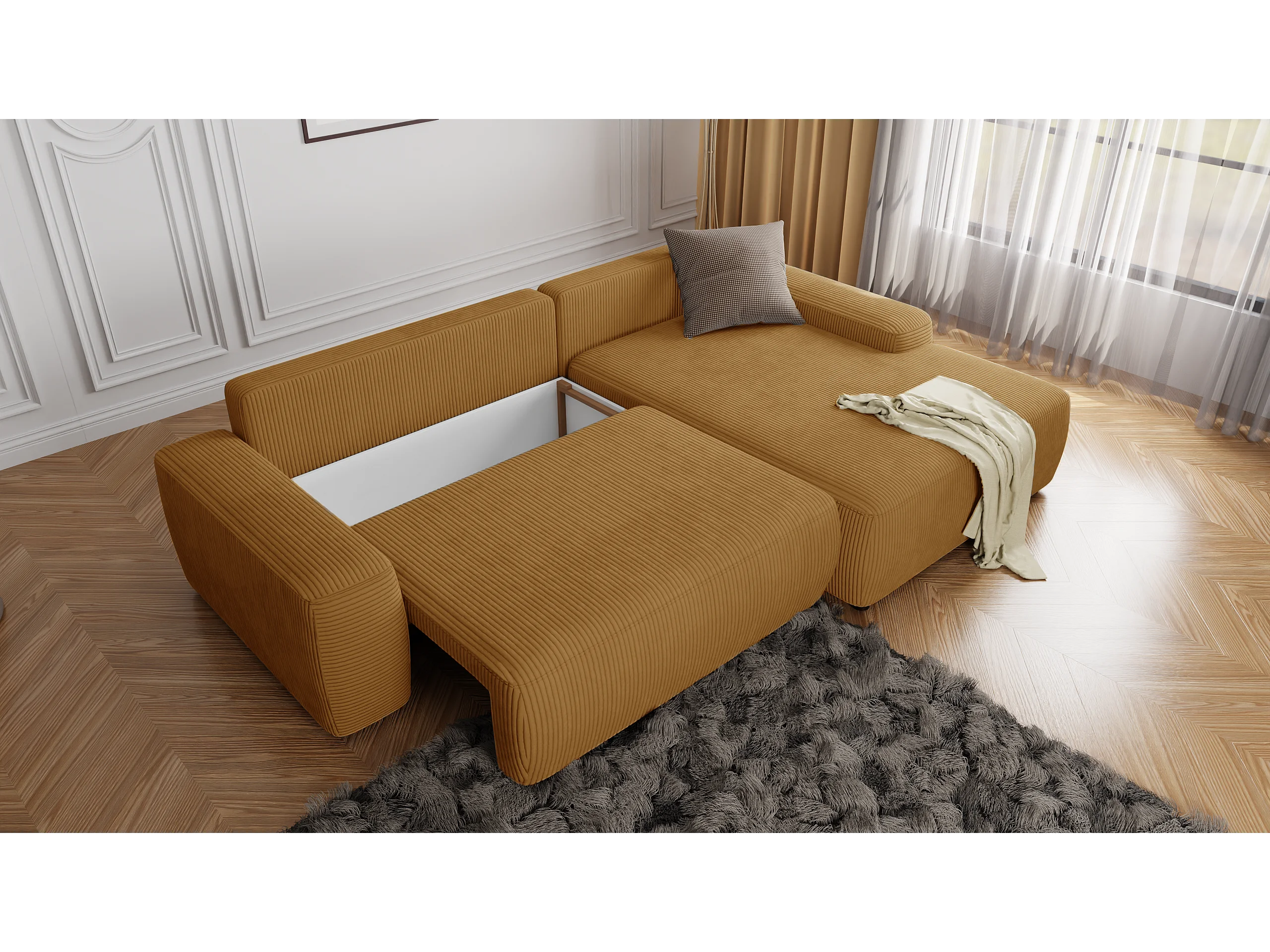 Canapé d’angle avec fonction lit et coffre de rangement en tissu côtelé miel, offrant un agréable confort d’assise EVERLY