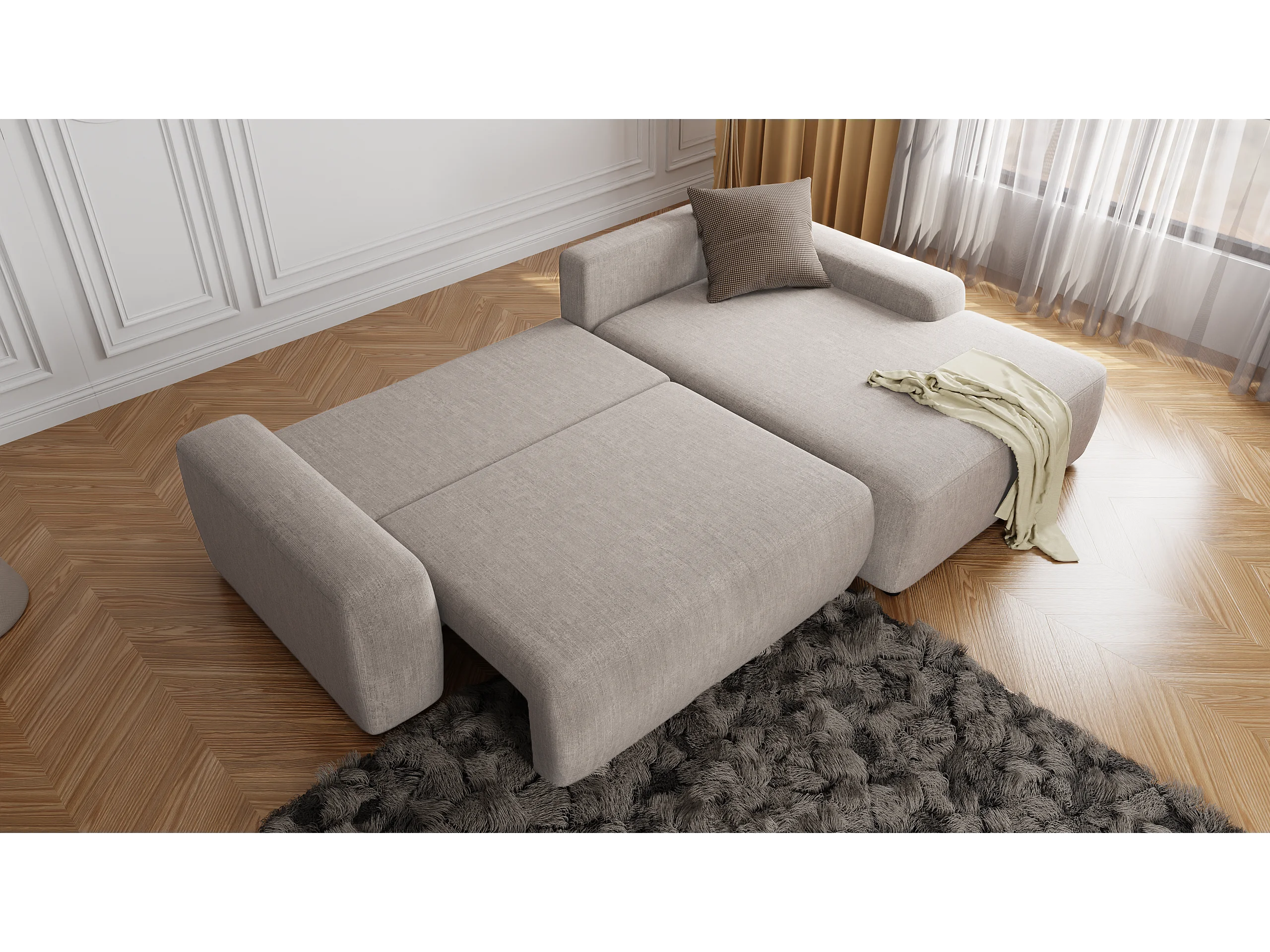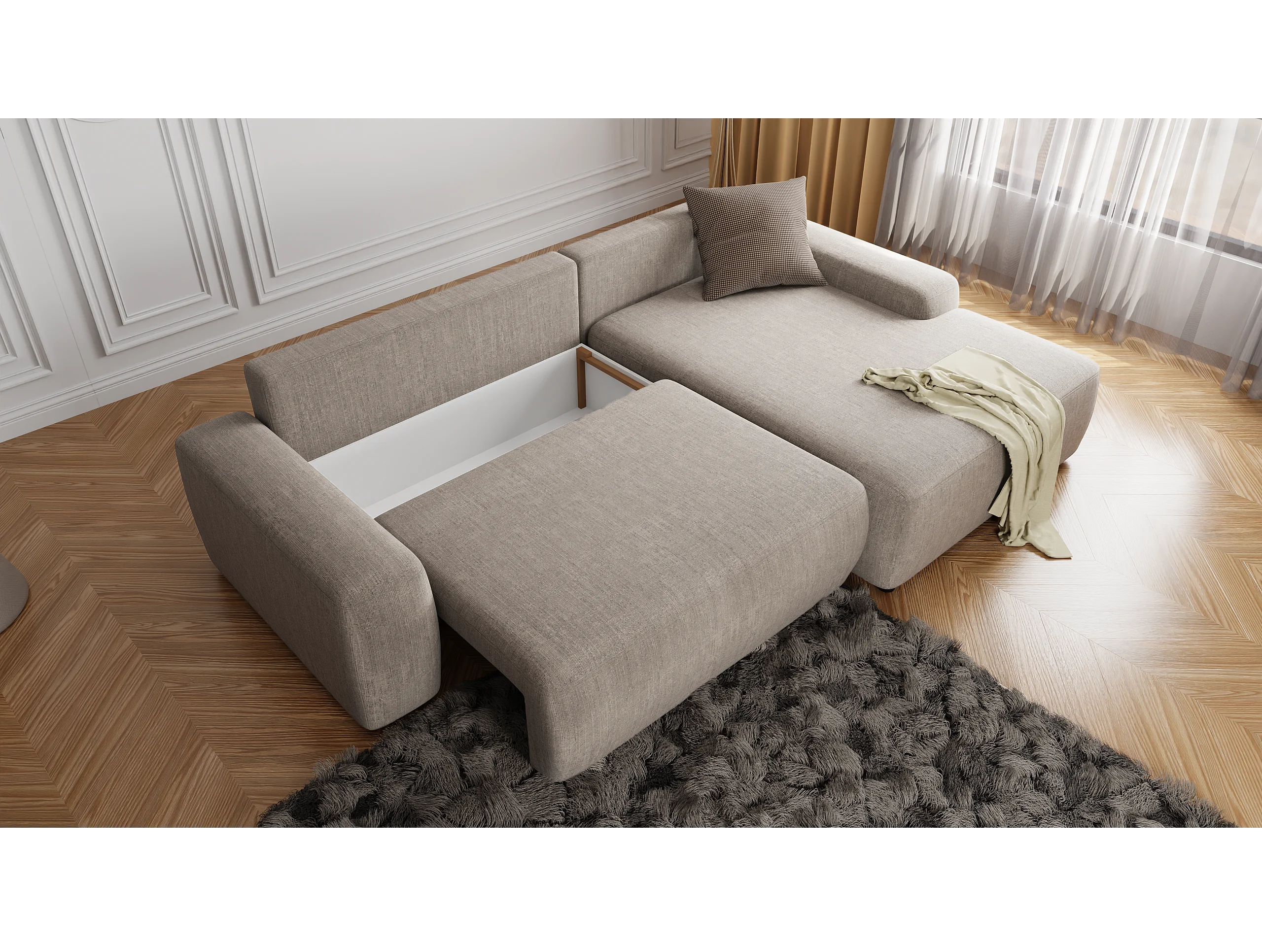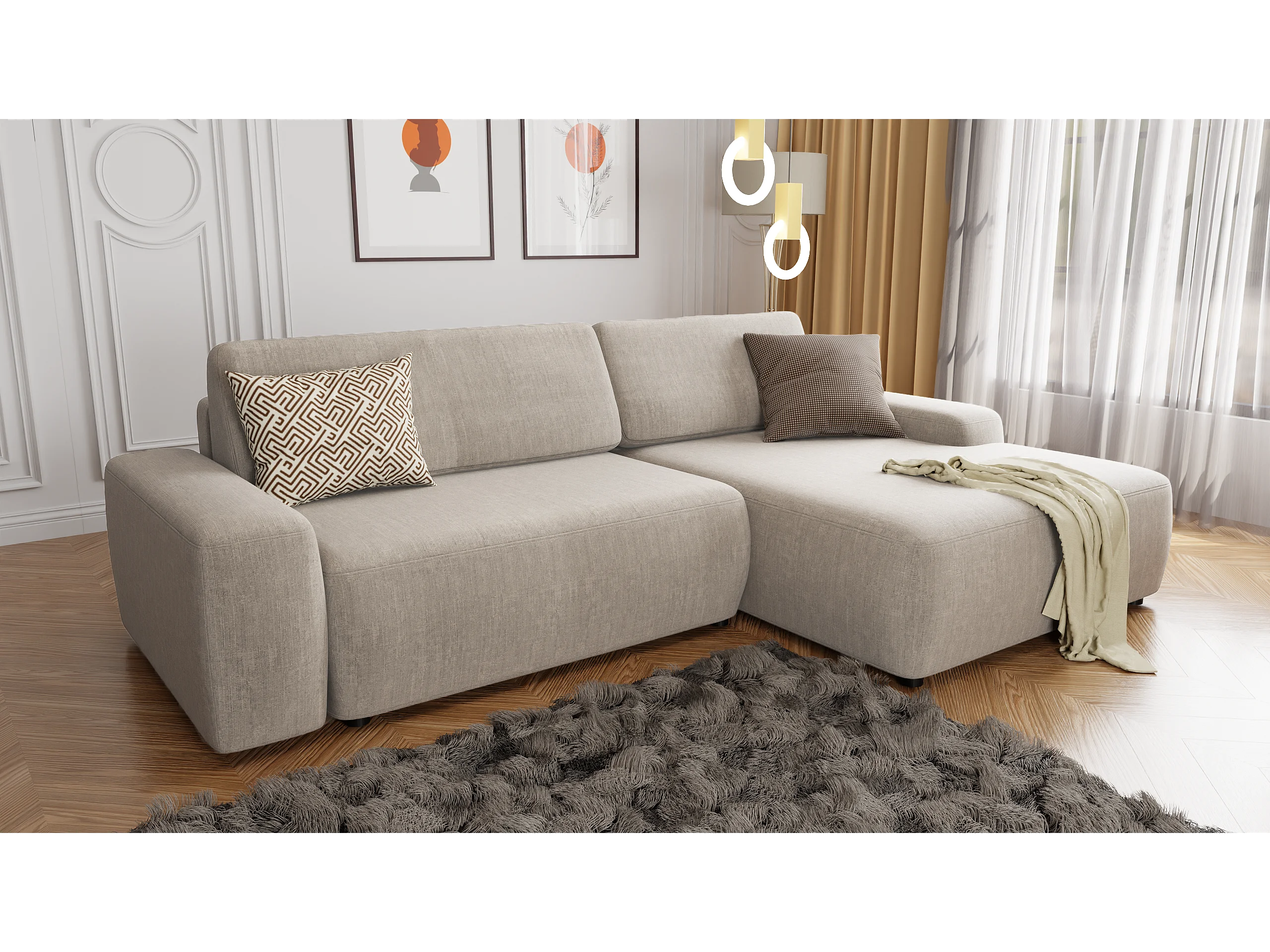Canapé d’angle avec fonction lit et coffre de rangement en tissu velours beige, agréable confort d’assise ALWIN