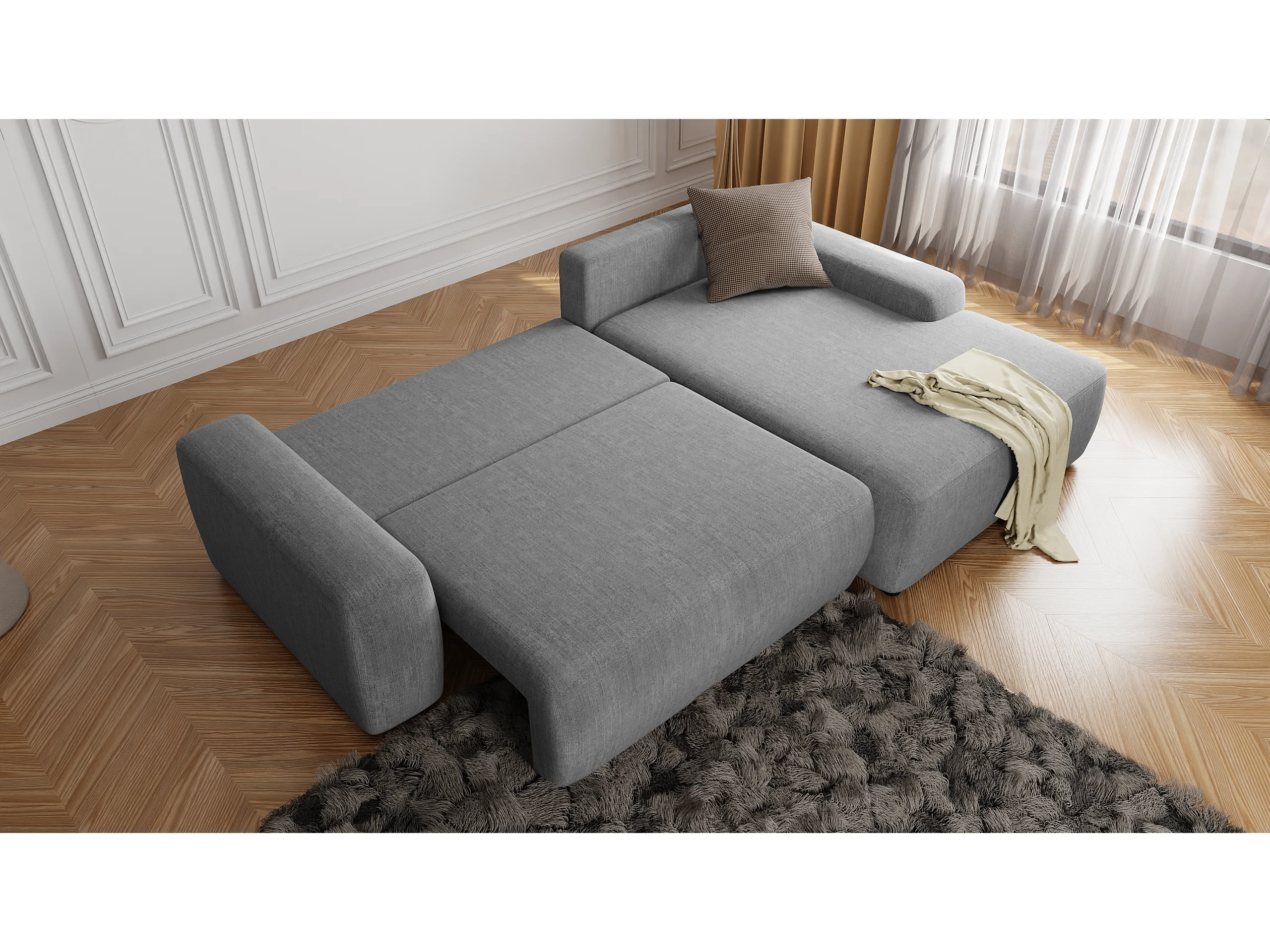 Canapé d’angle avec fonction lit et coffre de rangement en tissu velours gris clair, agréable confort d’assise ALWIN
