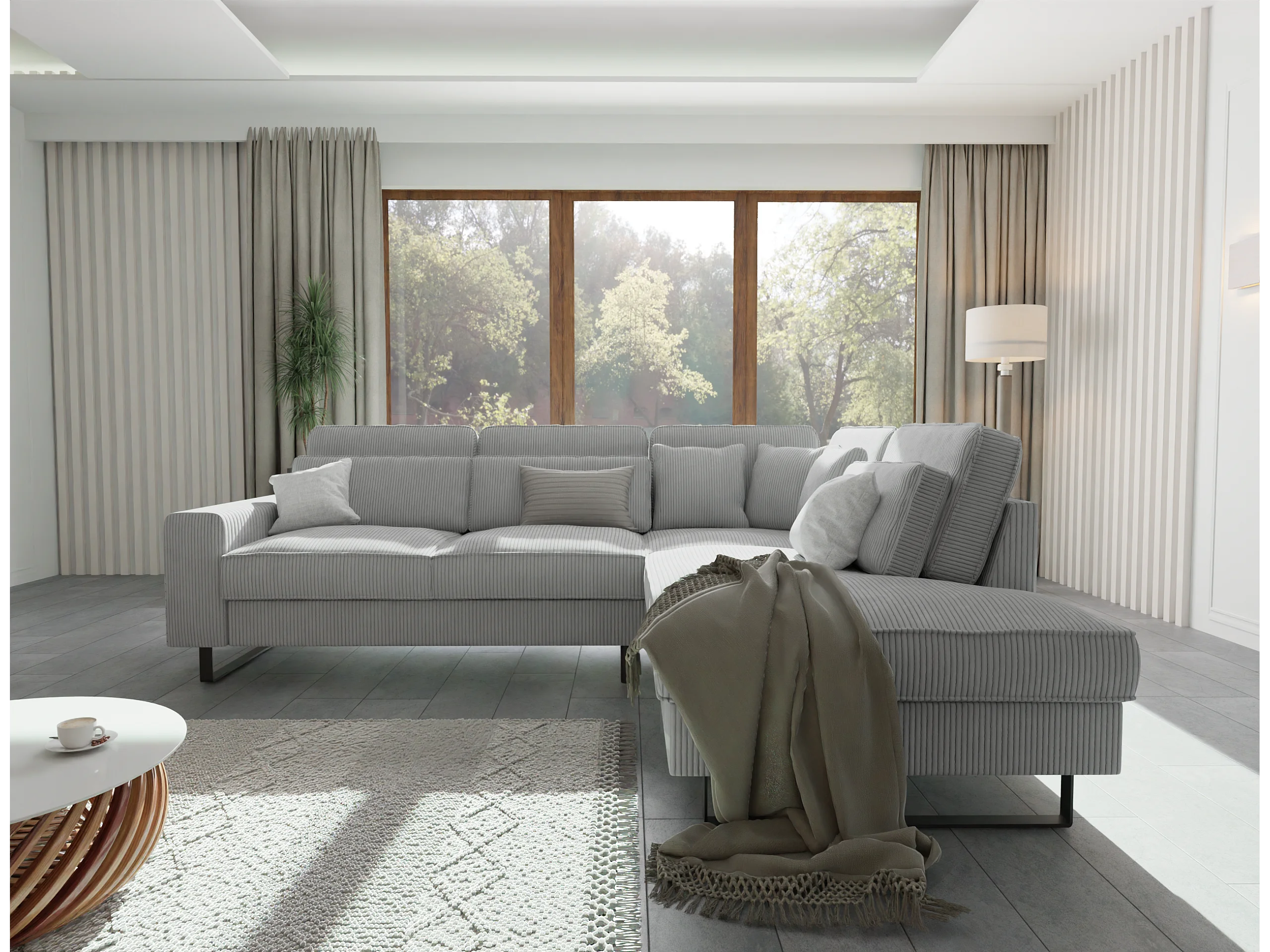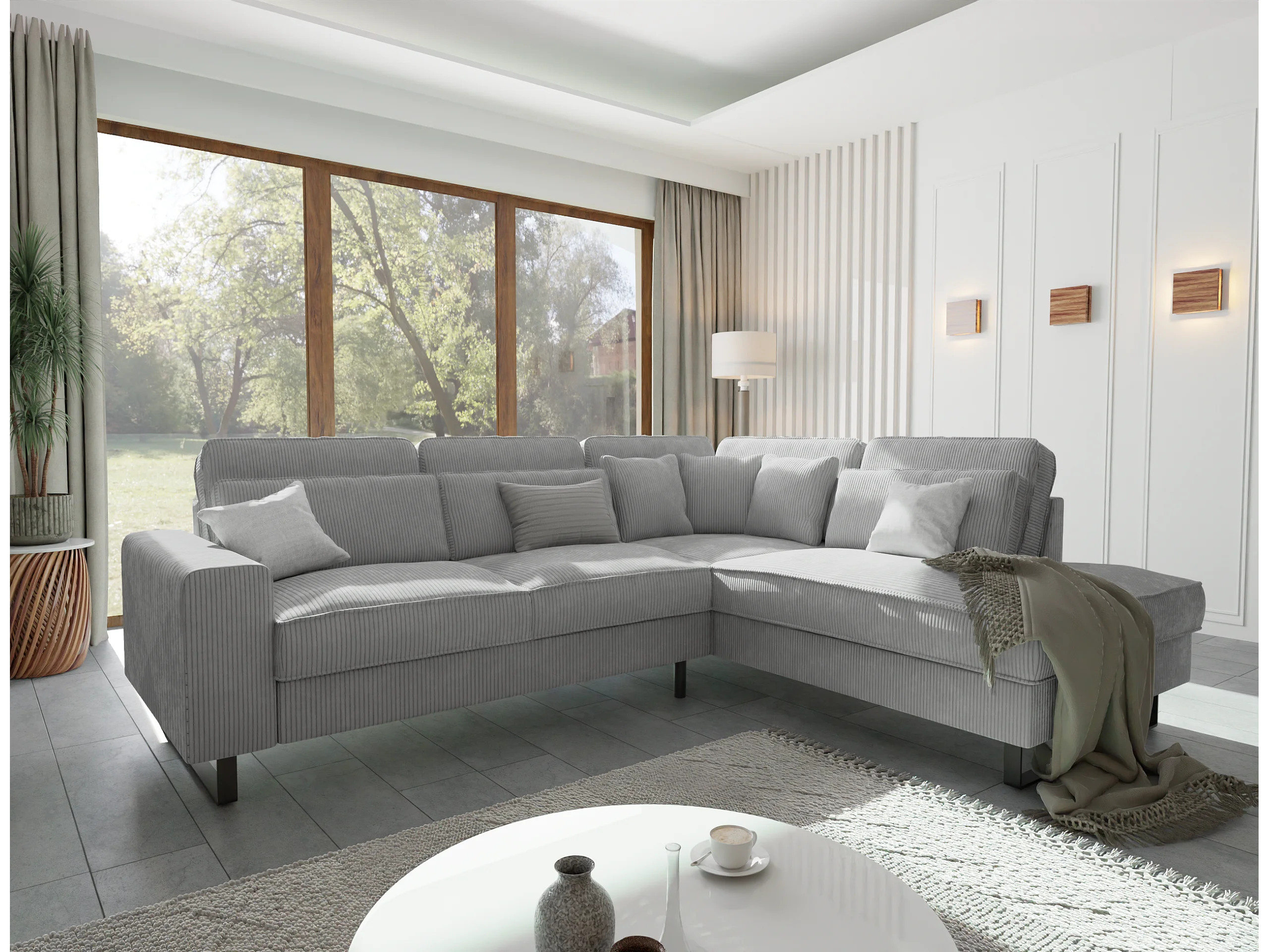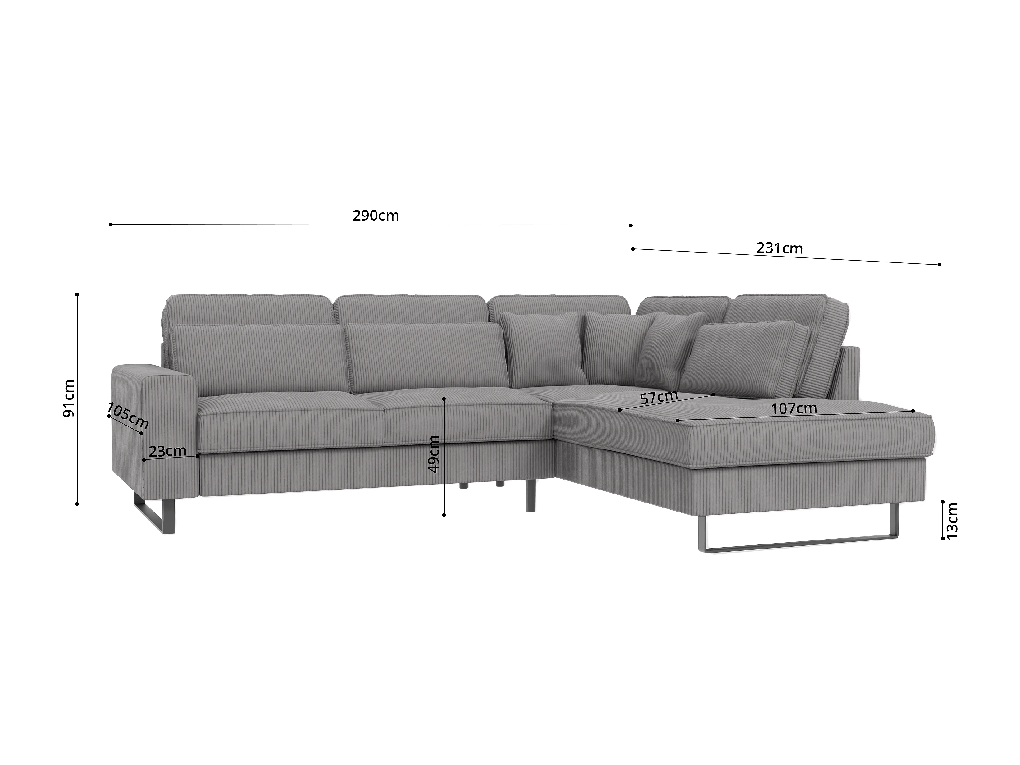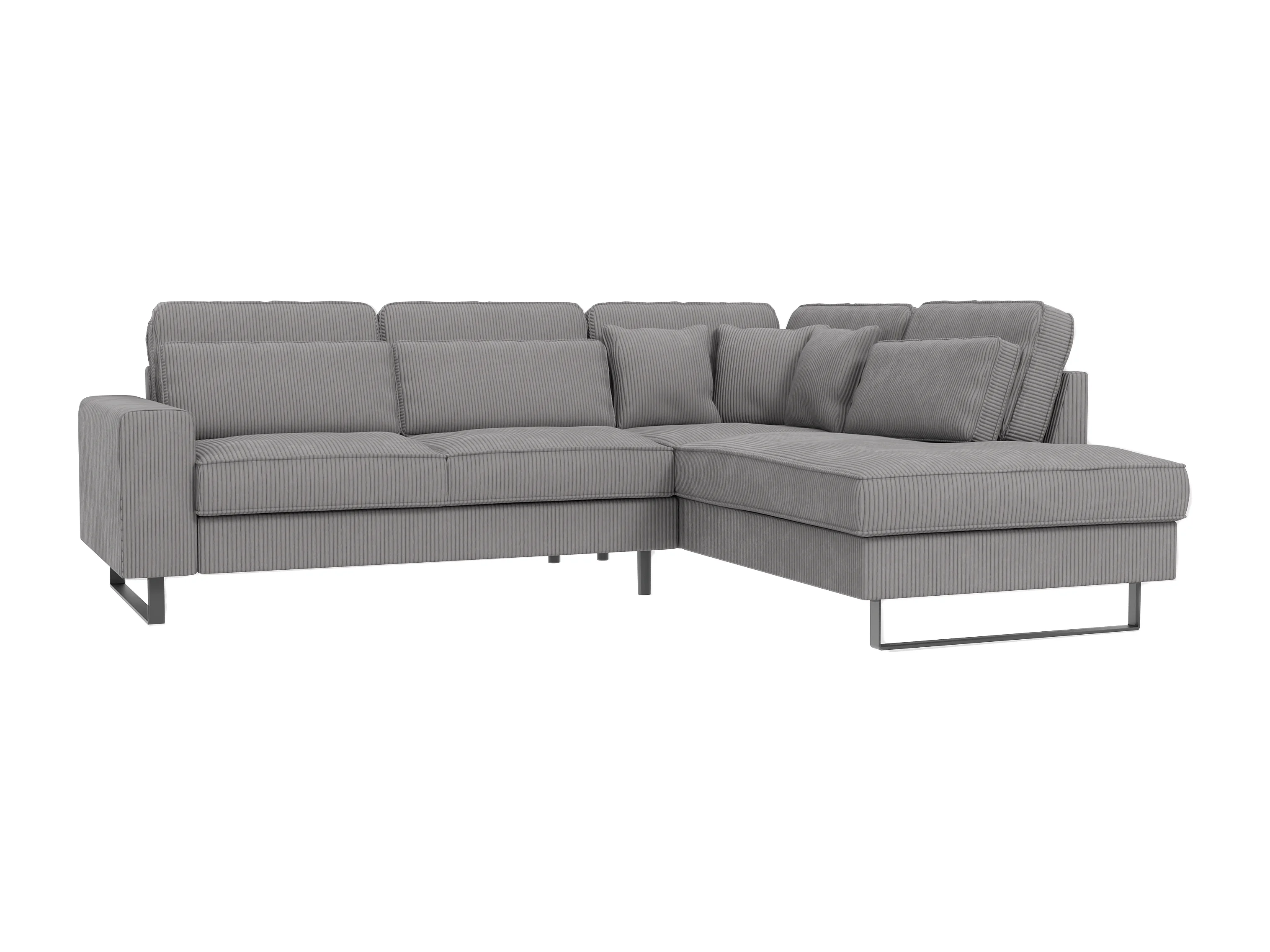 Canapé d’angle avec ottomane et pieds en métal noir, en tissu côtelé gris clair DUSK