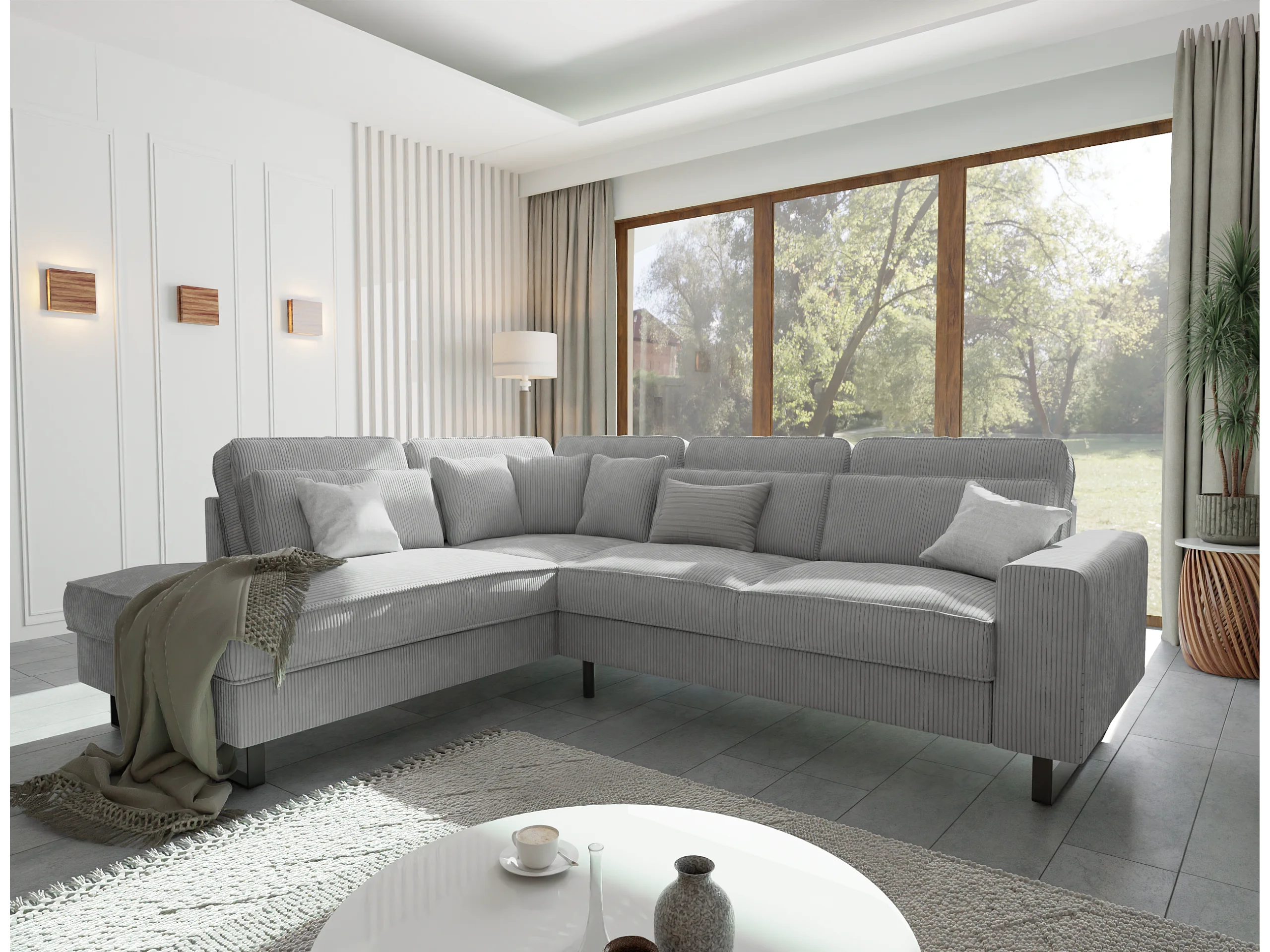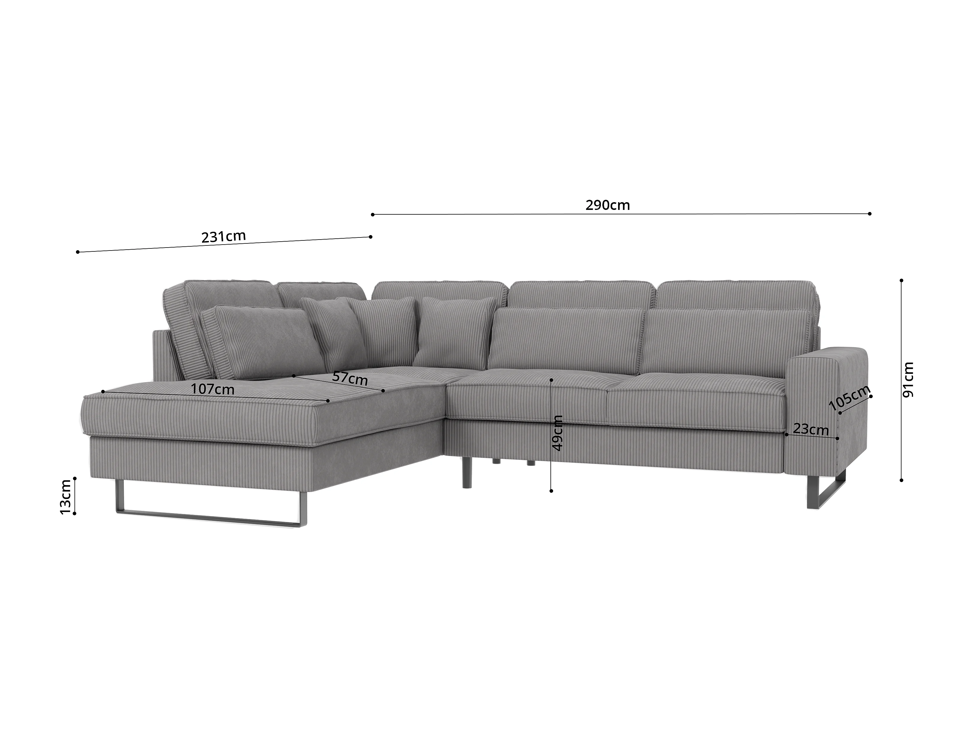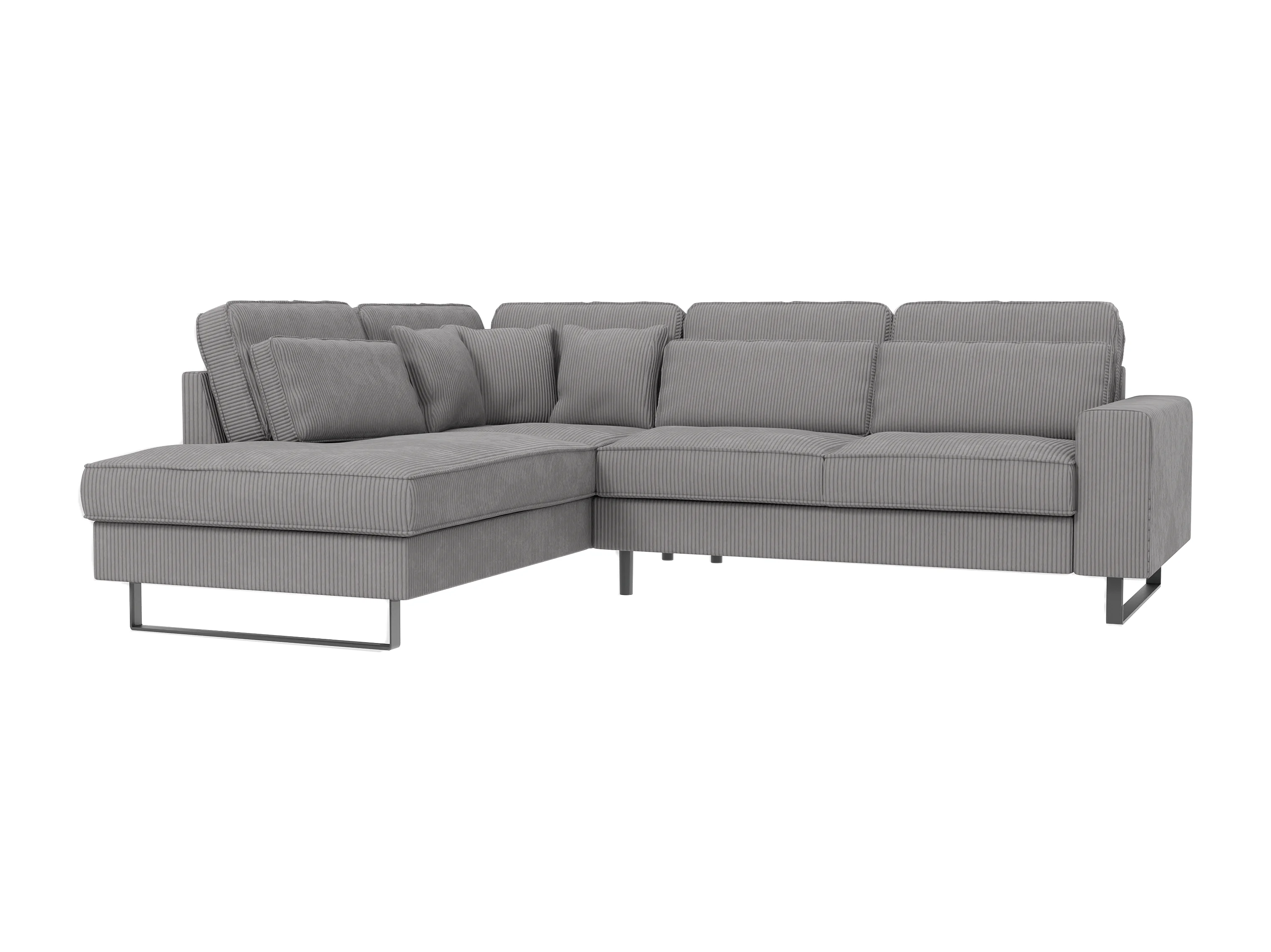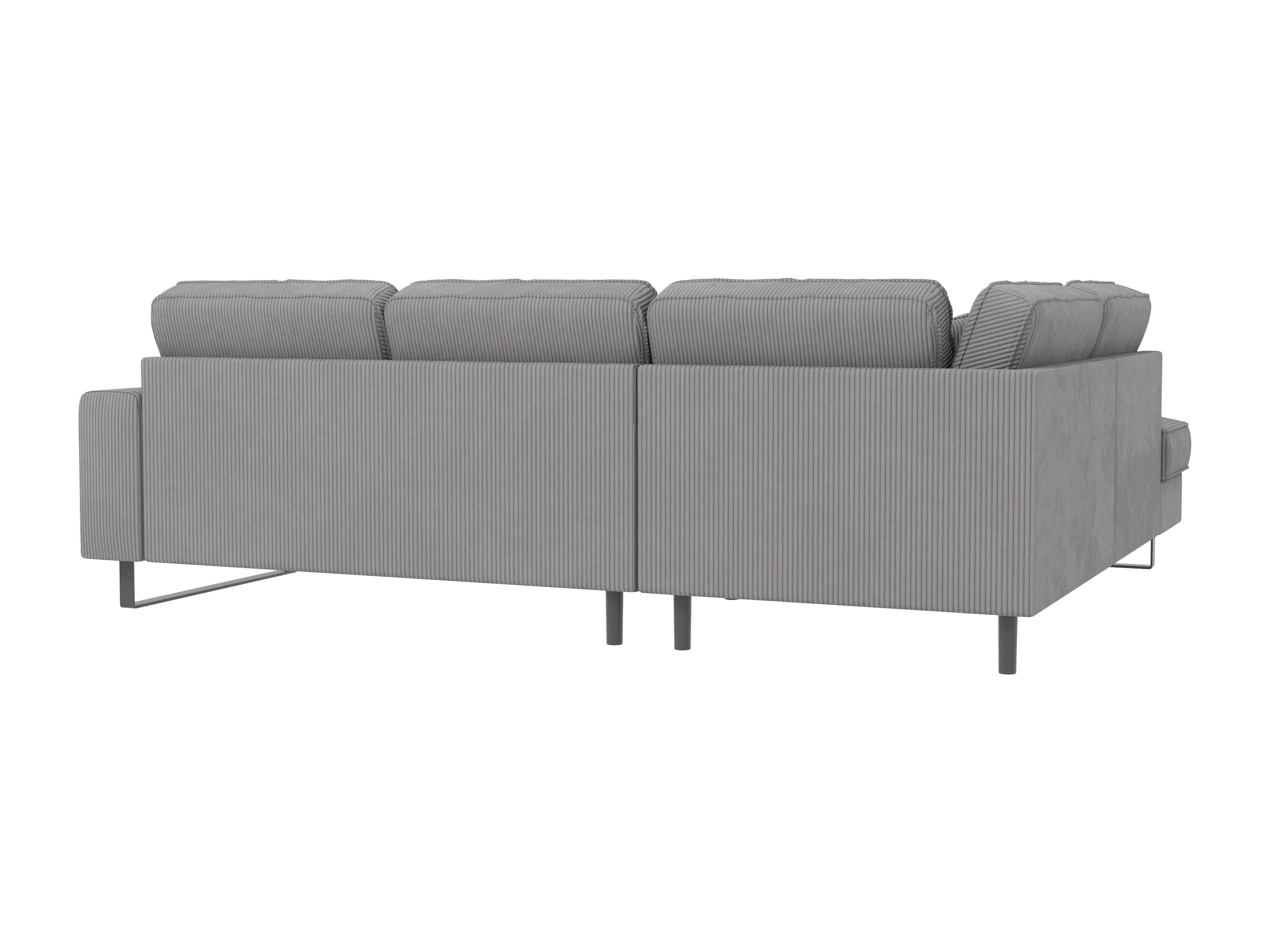 Canapé d’angle avec ottomane et pieds en métal noir, en tissu côtelé gris clair DUSK
