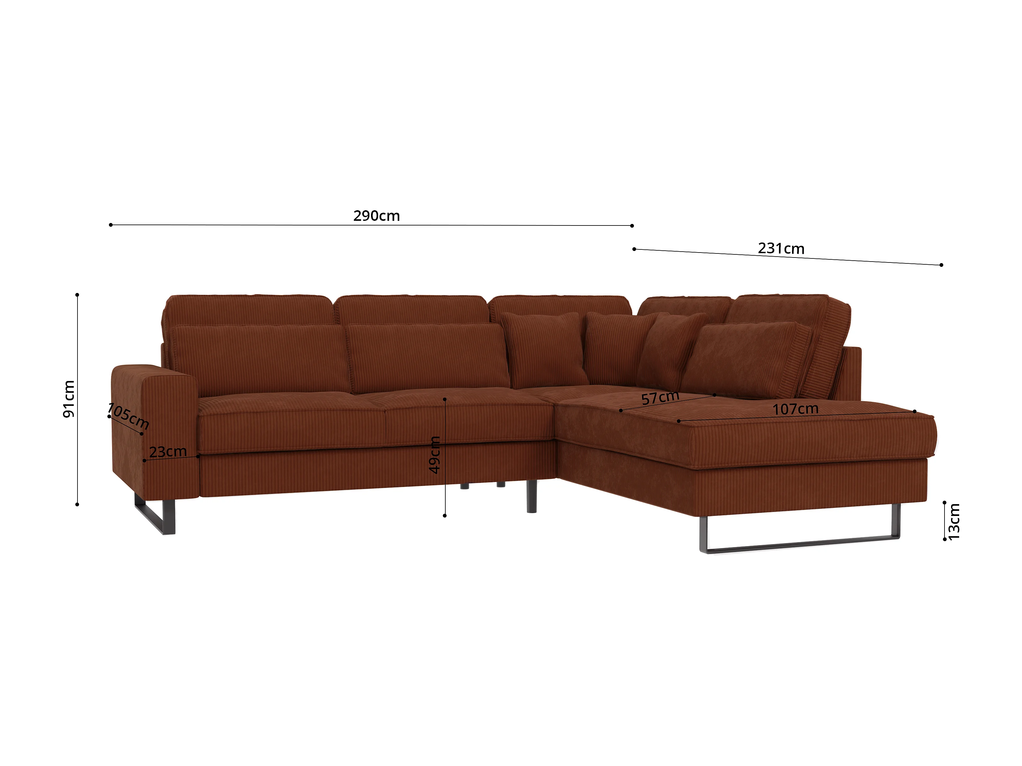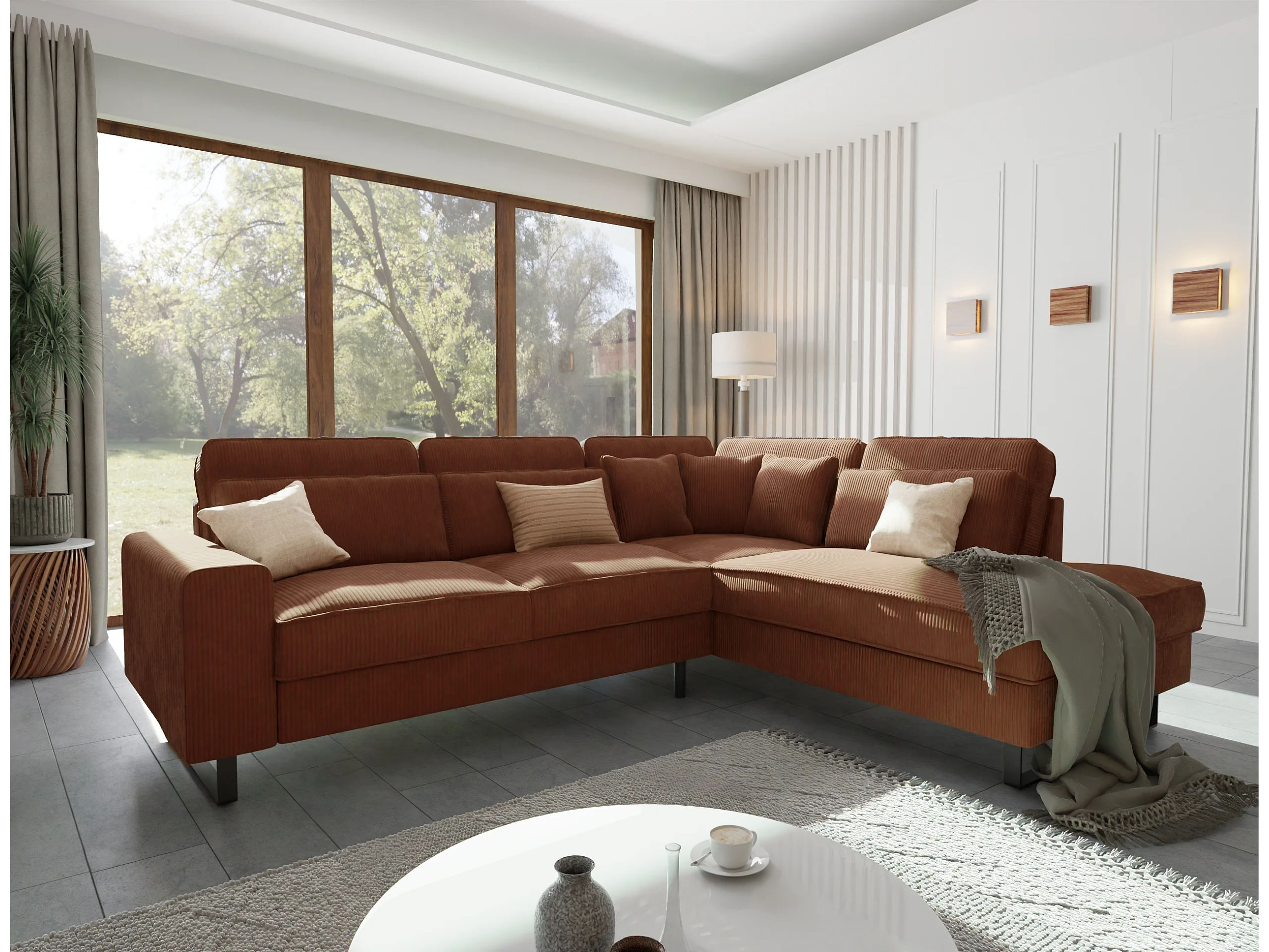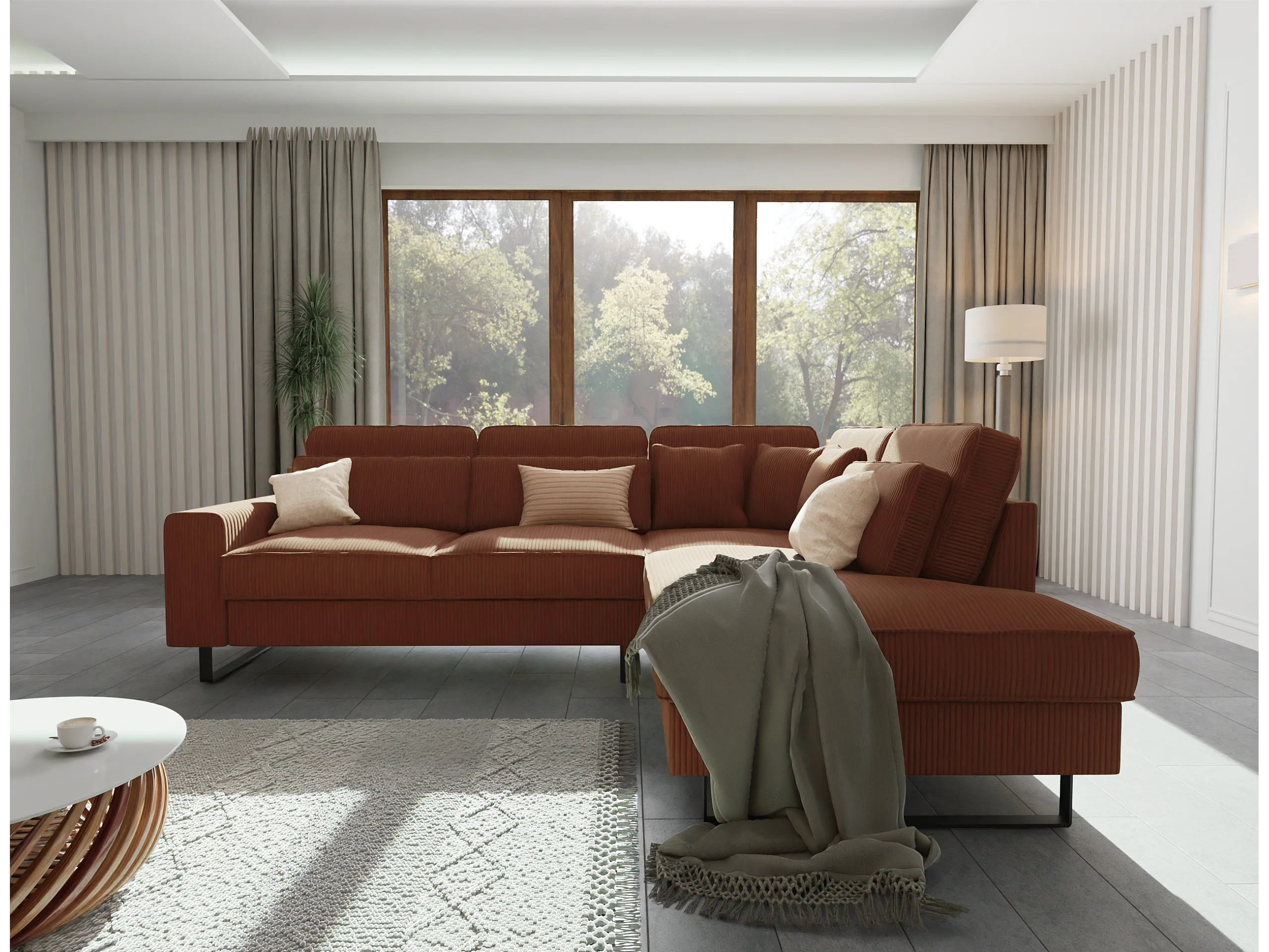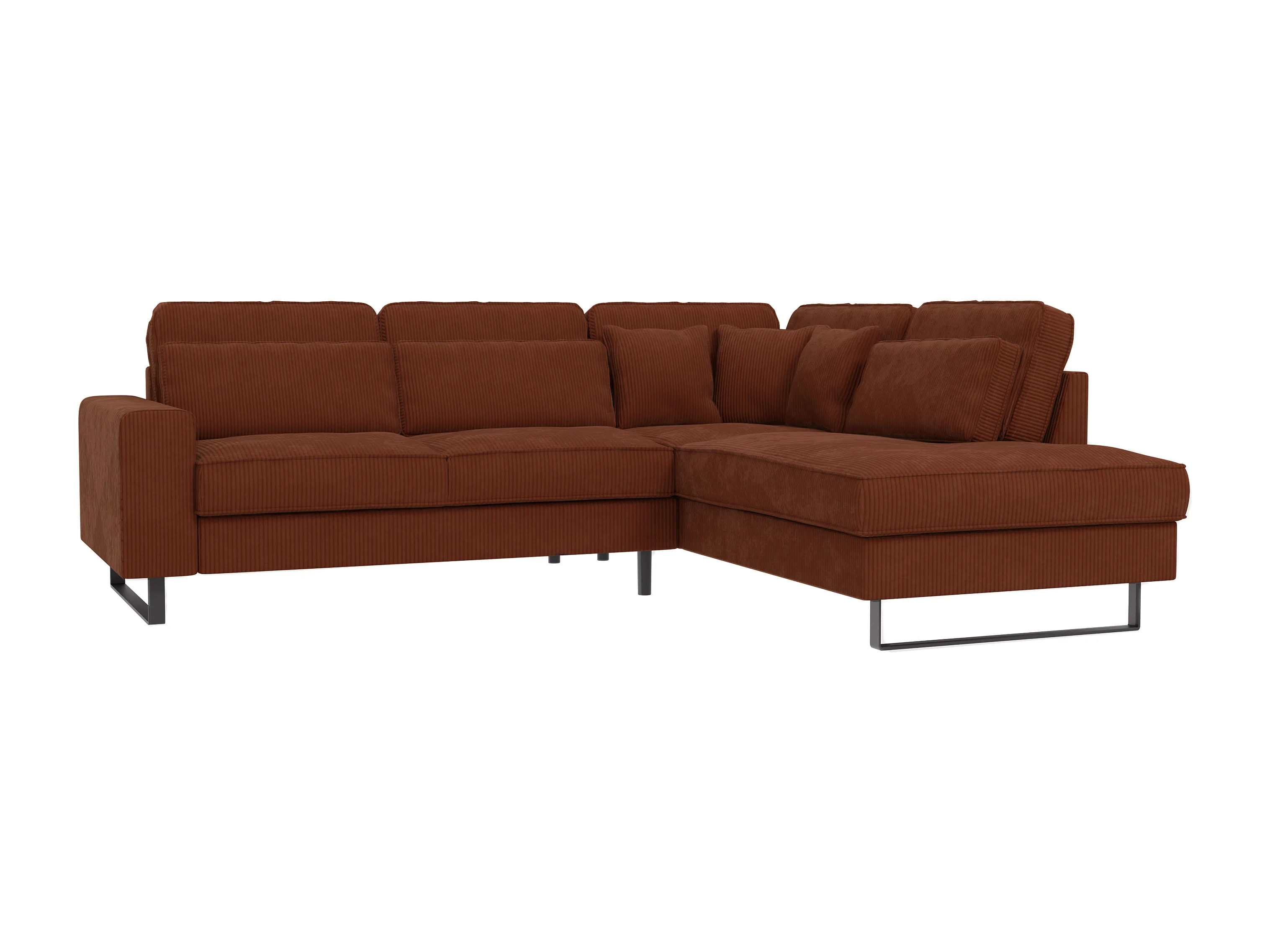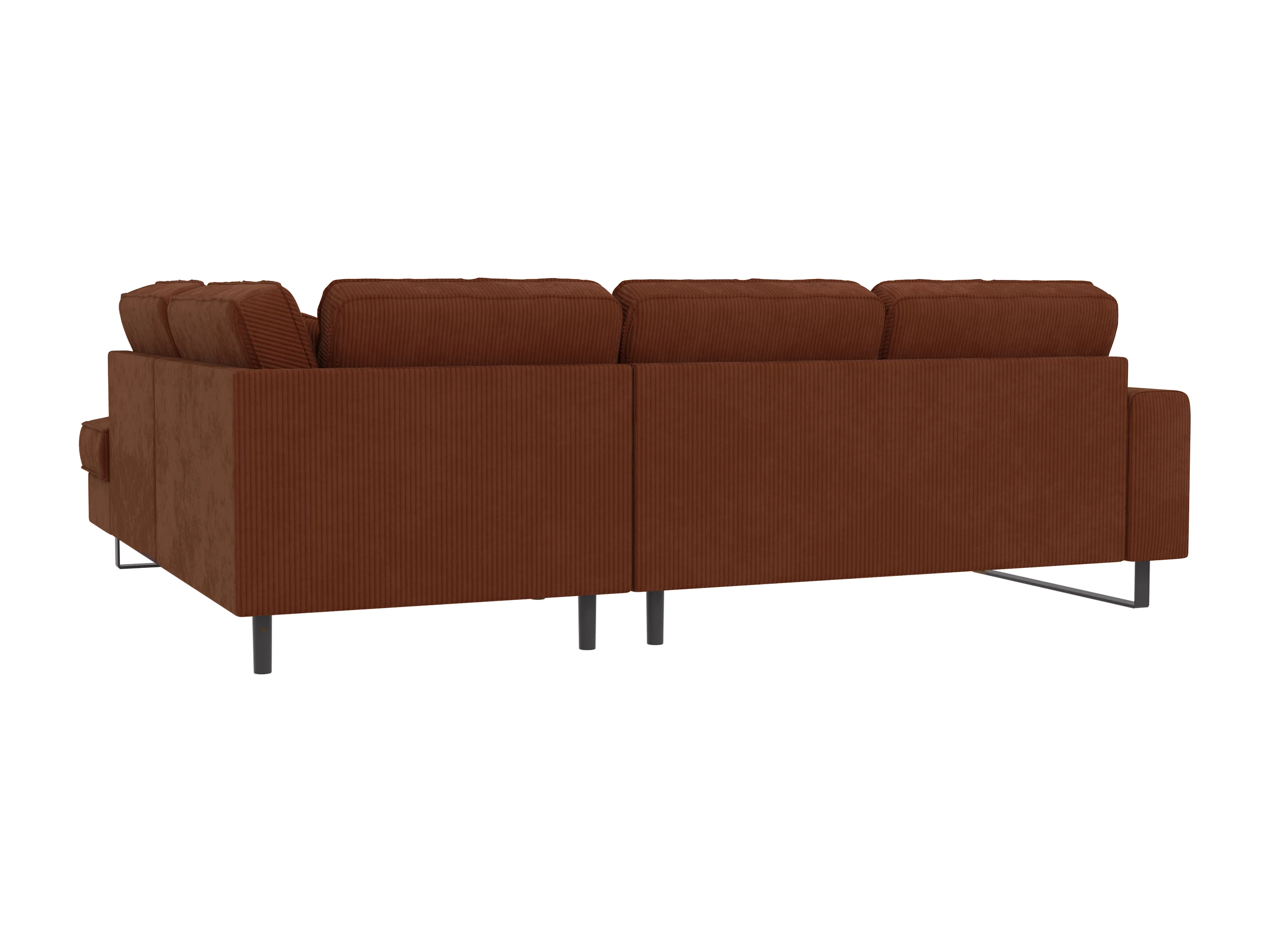 Canapé d’angle avec ottomane et pieds en métal noir, en tissu côtelé terracotta DUSK