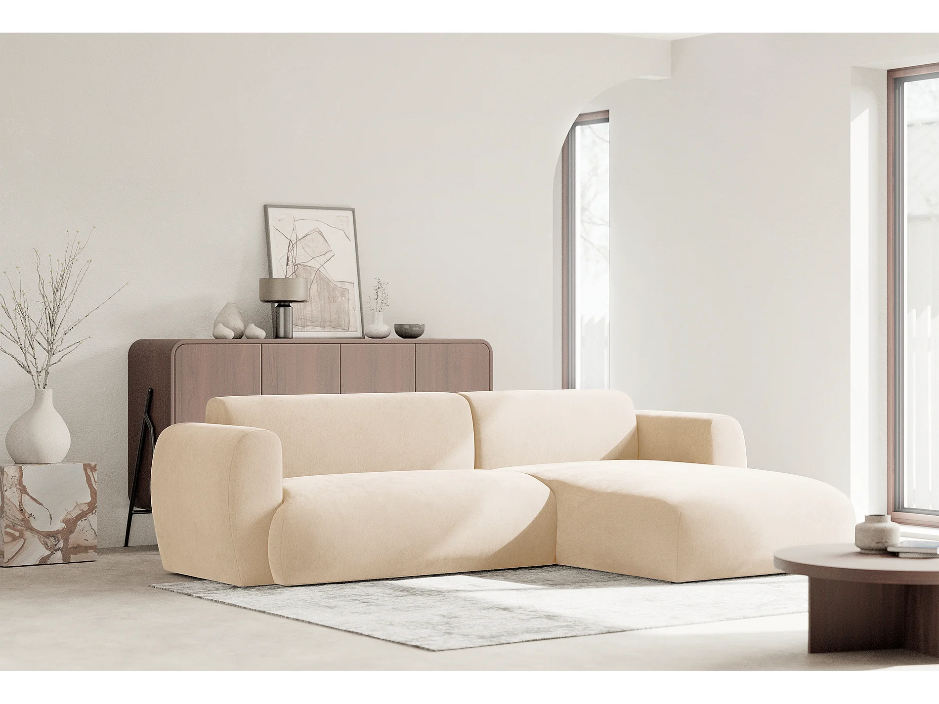 Canapé d’angle avec tissu chenille – couchage – Beige clair – droit – EMIA