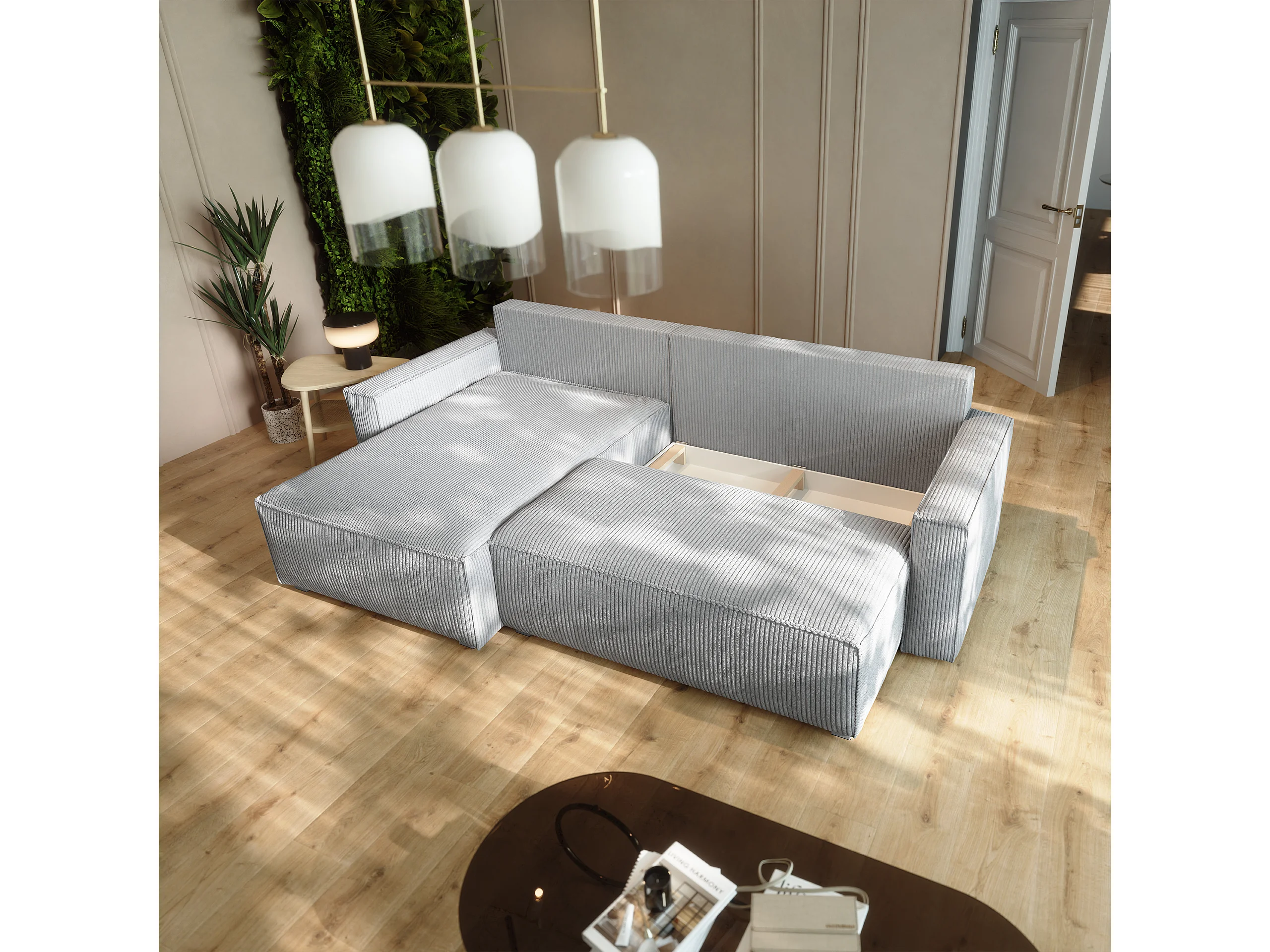 Canapé d'angle BESMIR Gris clair en velours côtelé avec fonction de couchage