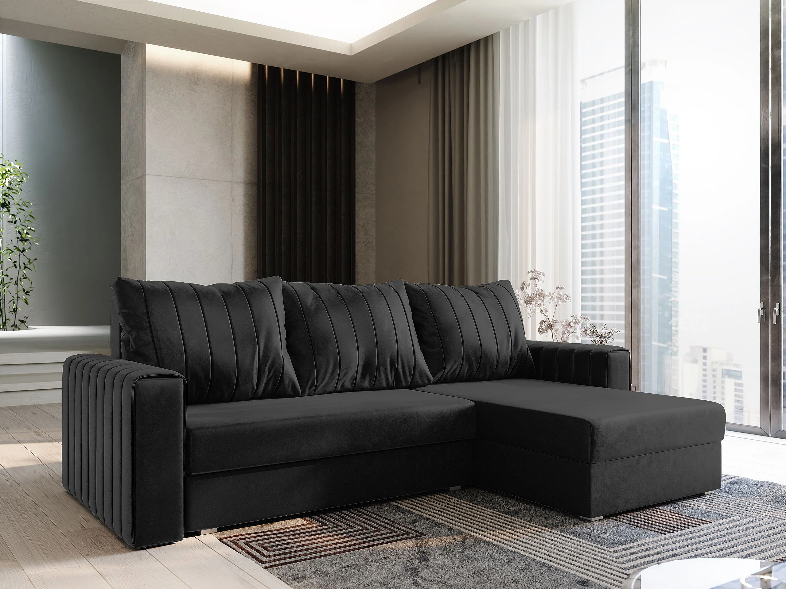 Canapé d'angle CARL Noir en peluche avec fonction de couchage