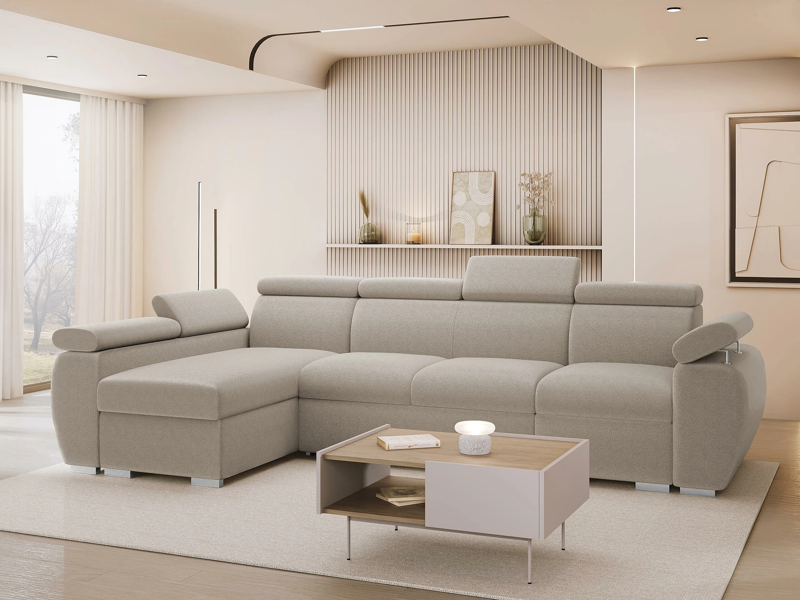 Canapé d'angle Columbus 227, Brun clair, Disponible, 320x170x85cm
