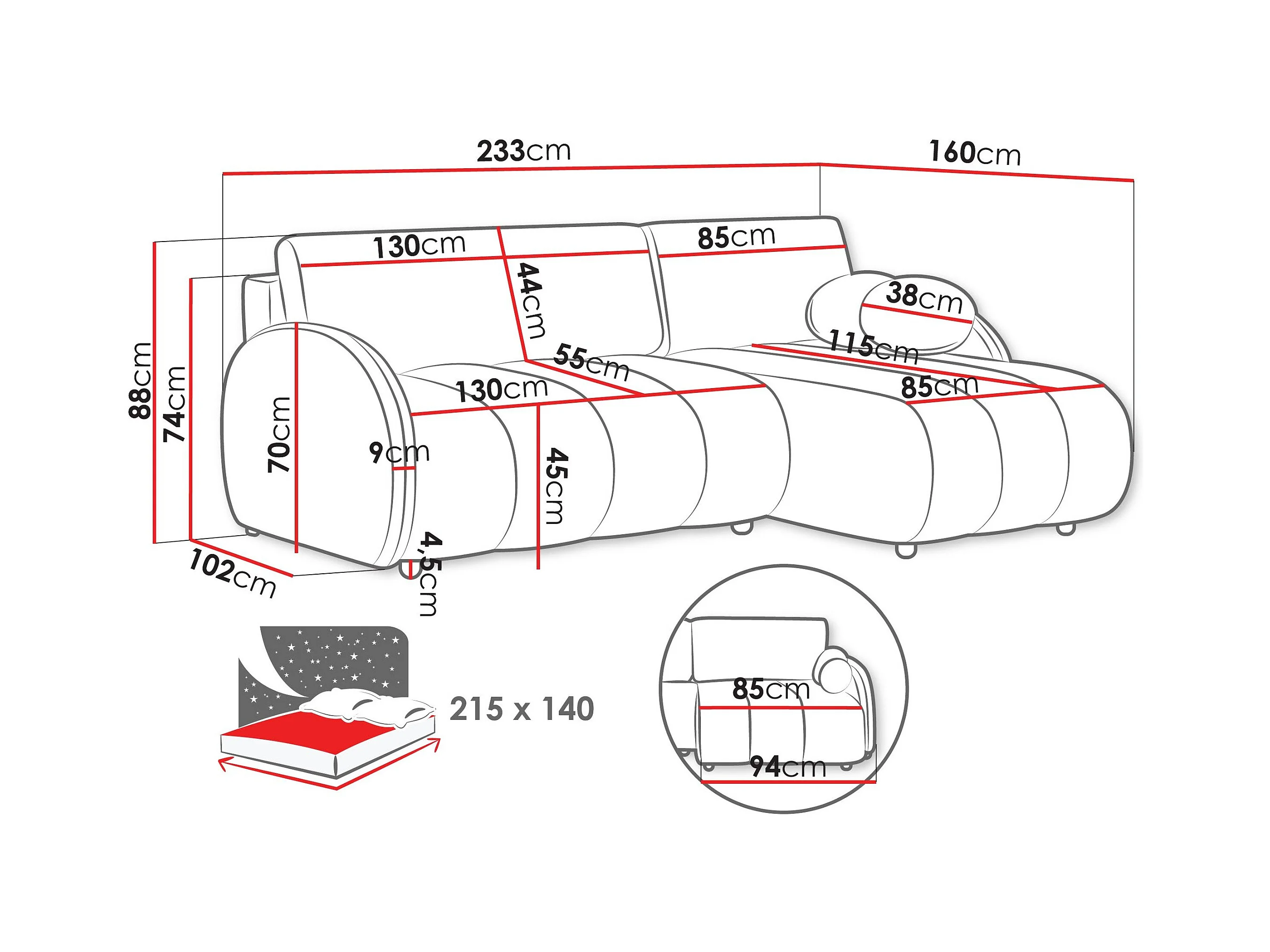 Canapé d'angle Columbus 247, Blanc, Fonction de couchage, Boîte de literie, 233x160x88cm
