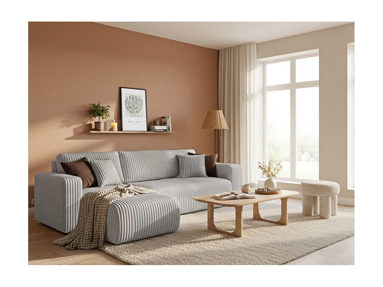Canapé d'angle conv et réversible 4p ALYA velours cotelé épais Gris clair