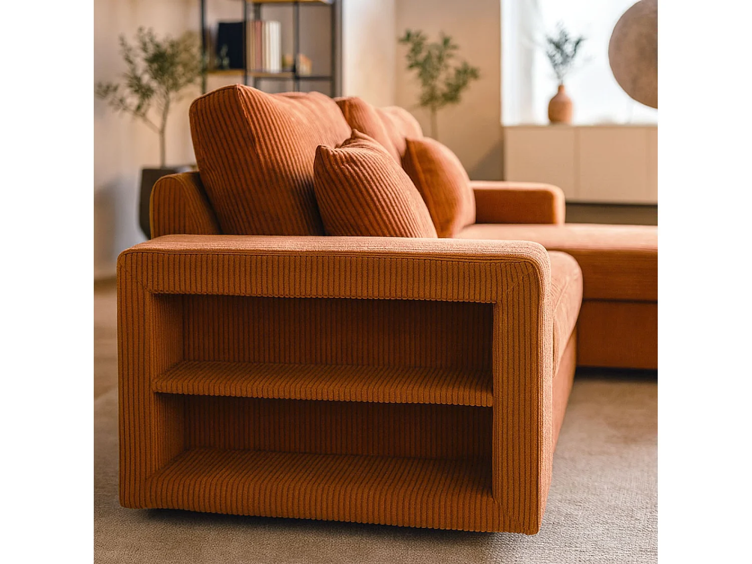 Canapé d'angle convertible 4 places avec coffre en velours côtelé terracotta GLASGOW
