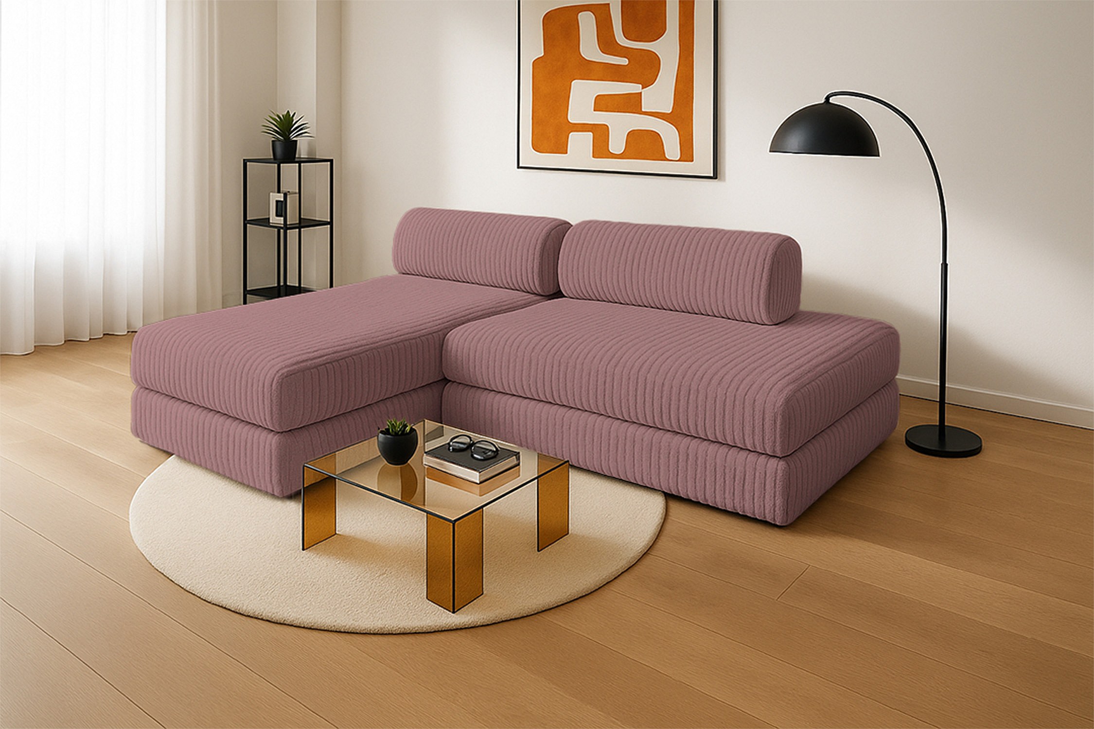 Canapé d'angle modulable et convertible 5 places - Velours côtelé XL - Rose
